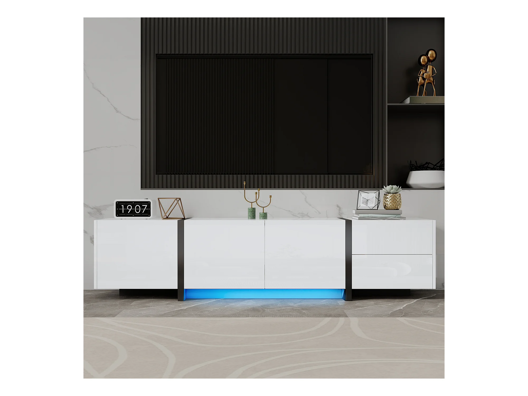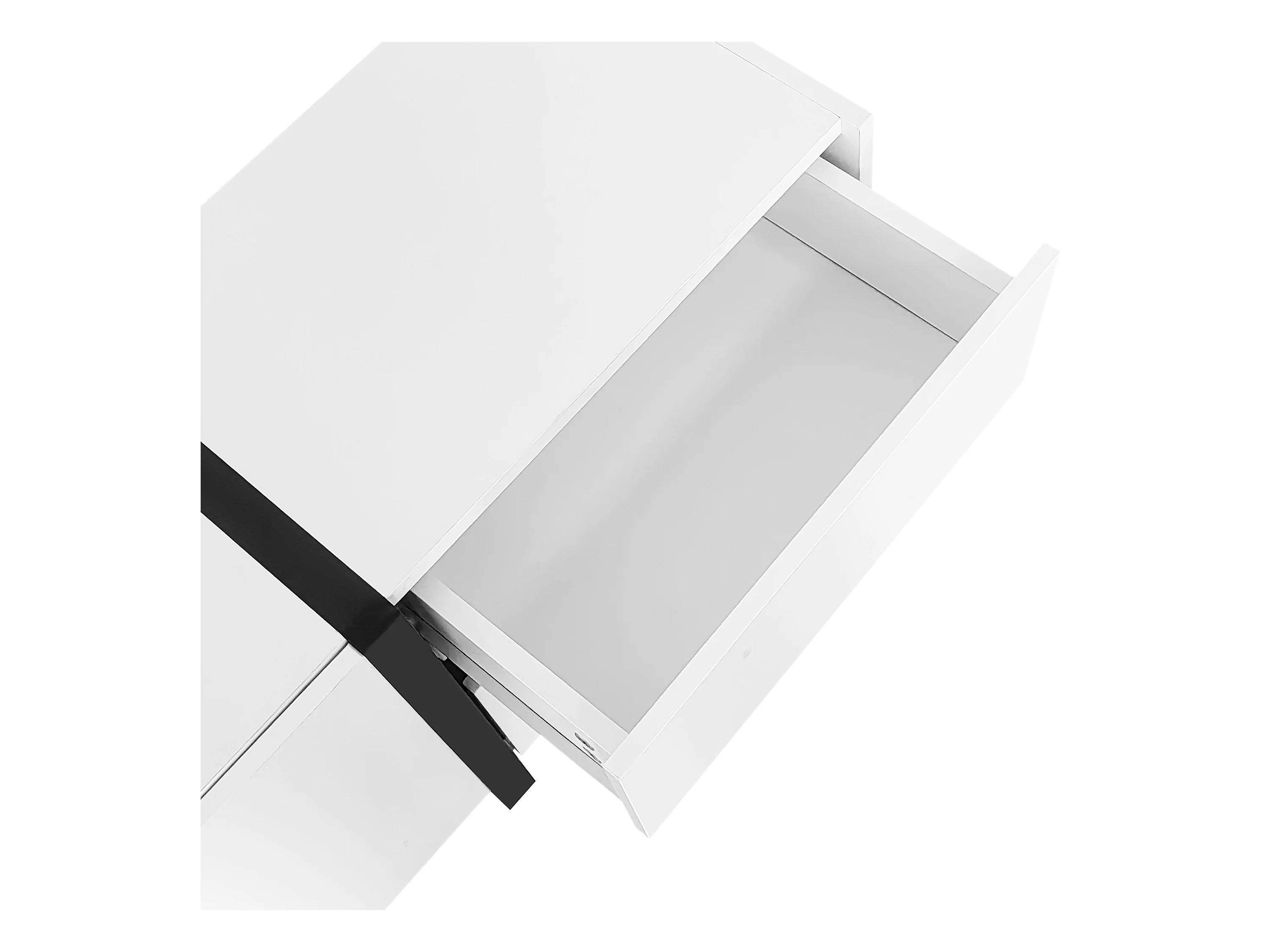 Meuble TV, lowboard, armoire laquée blanche avec pieds de table noirs, portes simples et tiroirs, design moderne et élégant pour le salon.