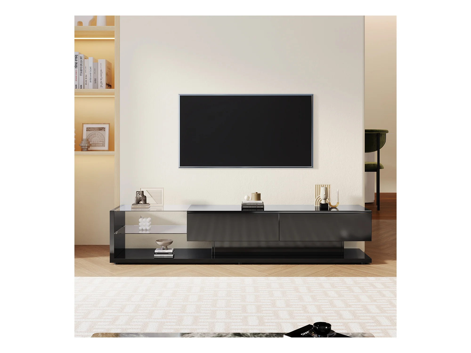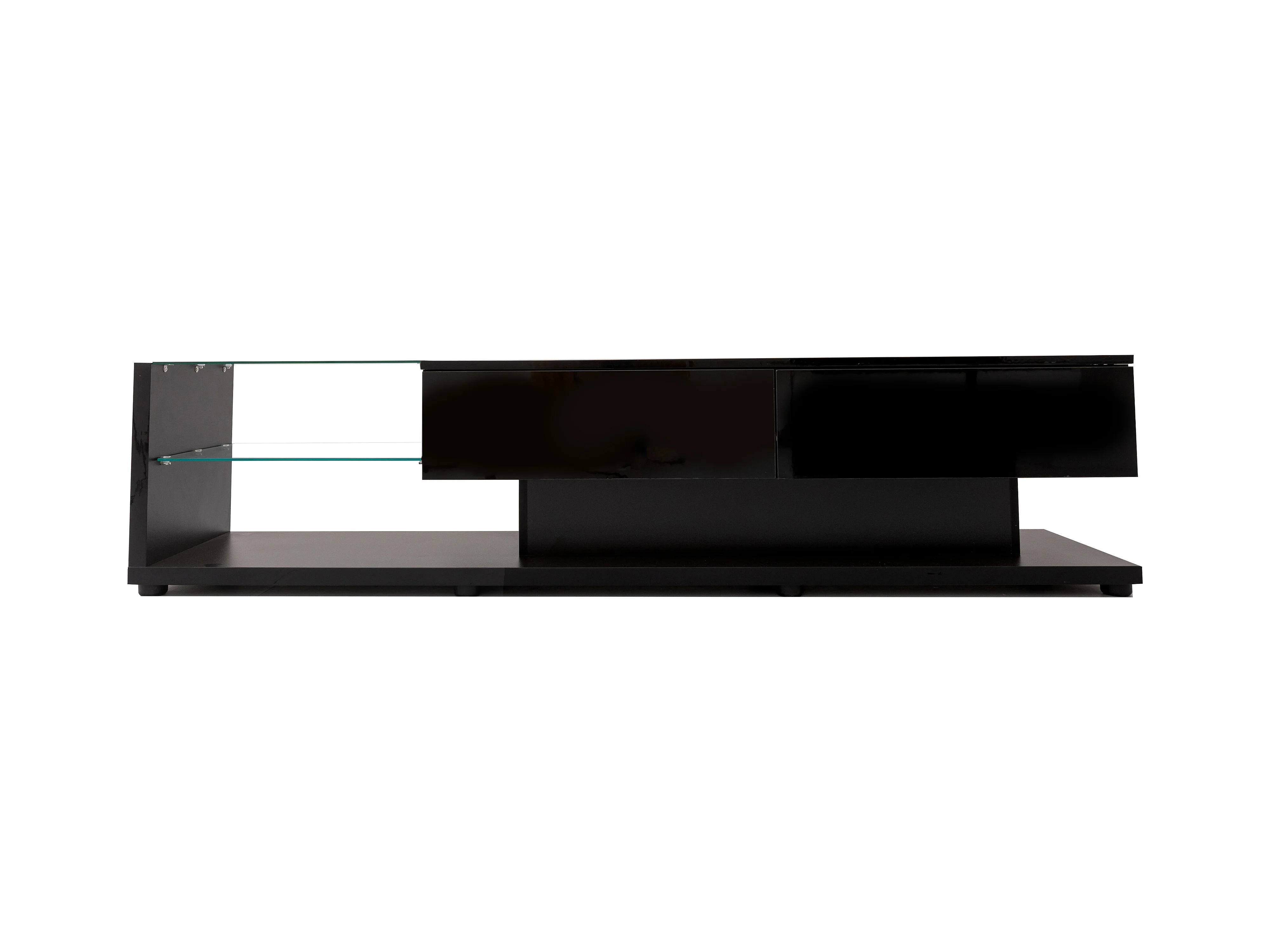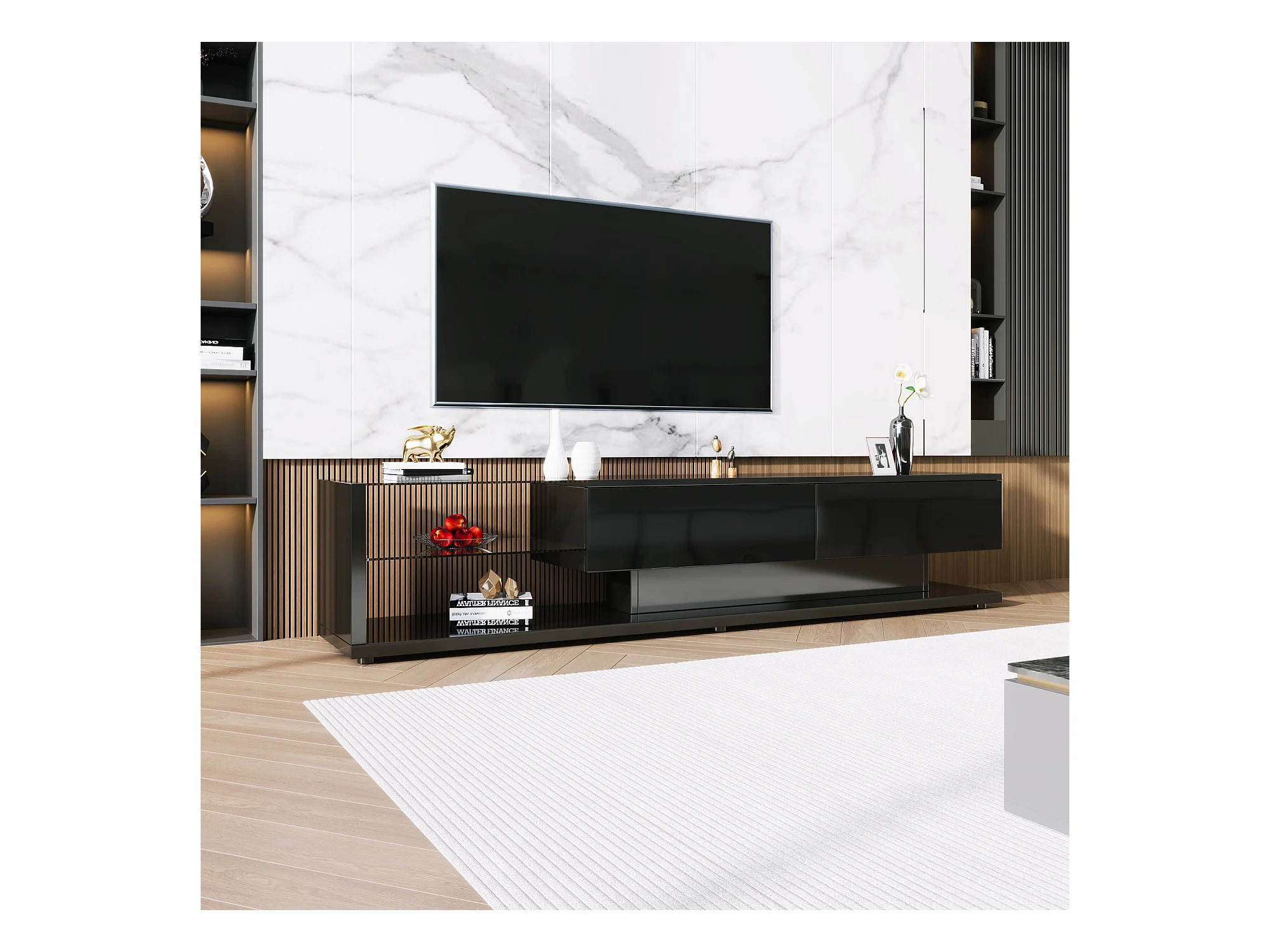 Meuble TV/Lowboard blanc brillant avec cloisons en verre et LED réglable. Allie style rustique naturel et design moderne pour un salon harmonieux.