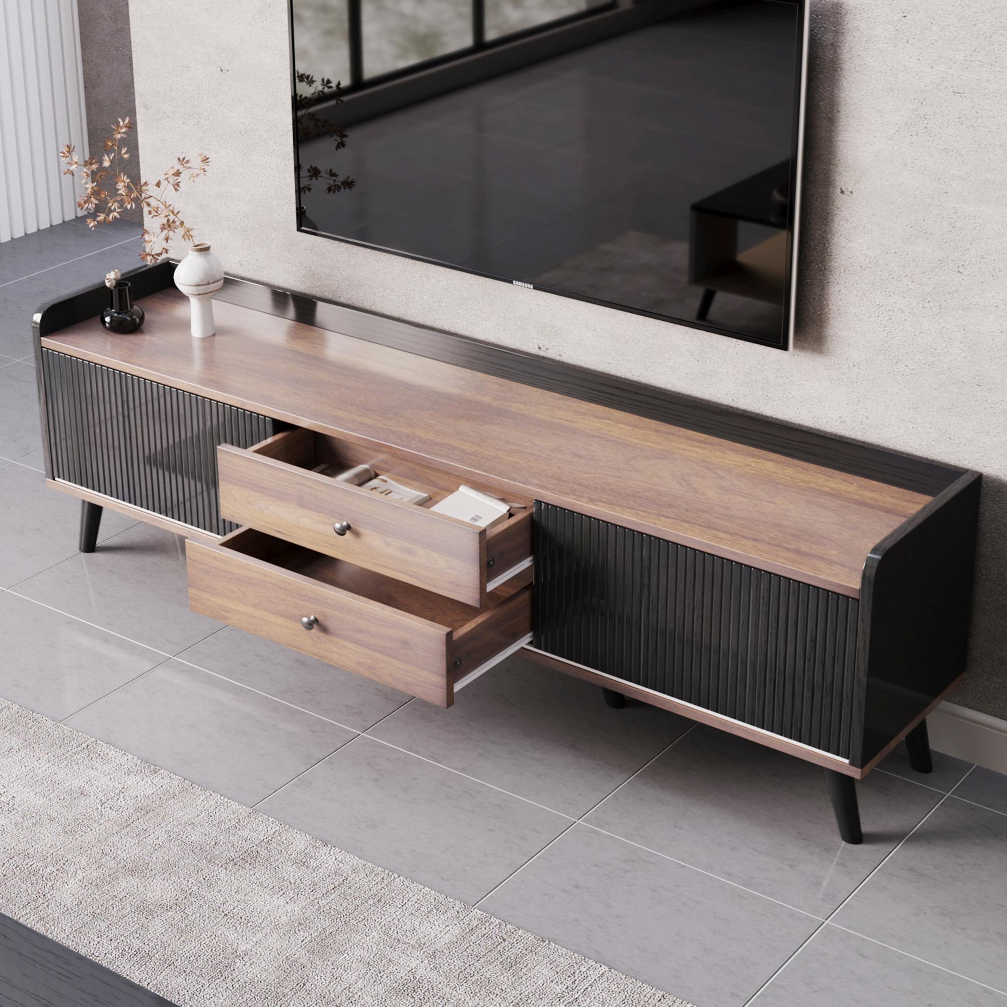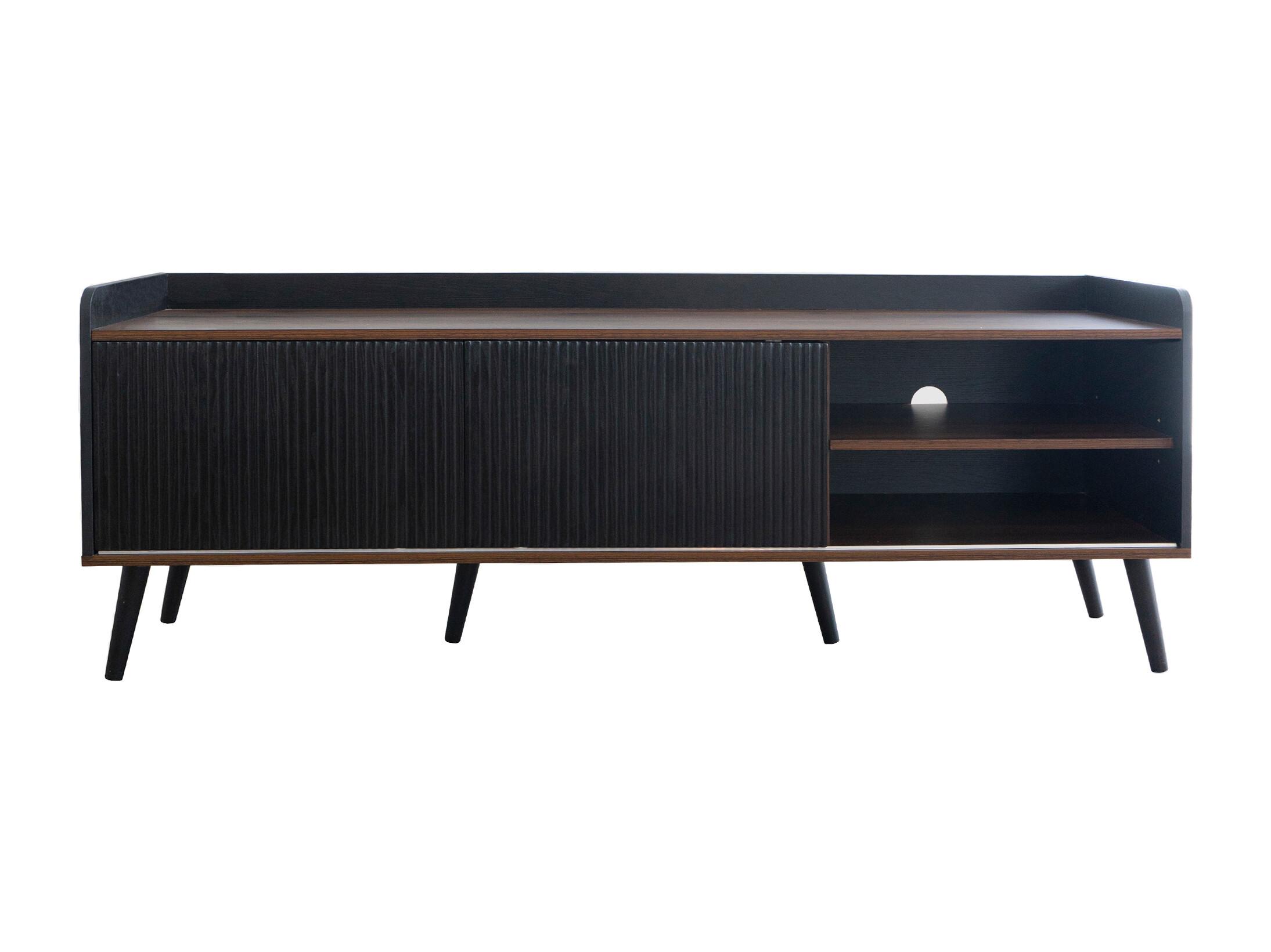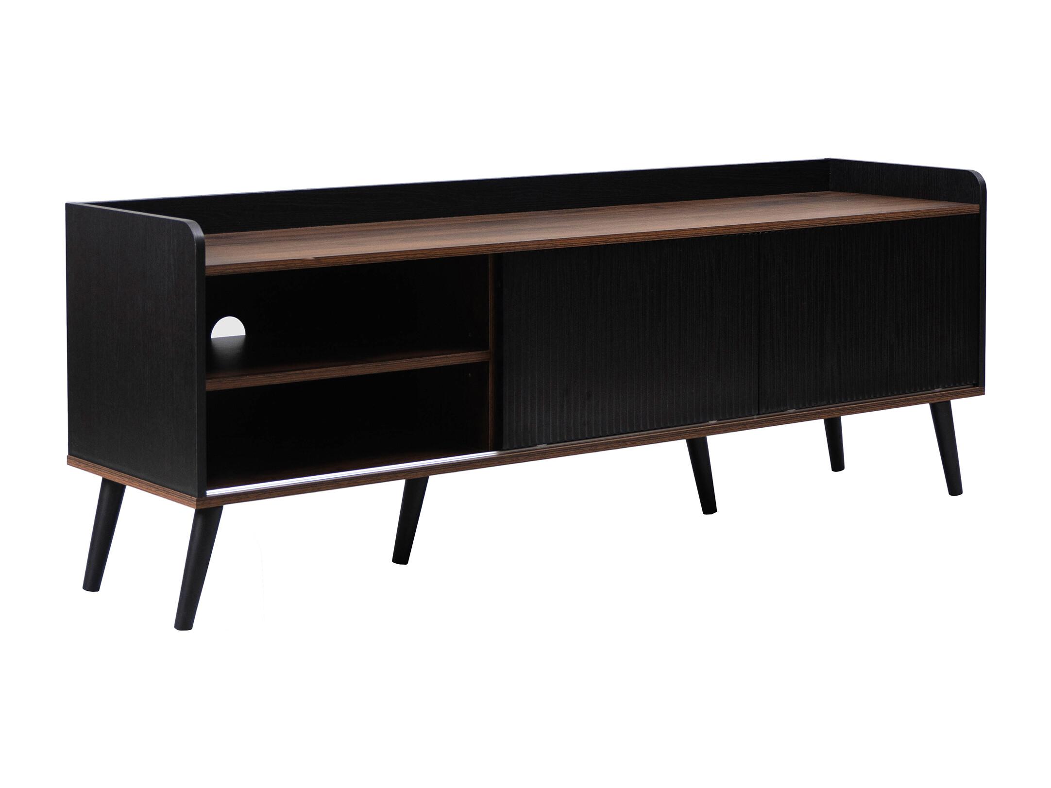 Meuble TV Lowboard noir/bois naturel avec 2 tiroirs, 2 portes coulissantes et plaque basse. H58×L160×P40 cm, parfait salon, grand espace de rangement
