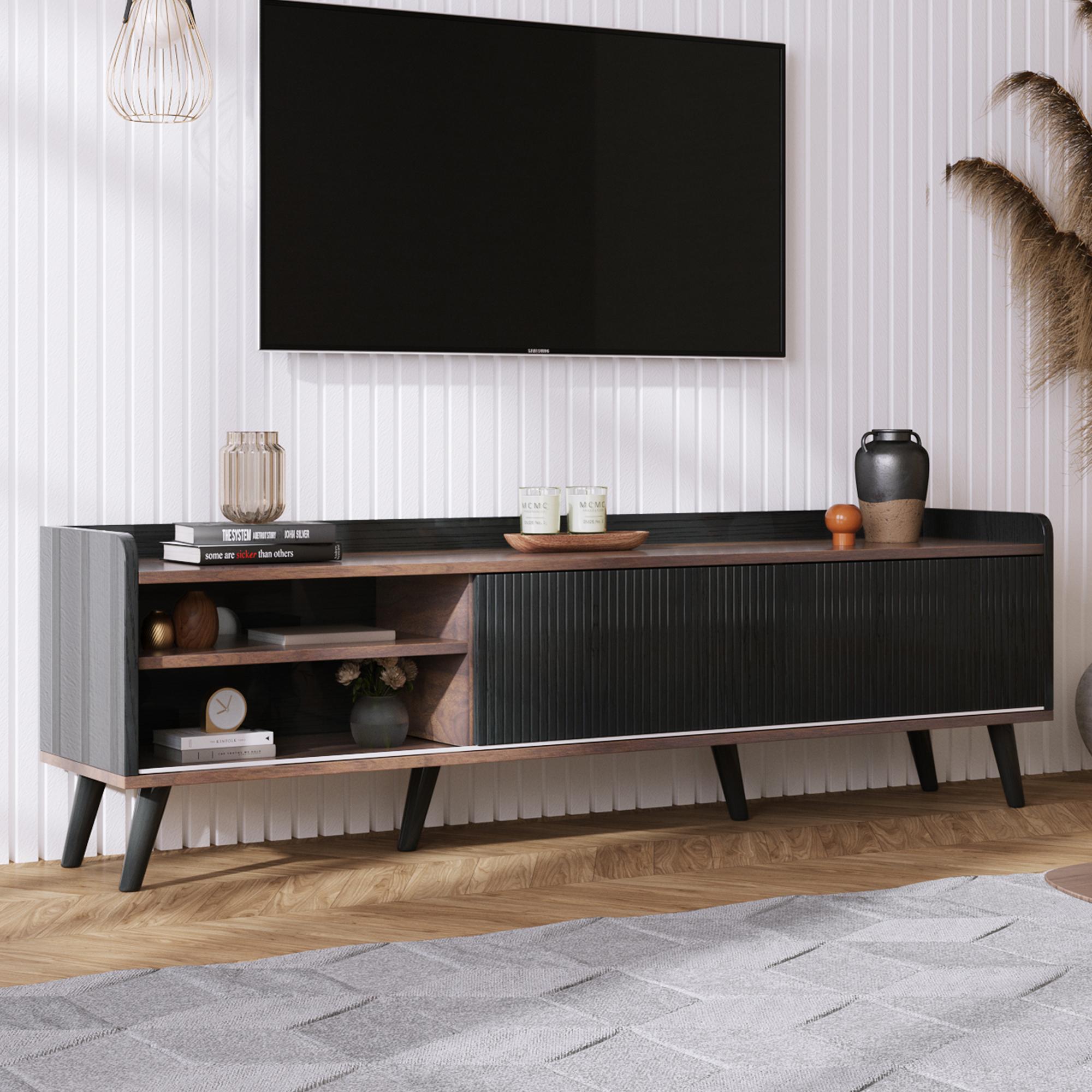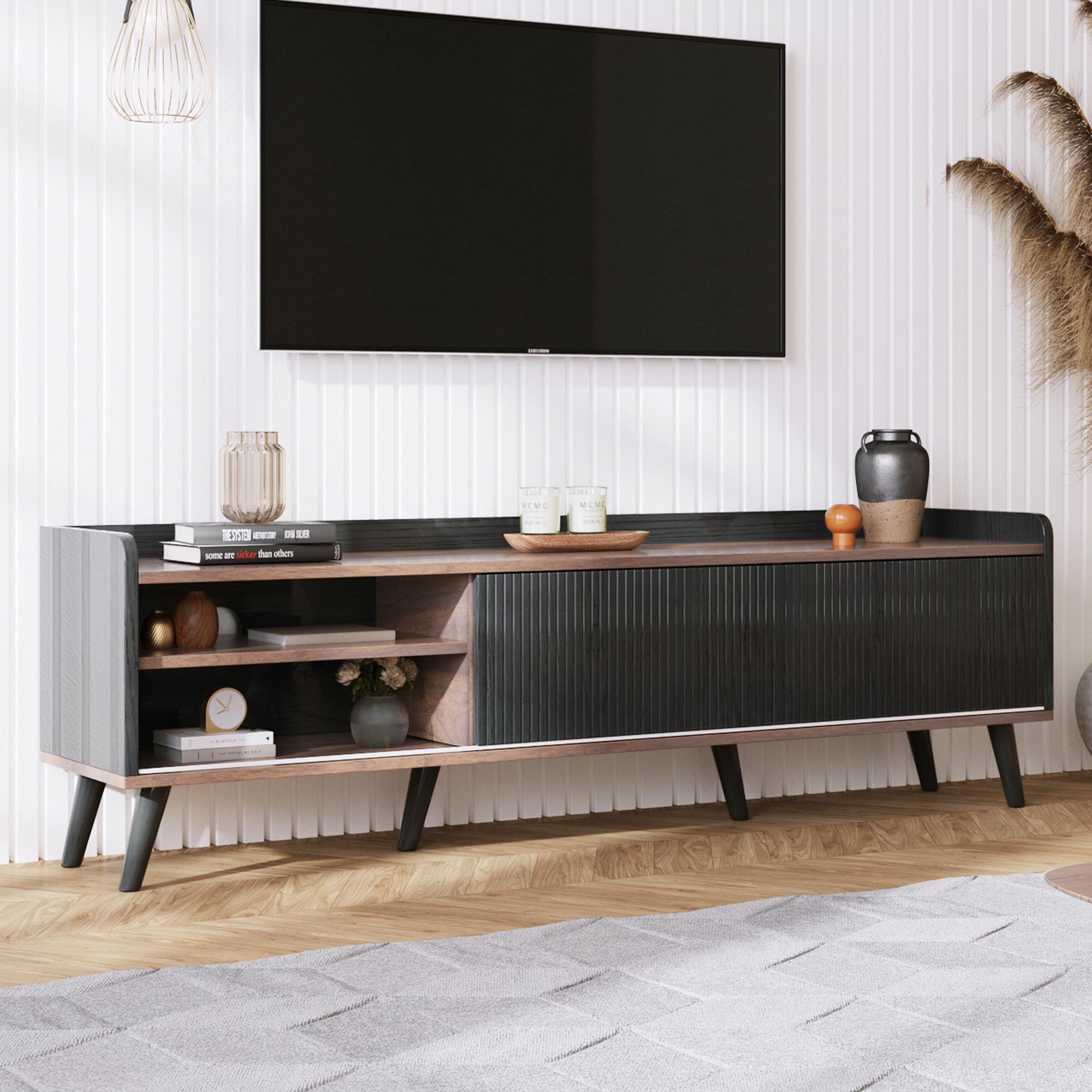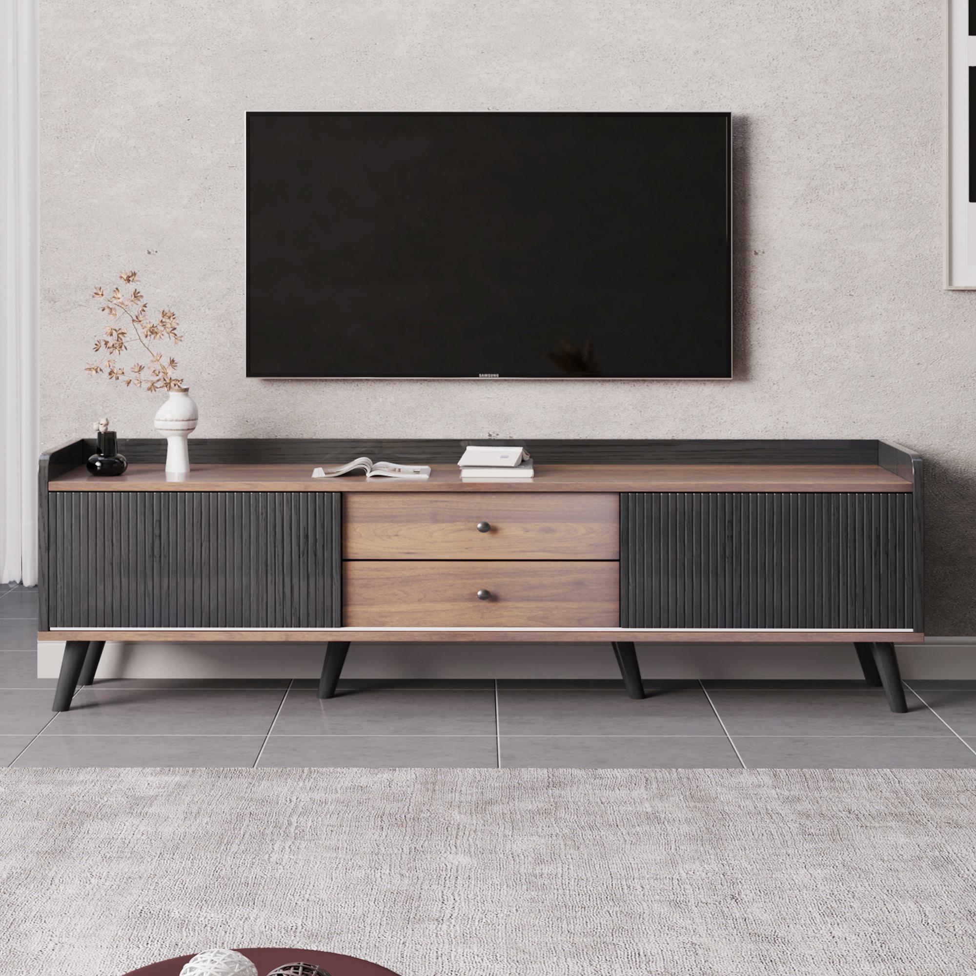 Meuble TV Lowboard noir/bois naturel avec 2 tiroirs, 2 portes coulissantes et plaque basse. H58×L160×P40 cm, parfait salon, grand espace de rangement