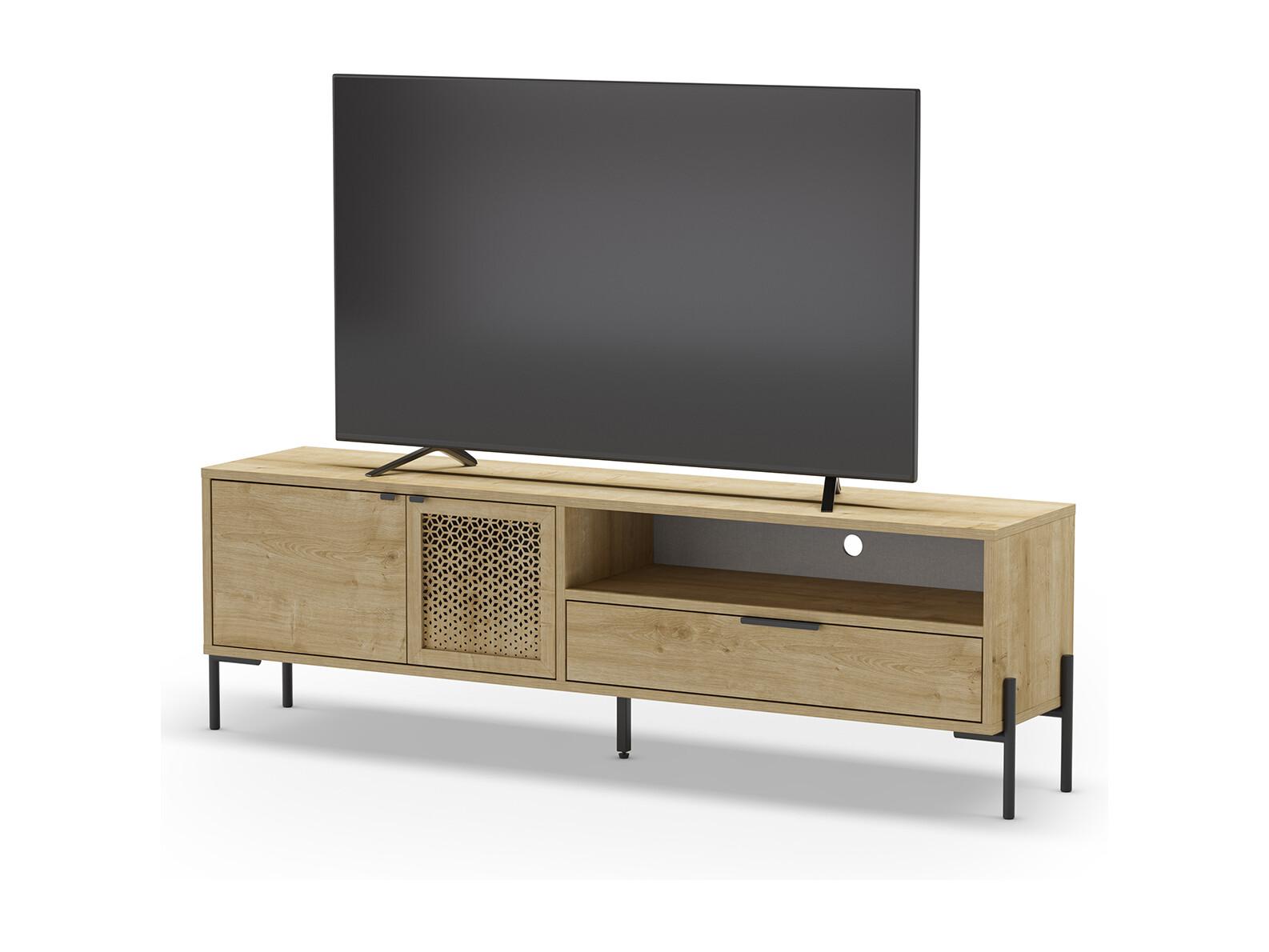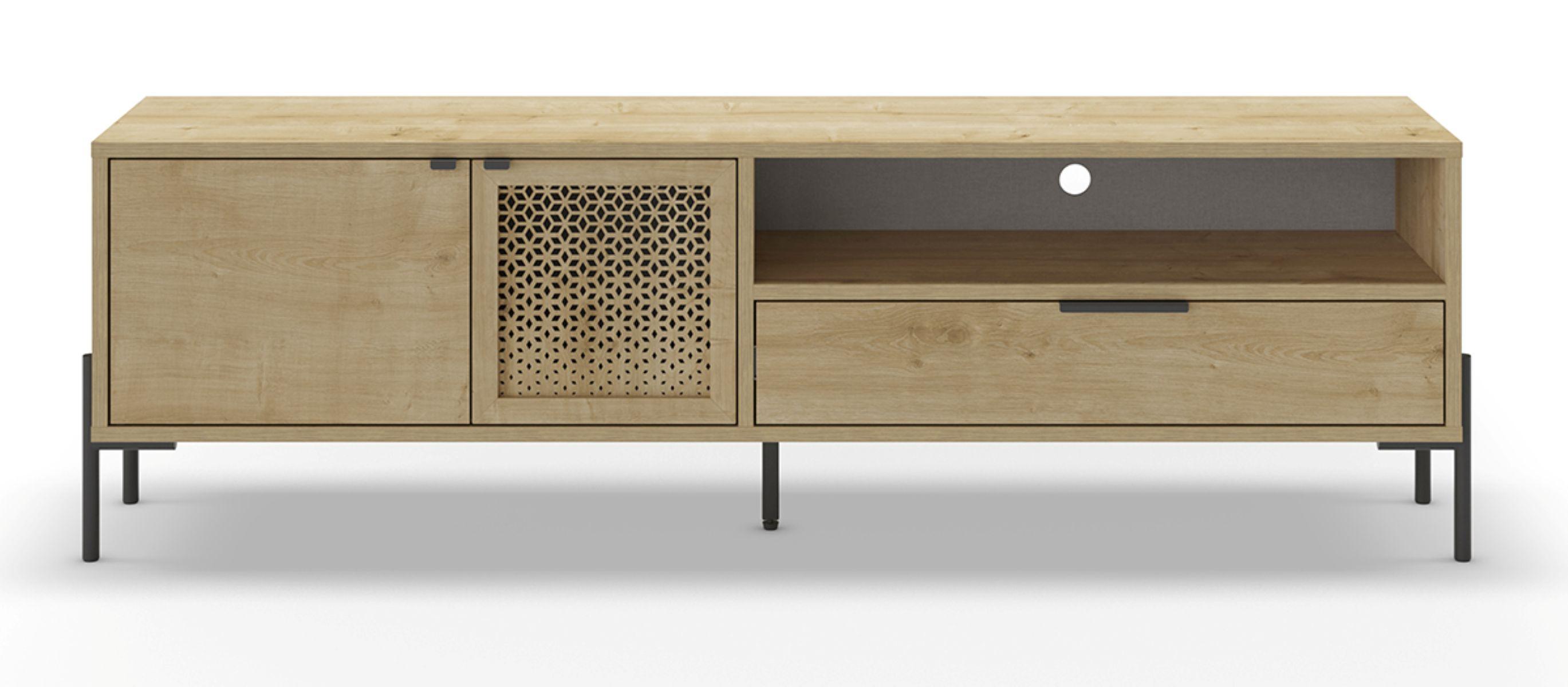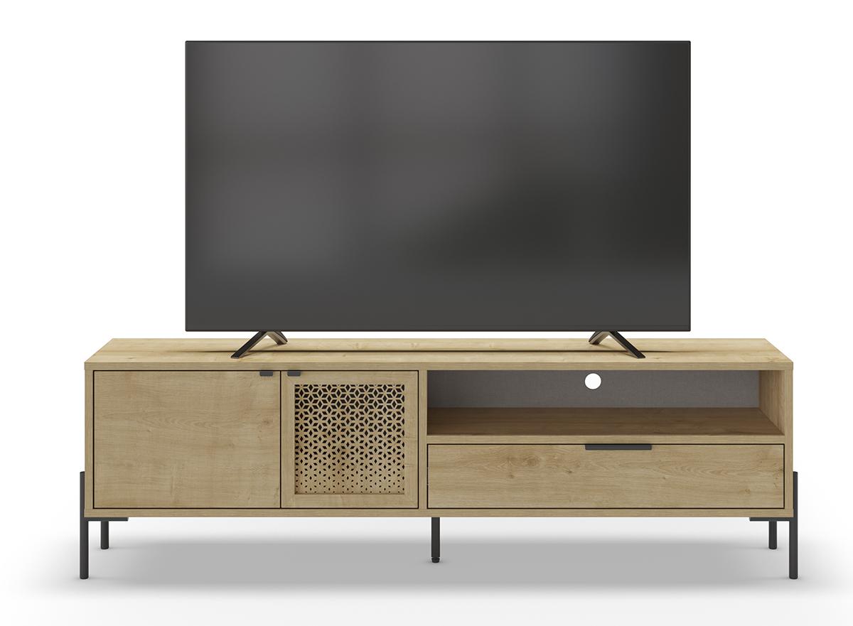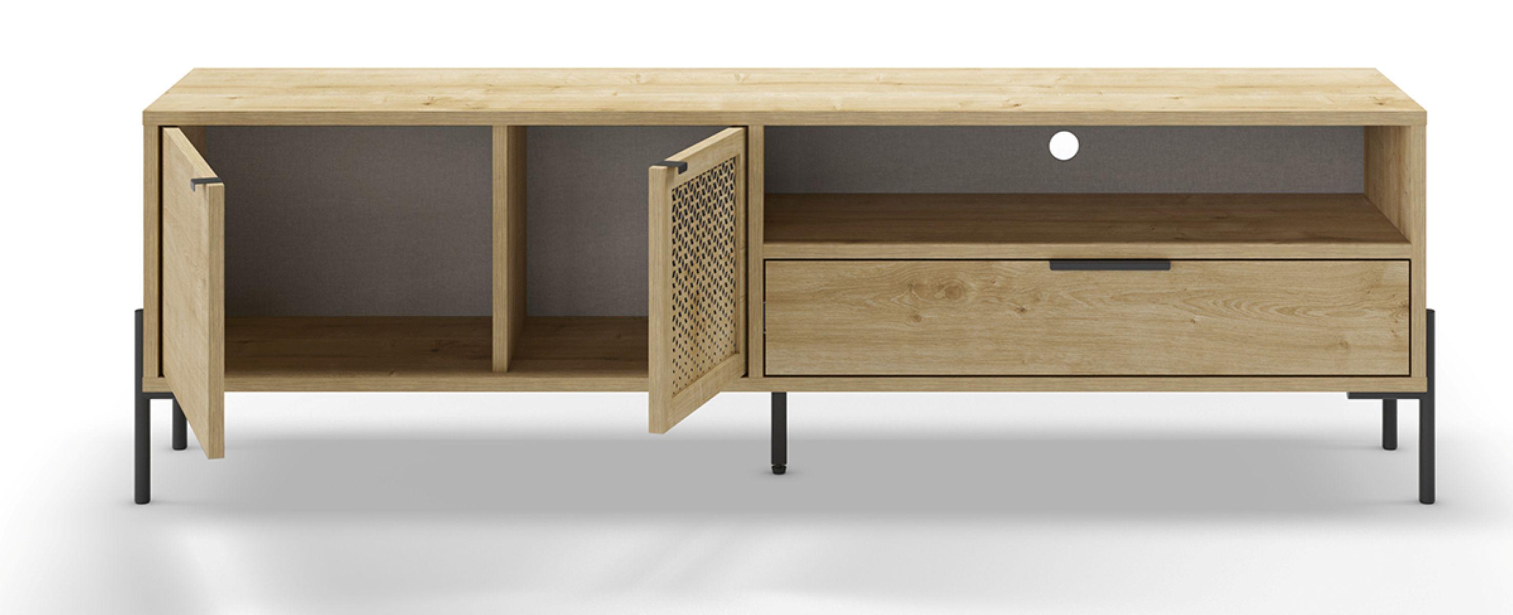Meuble TV, Meuble de salon rectangulaire aspect bois coloris chêne et métal coloris noir - Longueur 164 x Profondeur 35 x Hauteur 50,50 cm