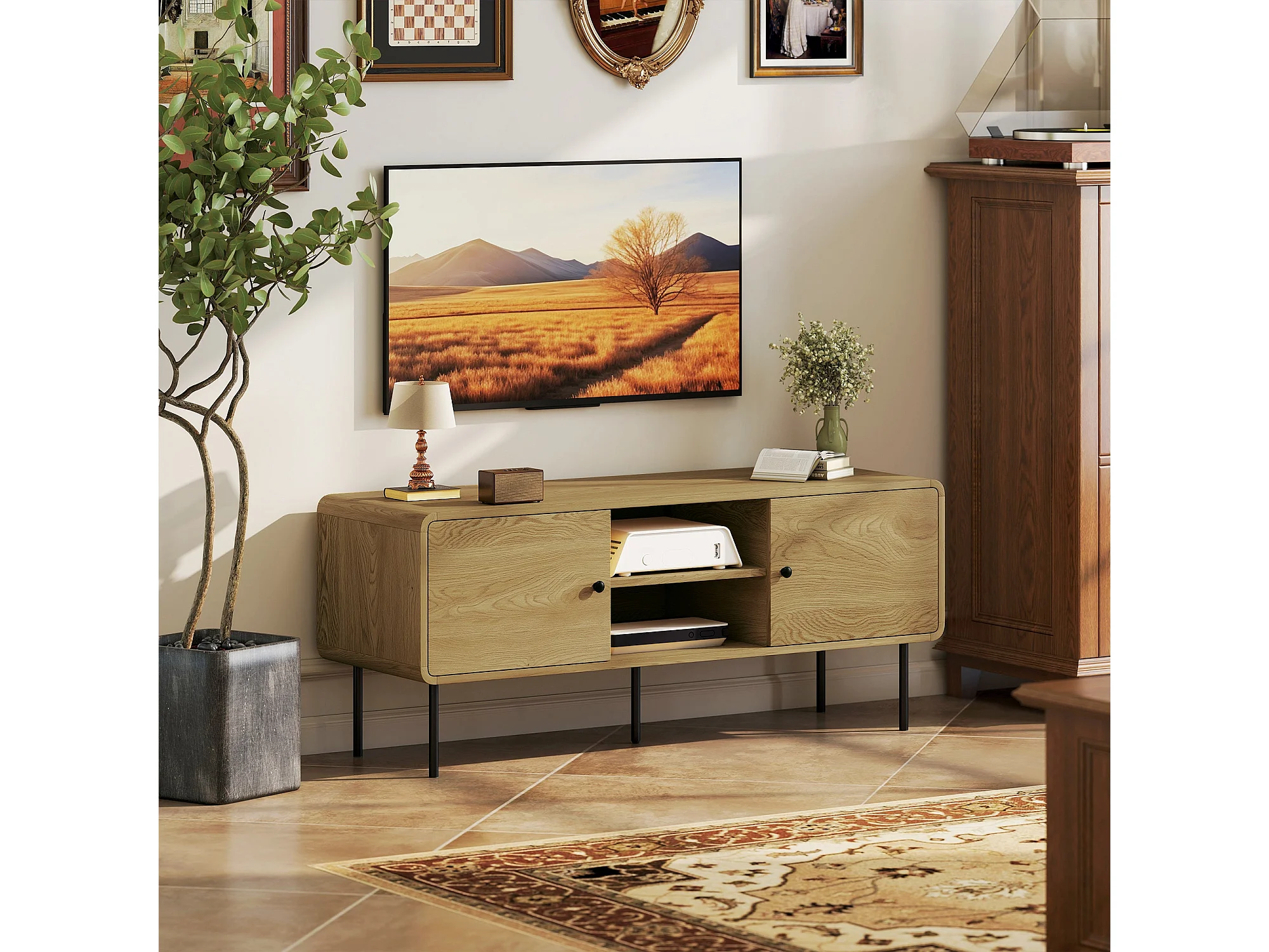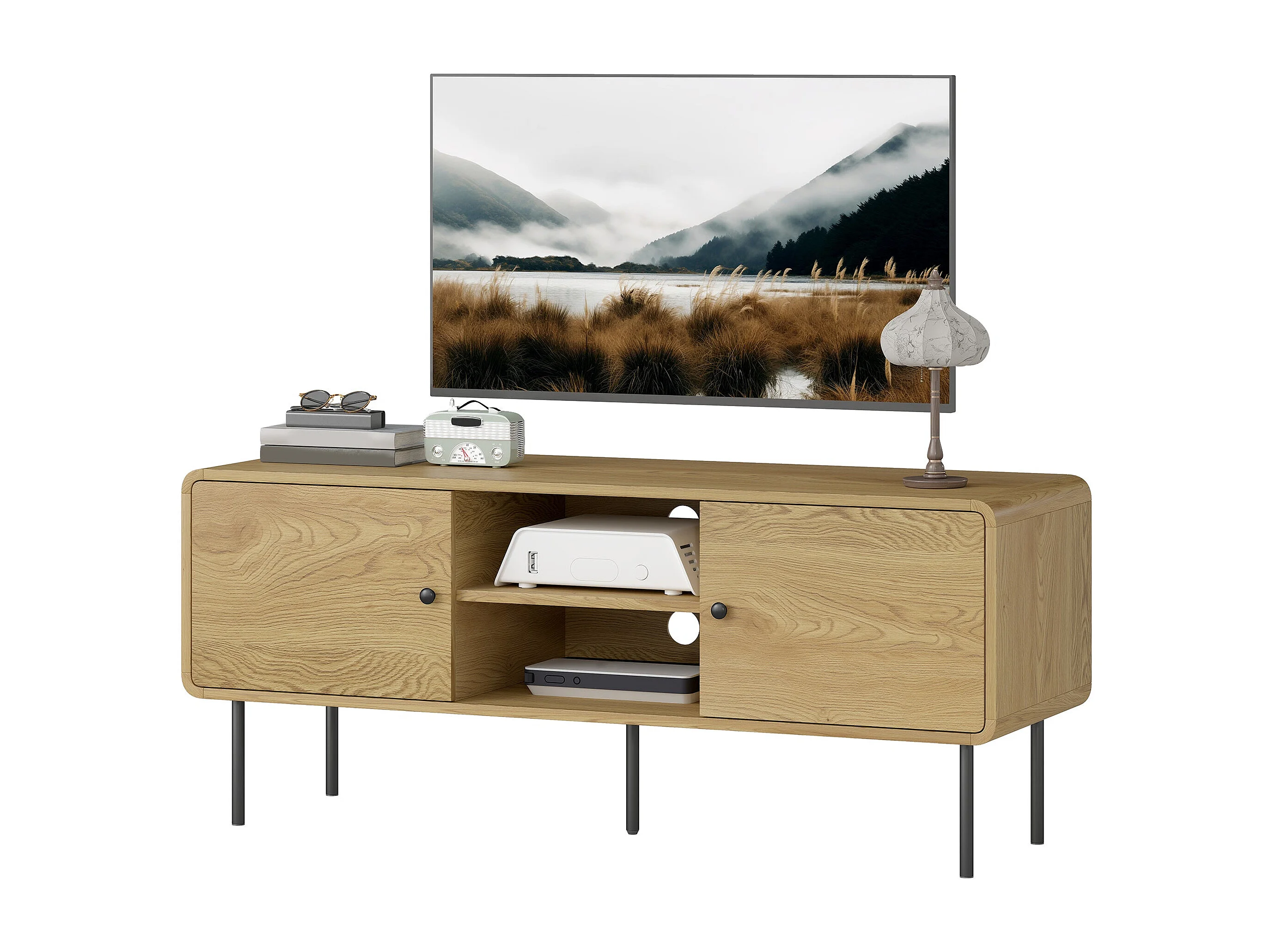 Meuble TV, meuble télé jusqu'à 55 pouces avec 2 portes, 2 compartiments ouverts, pieds en acier, 120x40x50cm, chêne
