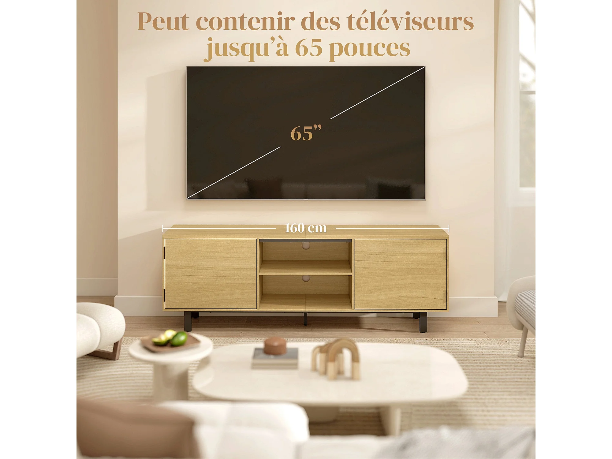 Meuble TV, meuble télé jusqu'à 65 pouces, 2 portes à ouverture par pression et 2 étagères, 160x35x55,5cm, bois naturel