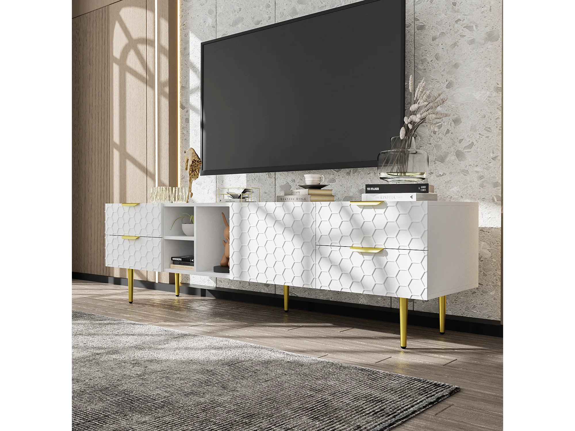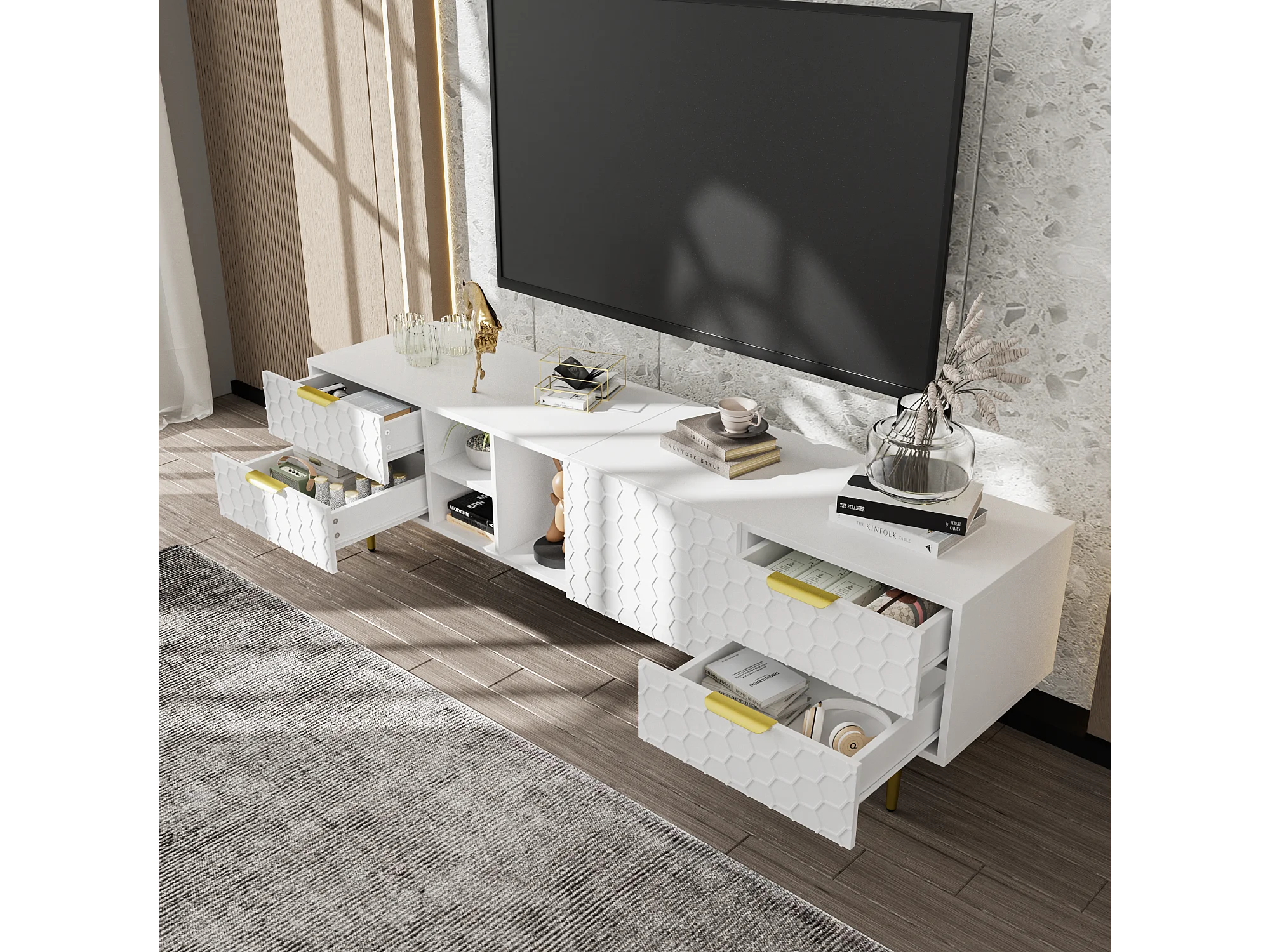 Meuble TV moderne 170cm - 4 tiroirs et 4 compartiments - Blanc & Doré