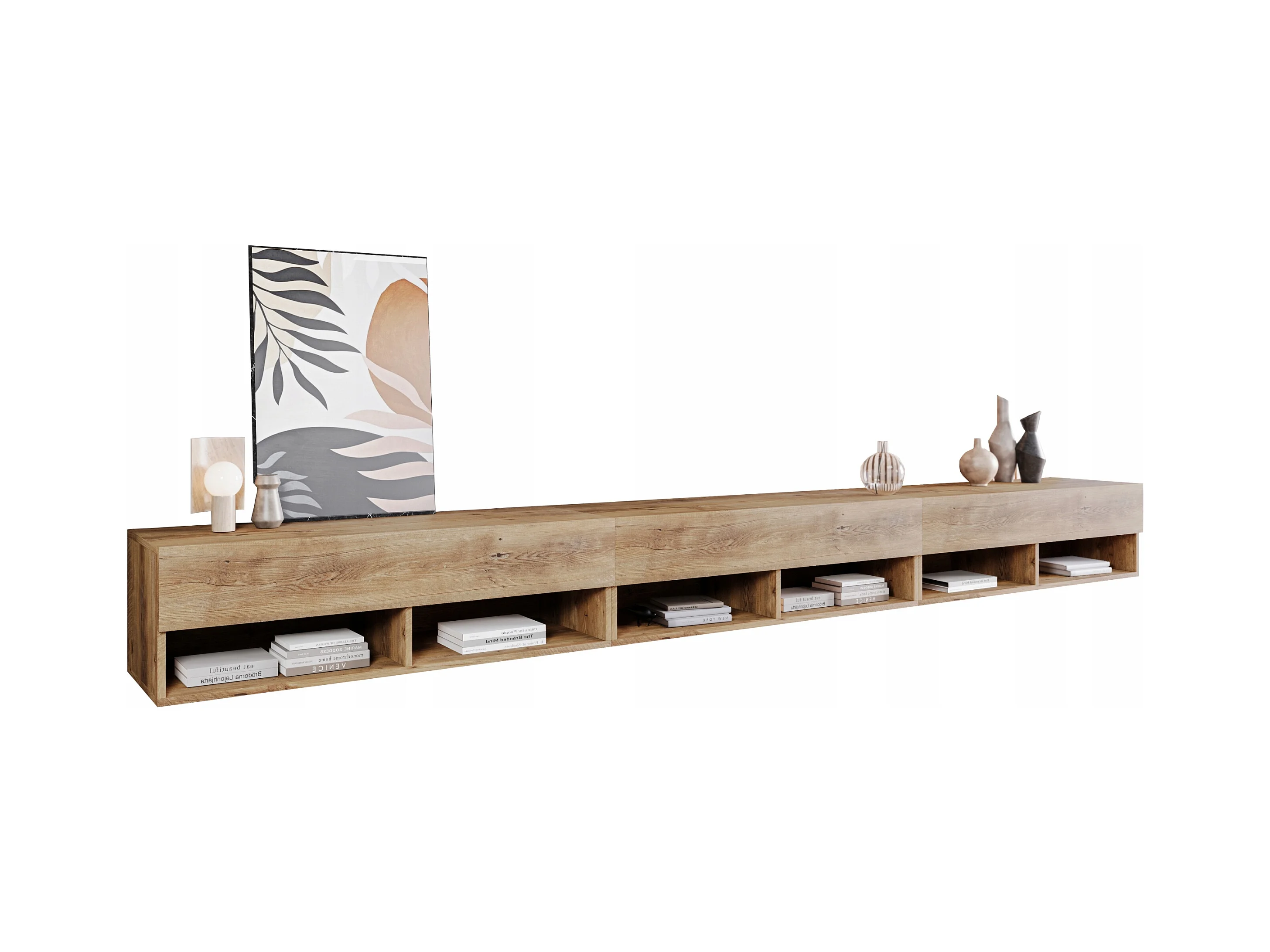 Meuble TV moderne 300 cm avec LED – sans poignées, châtaignier, posé au sol ou suspendu