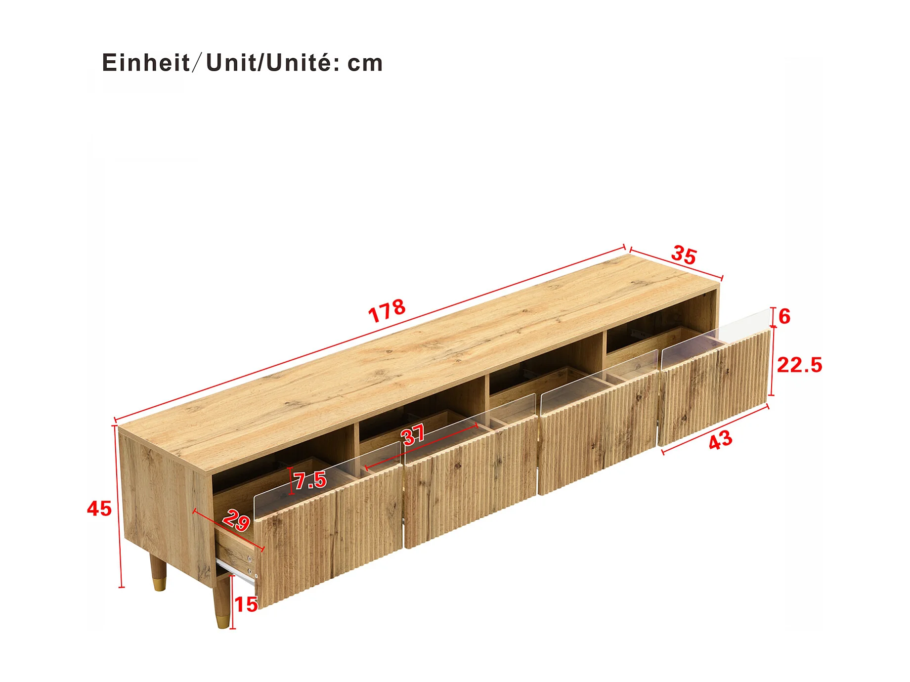 Meuble TV Moderne Aspect Bois 178 cm – Design Minimaliste, Grand Rangement, 4 tiroirs, Bois