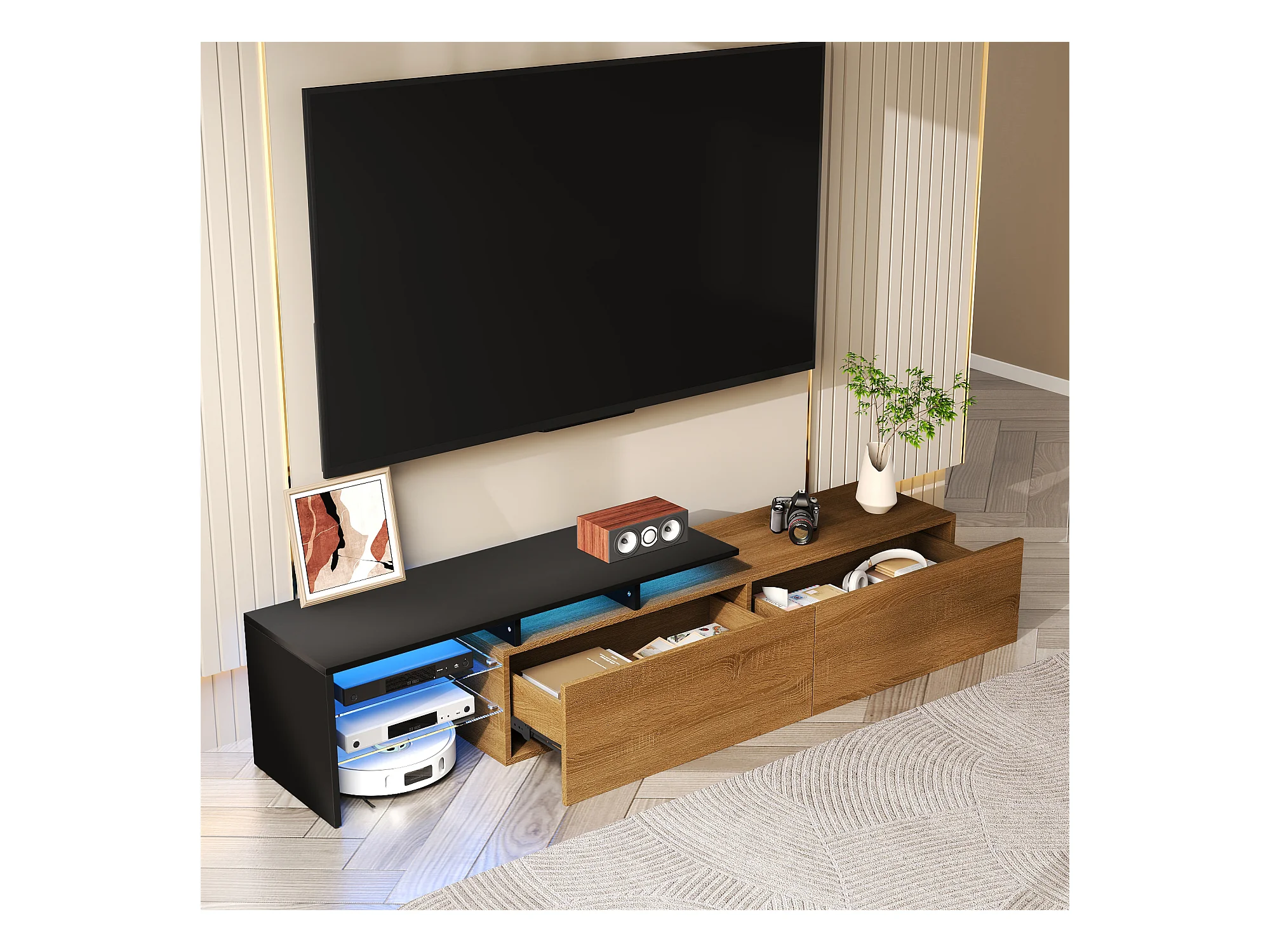 Meuble TV moderne au design élégant et stylé, offrant un rangement pratique, en noir haute brillance avec finition bois, plateaux en verre et éclairage LED intégré.