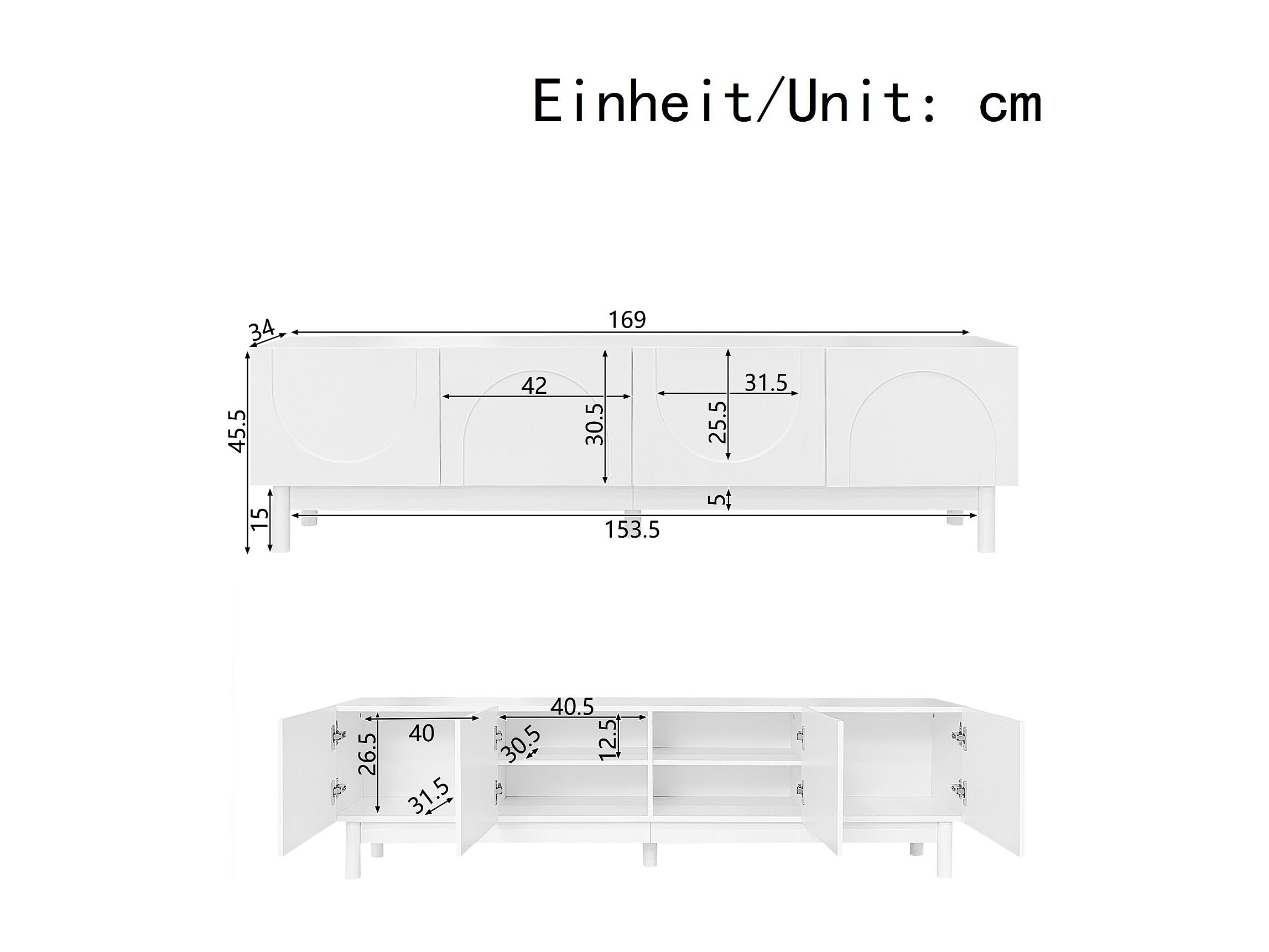 Meuble TV - 176x38x45cm Lowboard avec 6 Pieds de Support - avec 2 tiroirs et 2 armoires - Blanc