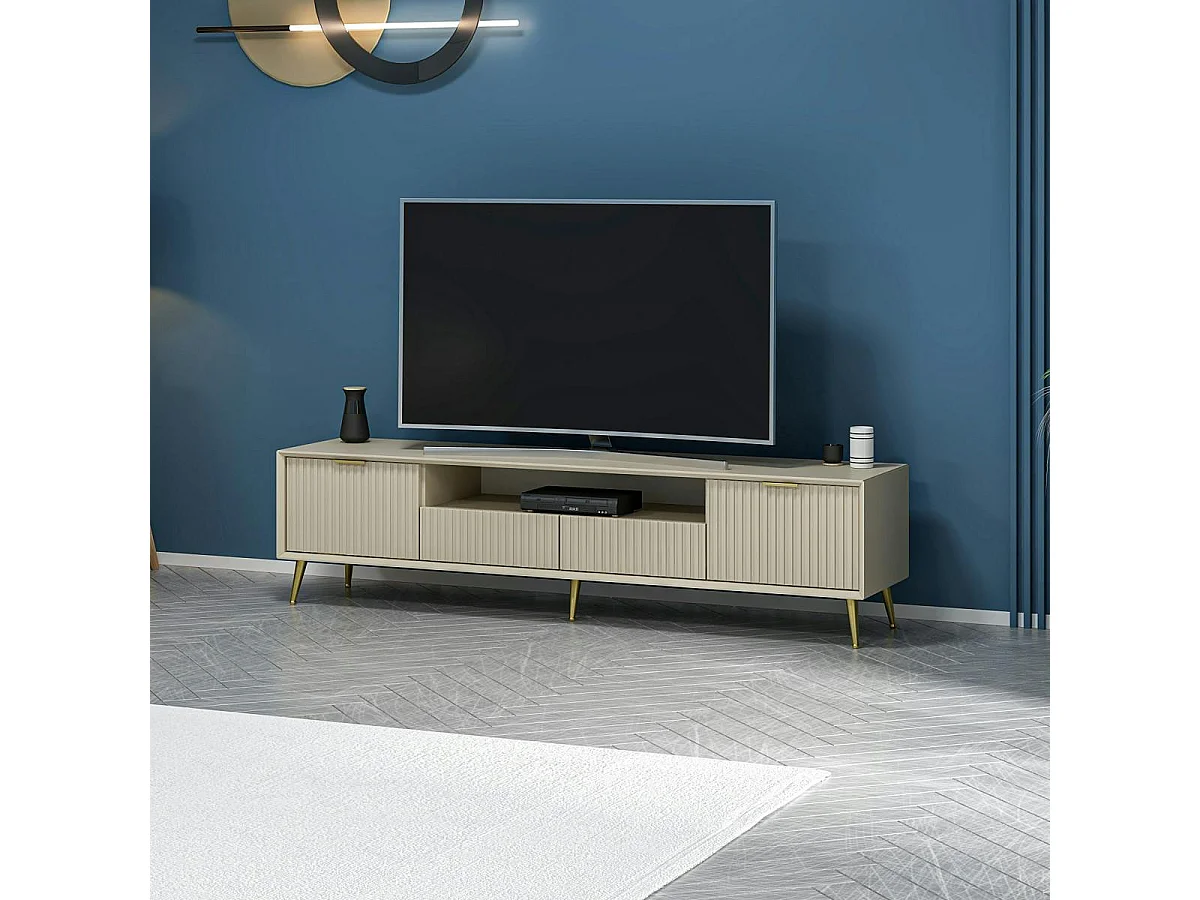 Meuble TV moderne beige façade rainurée pieds dorés MARFA