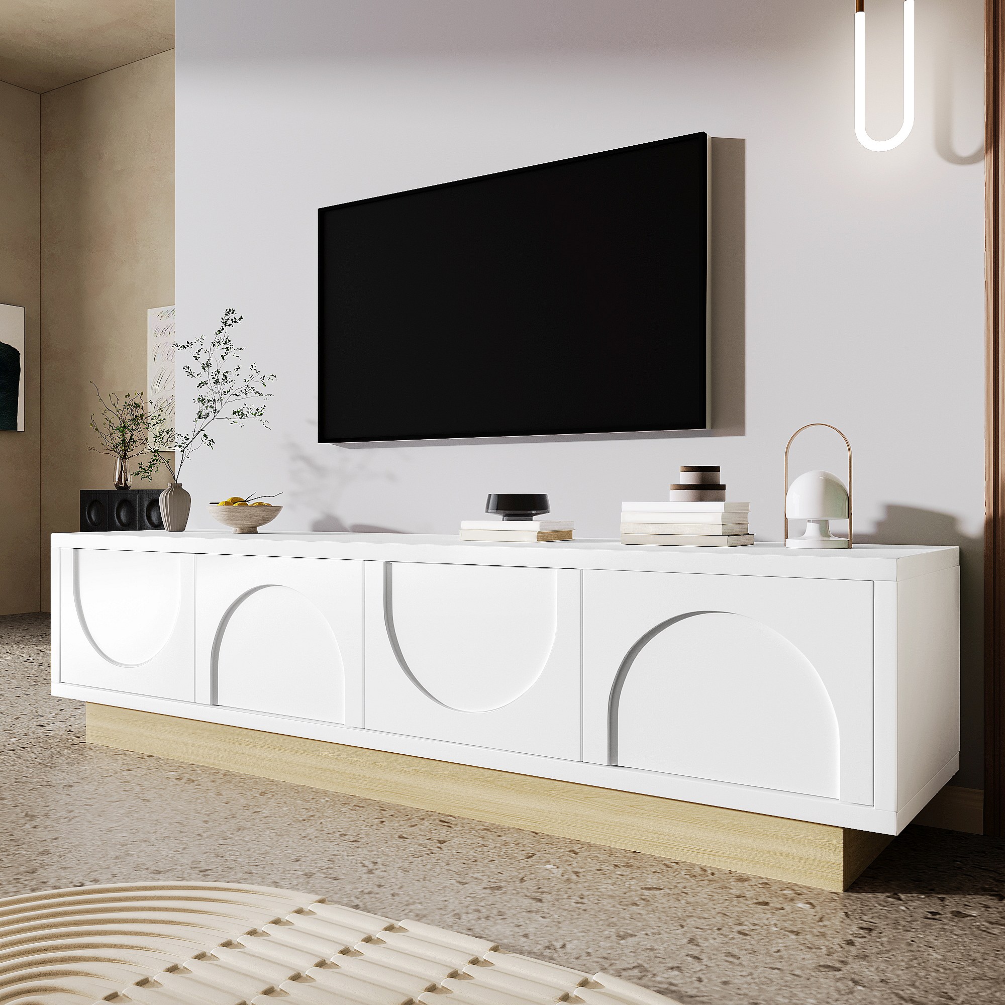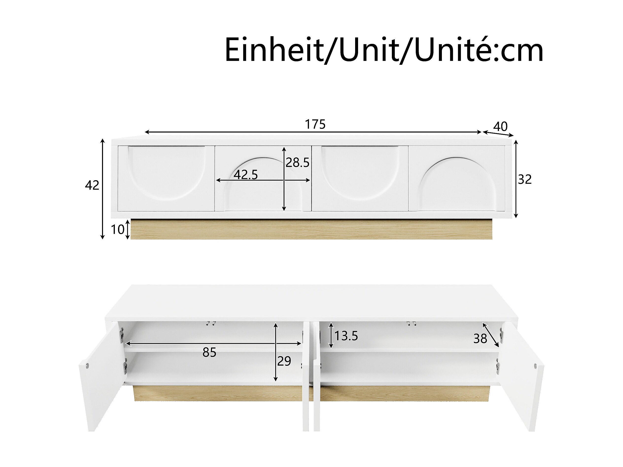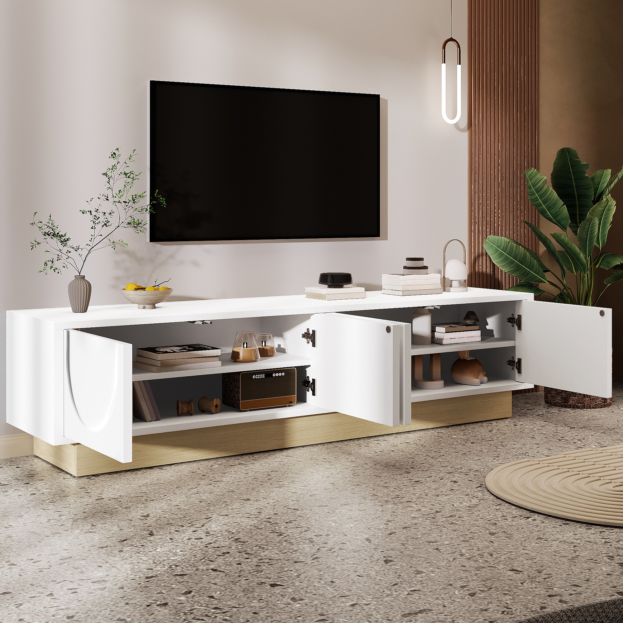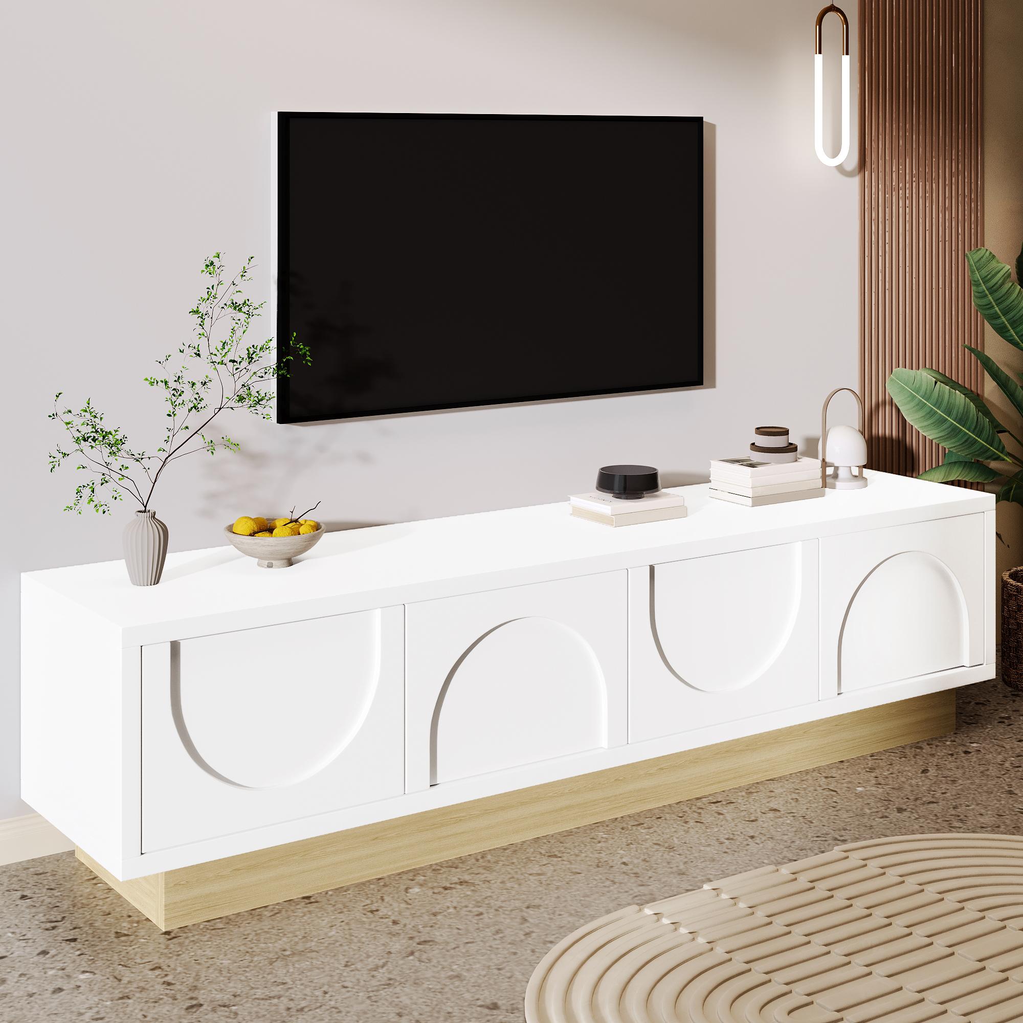 Meuble TV moderne blanc avec finition bois, 175 cm, design minimaliste arrondi, grand espace de rangement et gestion des câbles.