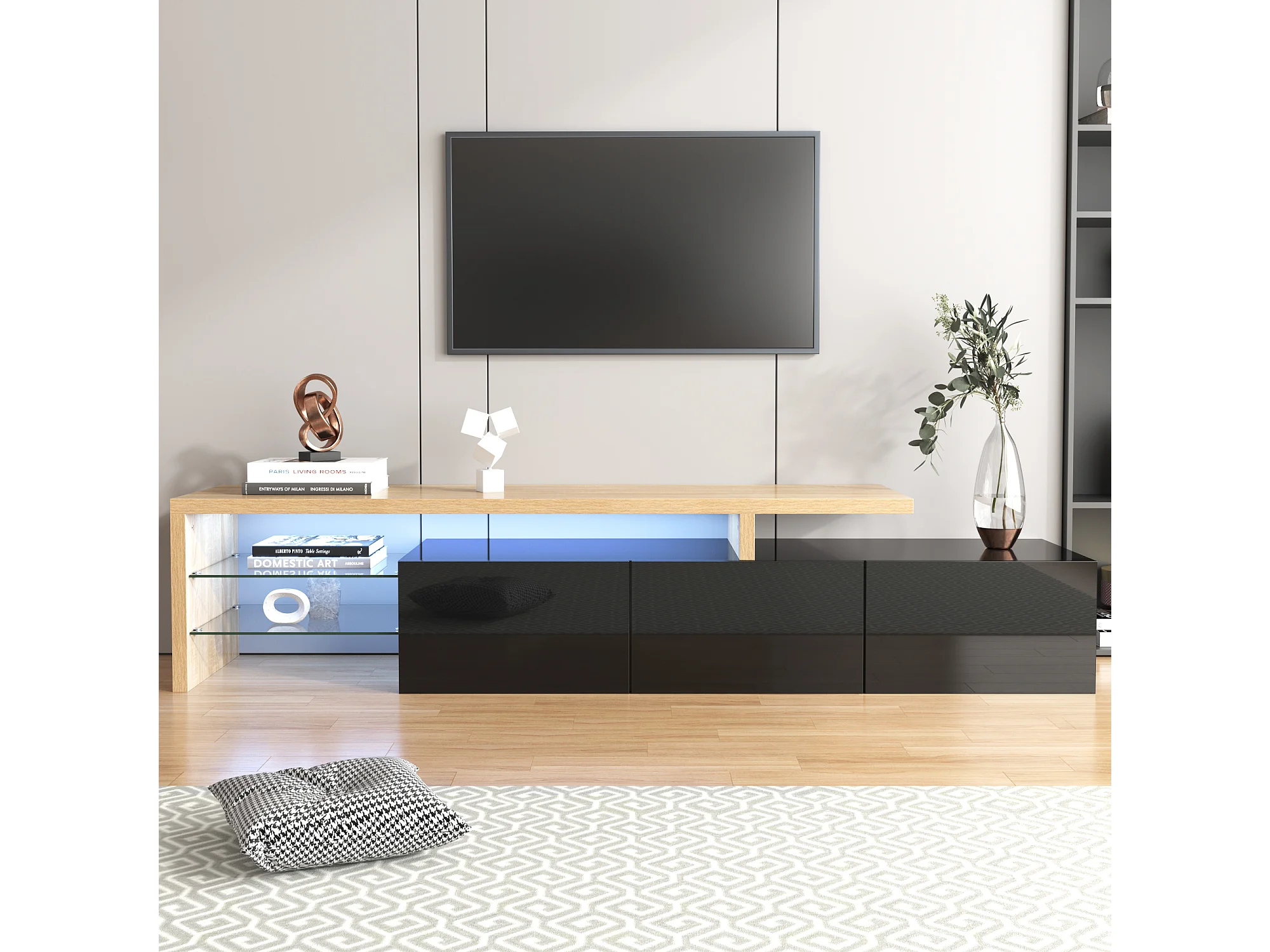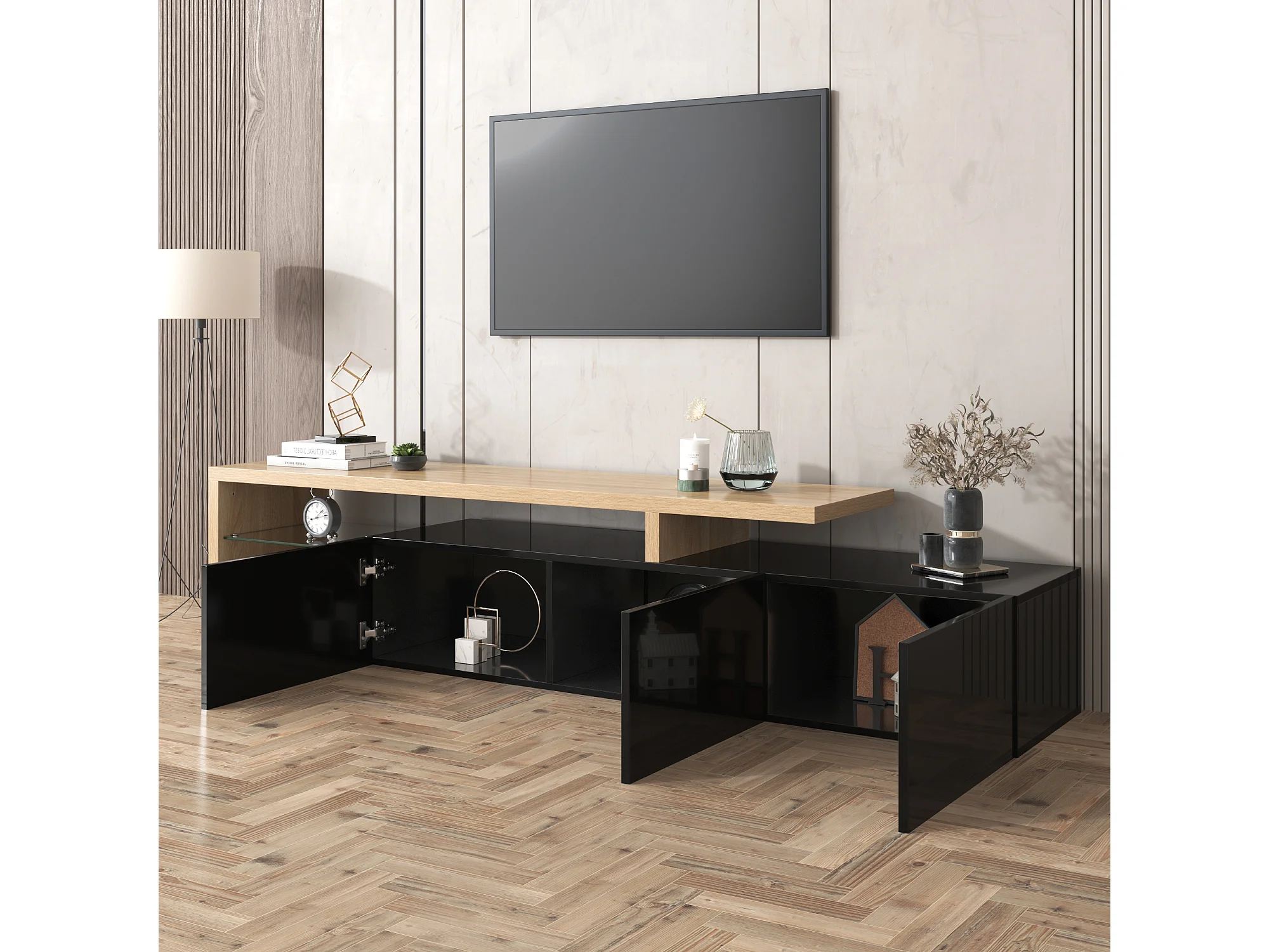 Meuble TV Moderne : Élégance Stylée, Rangement Pratique, Noir Brillant, Aspect Bois, Étagères en Verre, Éclairage LED