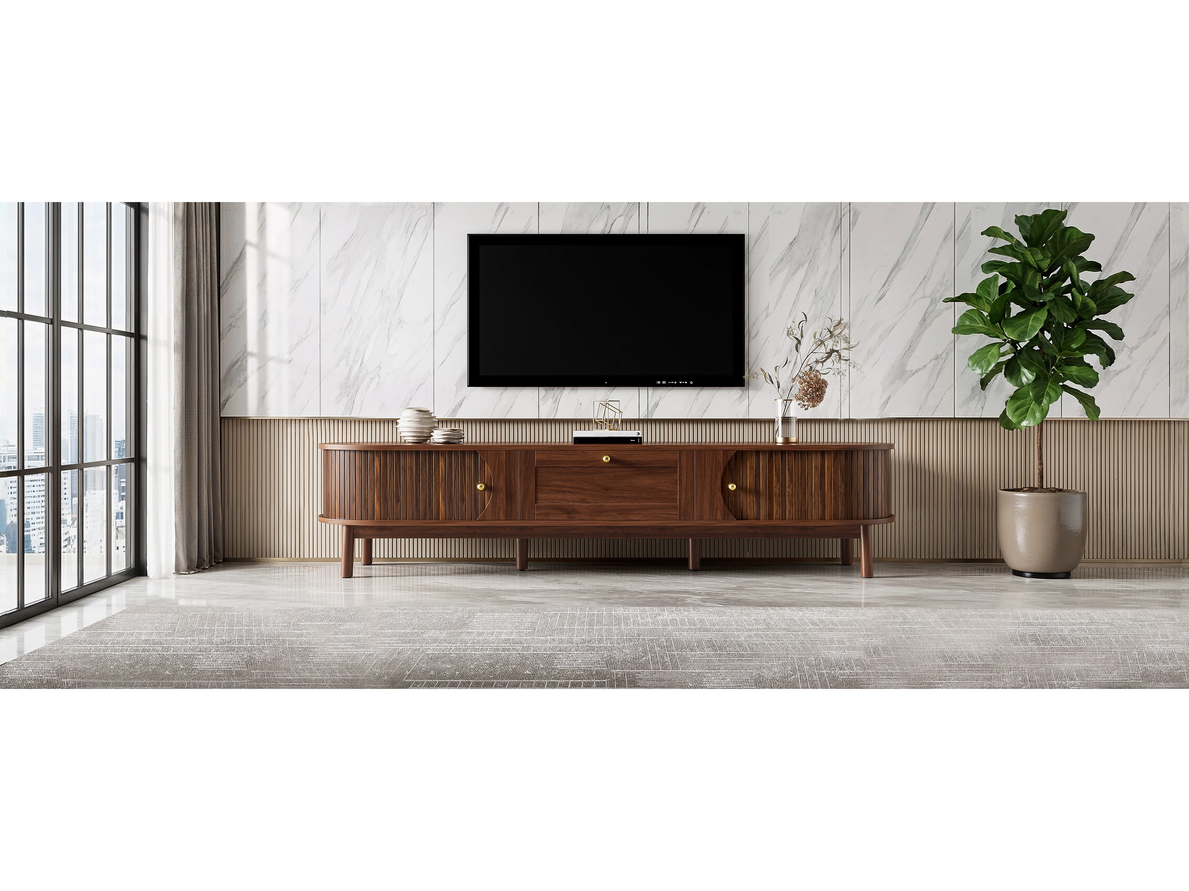 Meuble TV moderne en bois - 170 x 39.5 x 38 cm - avec tiroir + 2 portes - angles arrondis classiques - MDF - marron