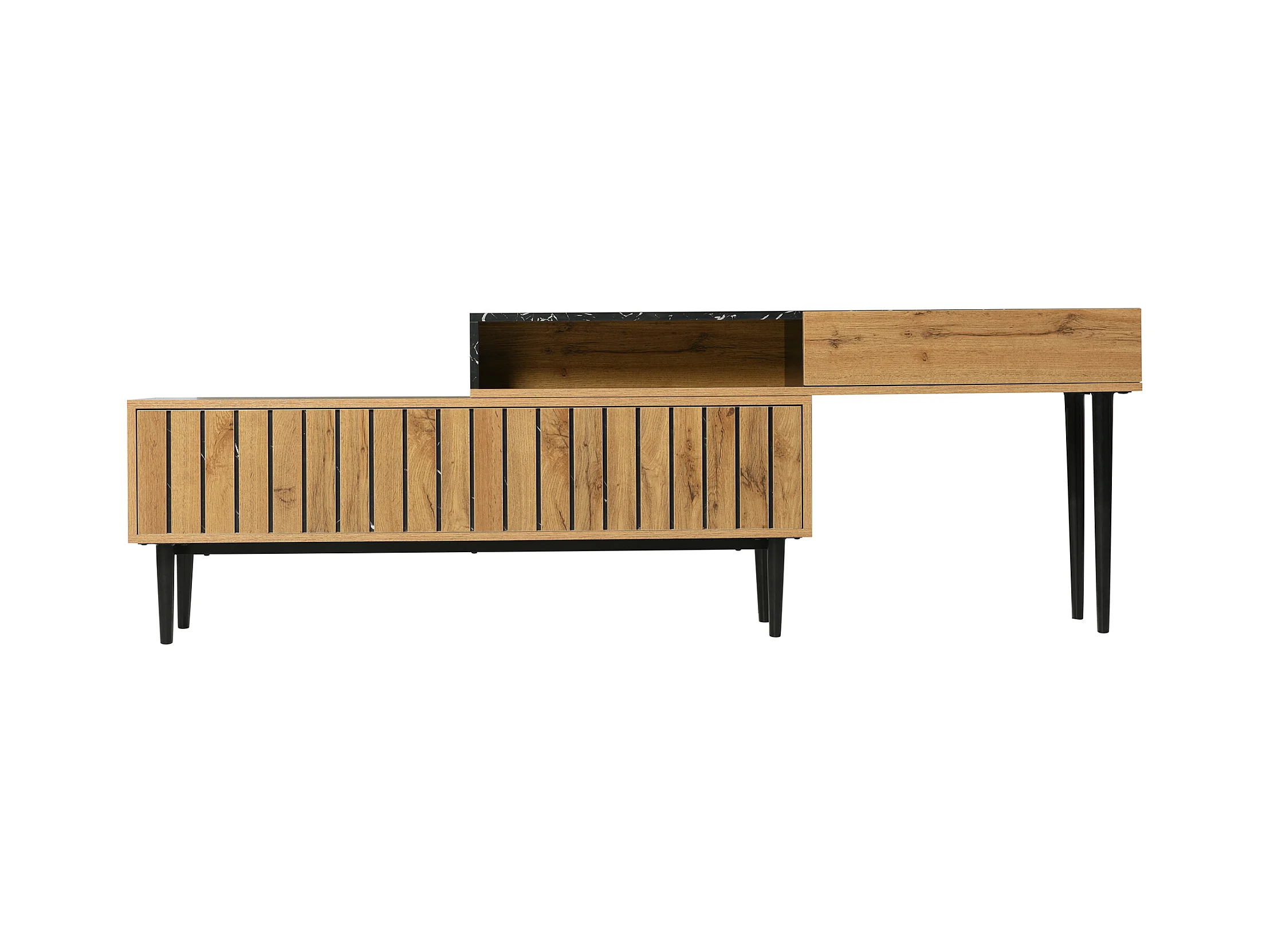 Meuble TV moderne extensible effet marbre noir et bois PVC pieds en acier noir PHOGNAIN