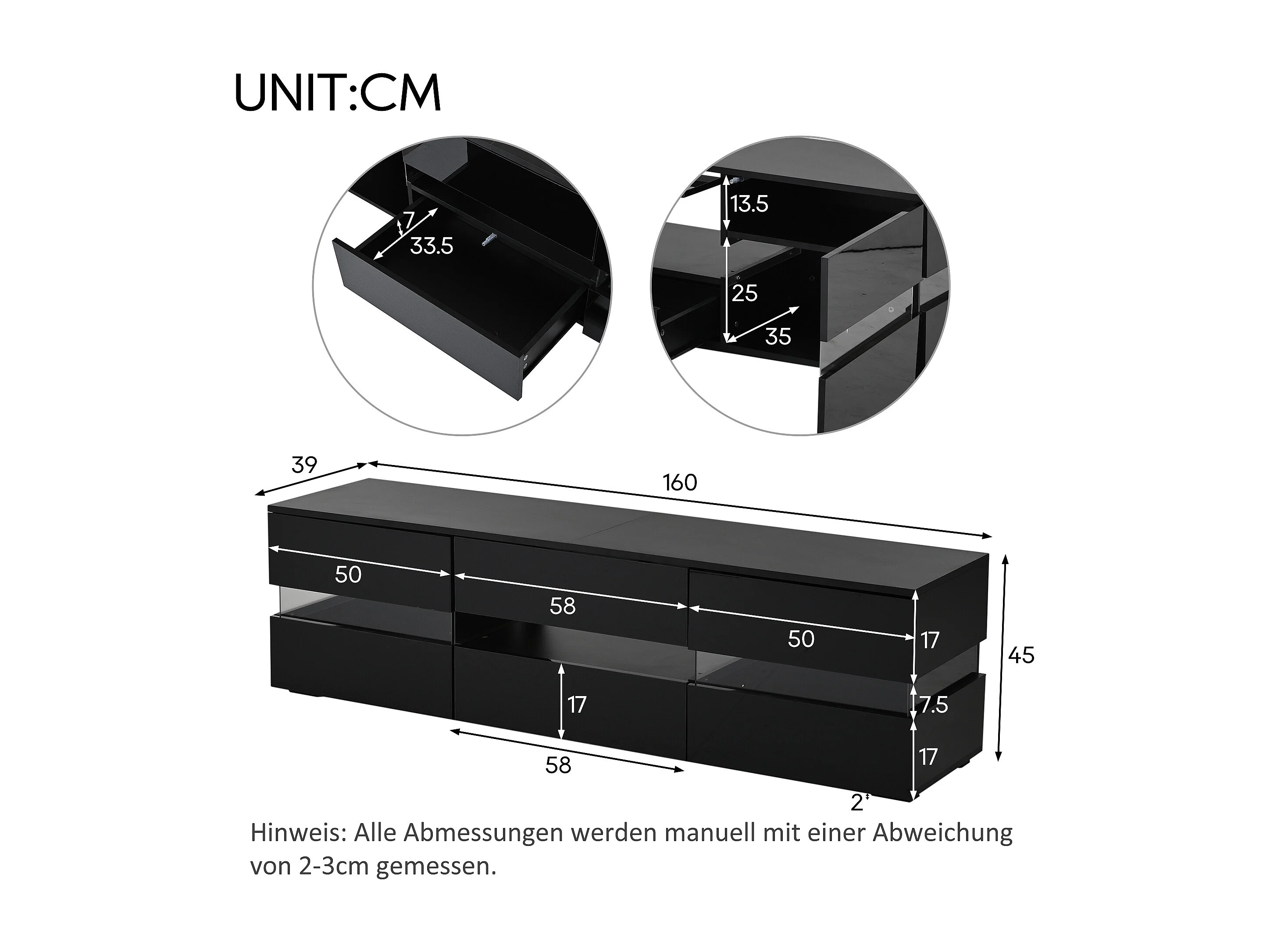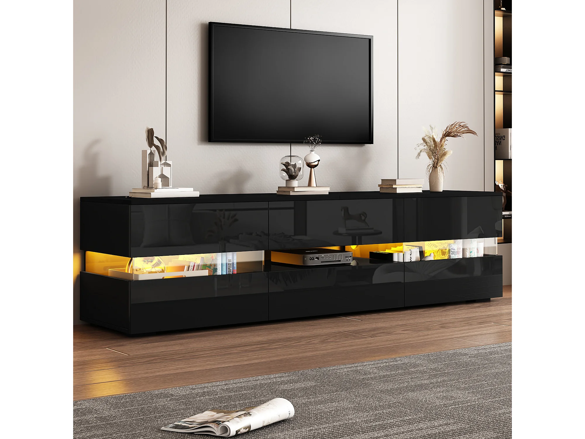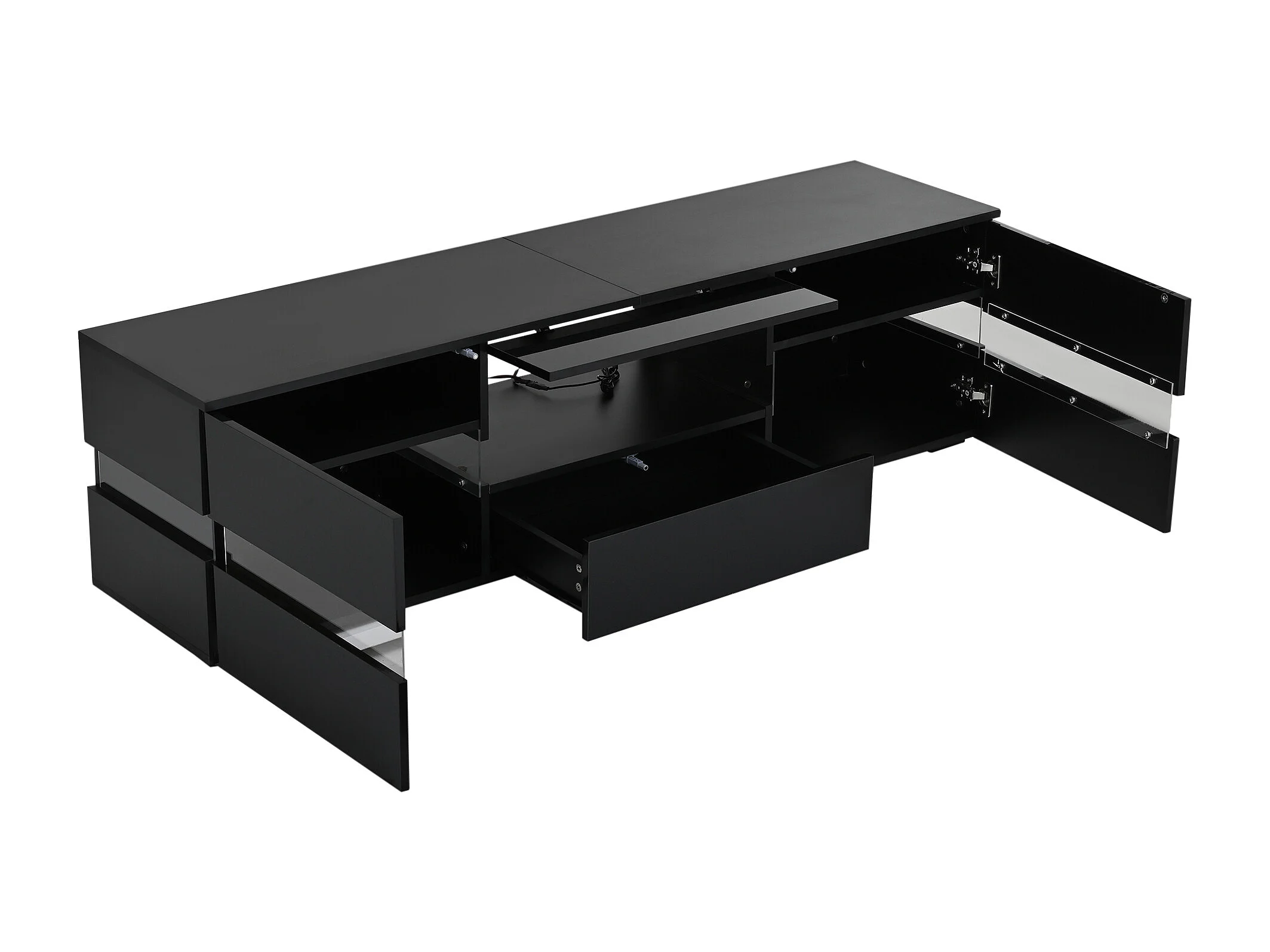 Meuble TV moderne laqué brillant avec LED, 2 portes et 1 tiroir - Noir