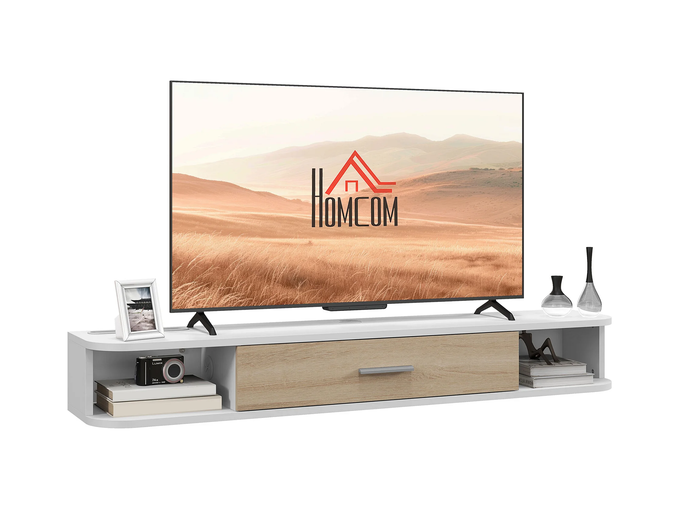Meuble TV design LED suspendu mural - 75 pouces max. - 2 niches - dim. 180L x 40l x 30H cm - aspect bois blanc