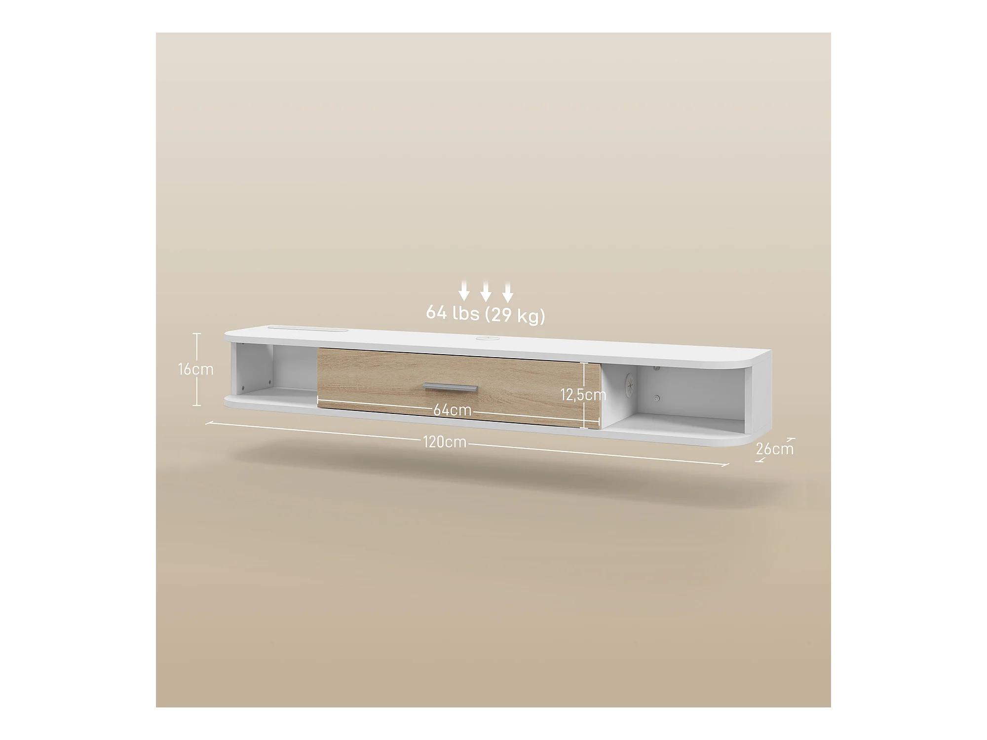 Meuble TV mural banc TV design flottant - 2 niches, porte abattante - dim. 120L x 26l x 16H cm - blanc aspect chêne clair