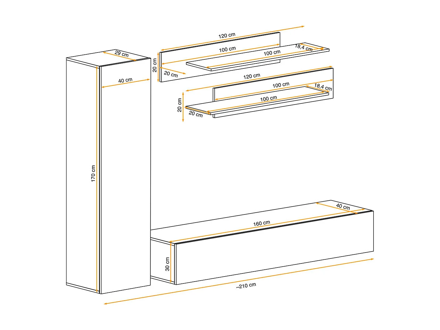 Meuble TV Mural Design "Fly I" 210cm Noir & Blanc