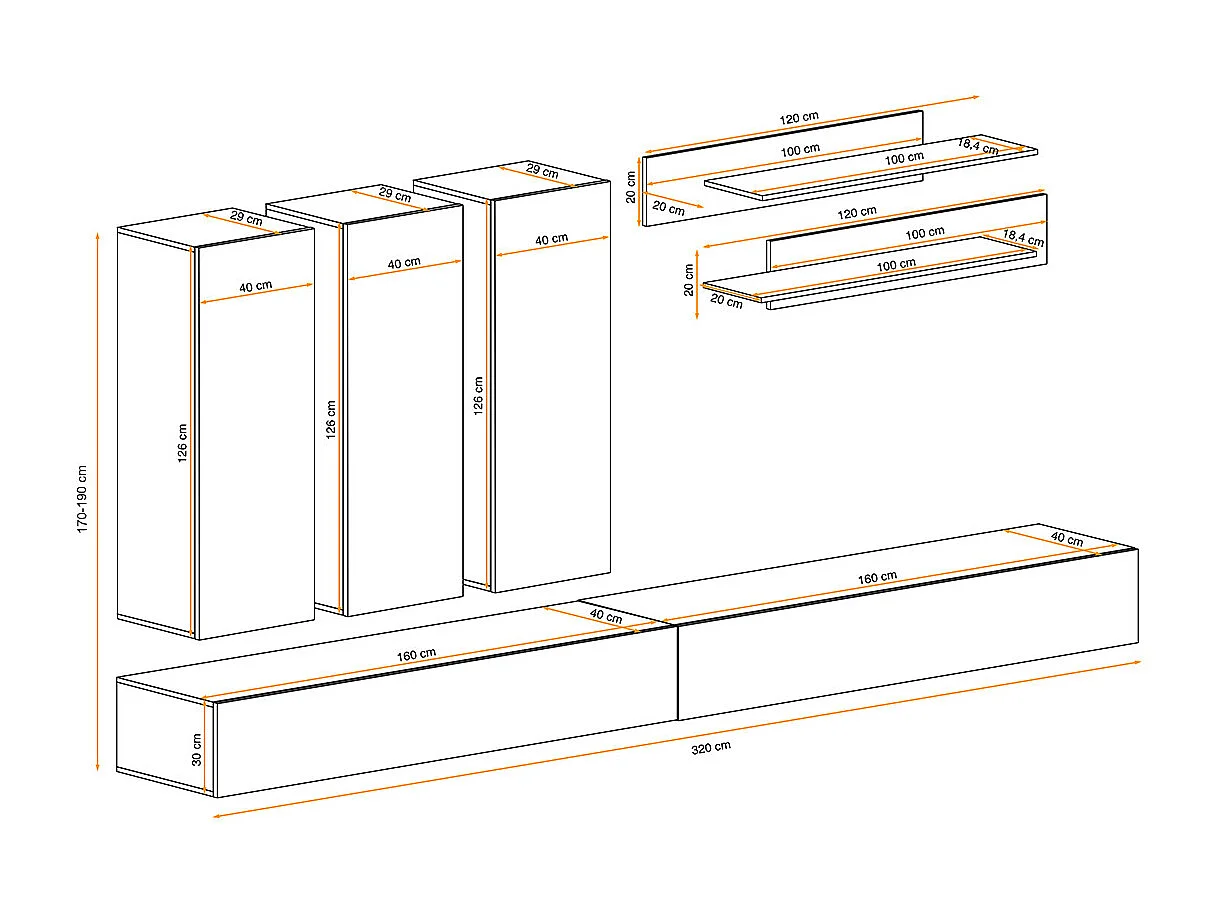 Meuble TV Mural Design "Fly I" 320cm Noir & Blanc