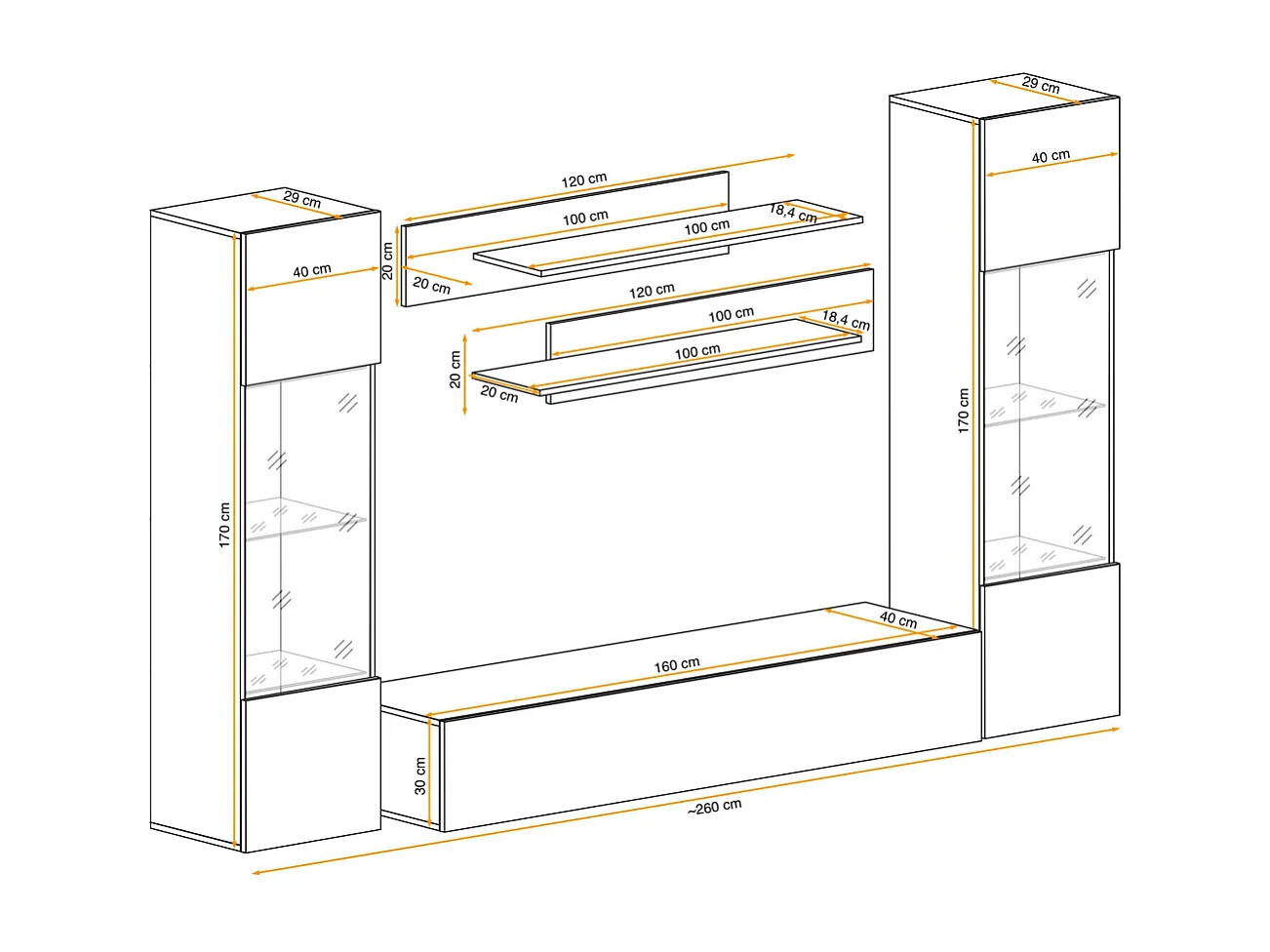 Meuble TV Mural Design "Fly III" 260cm Noir & Blanc