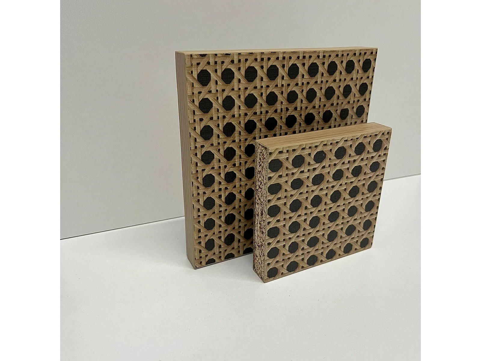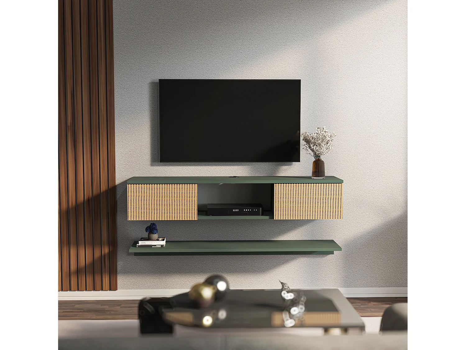 Meuble tv mural Elia flottant 140 cm - armoires - passe-cable - étagère murale incluse (Silva Vert et Effet Rotin)