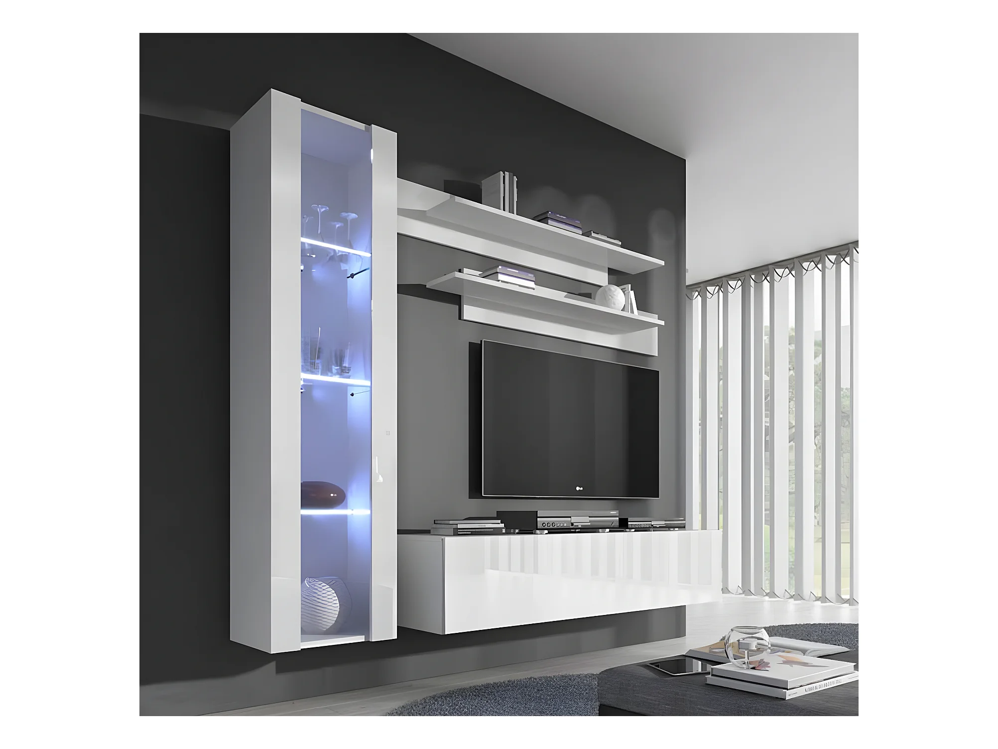 Meuble tv mural pour Salon Salle à manger en Blanc avec LED 210x40x160cm Nora 2