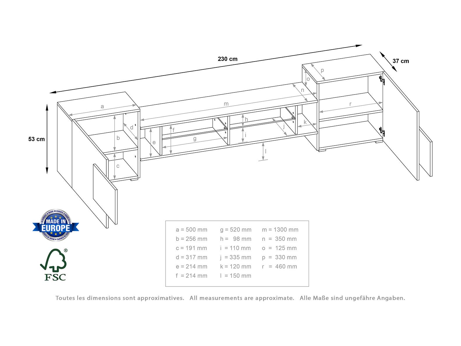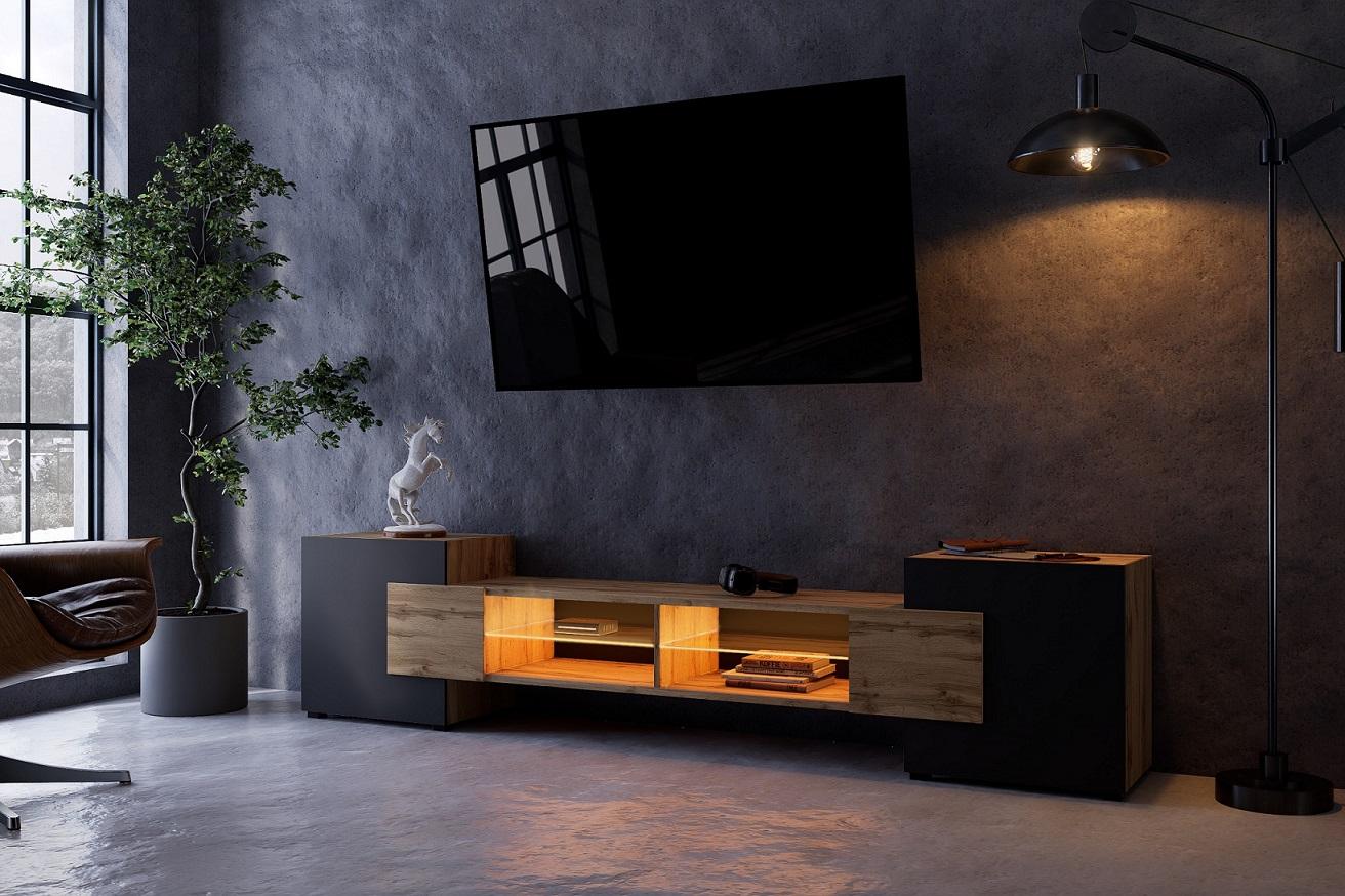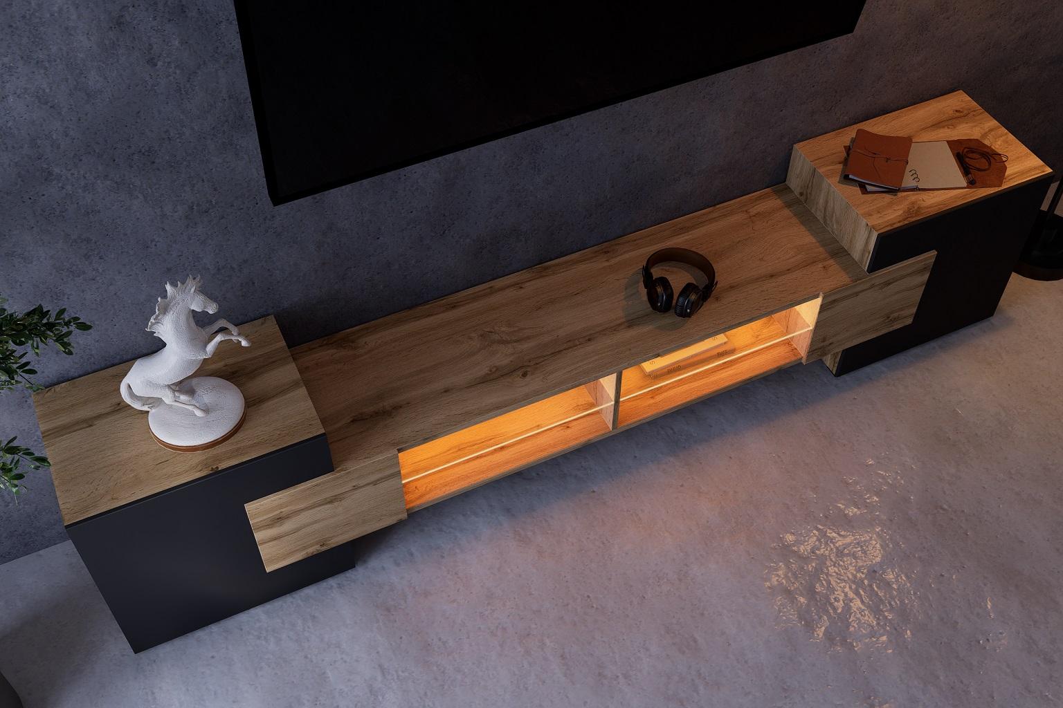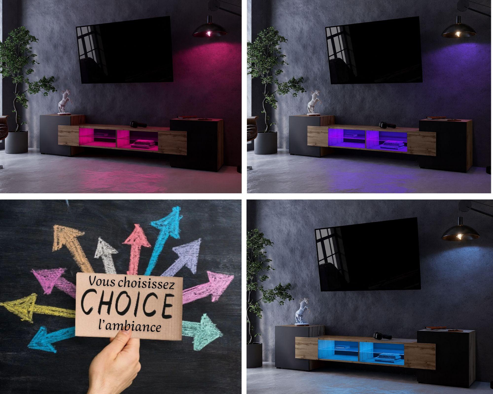 Meuble TV PABLO 230 cm Bois Chêne et Noir Mat avec LED RGB