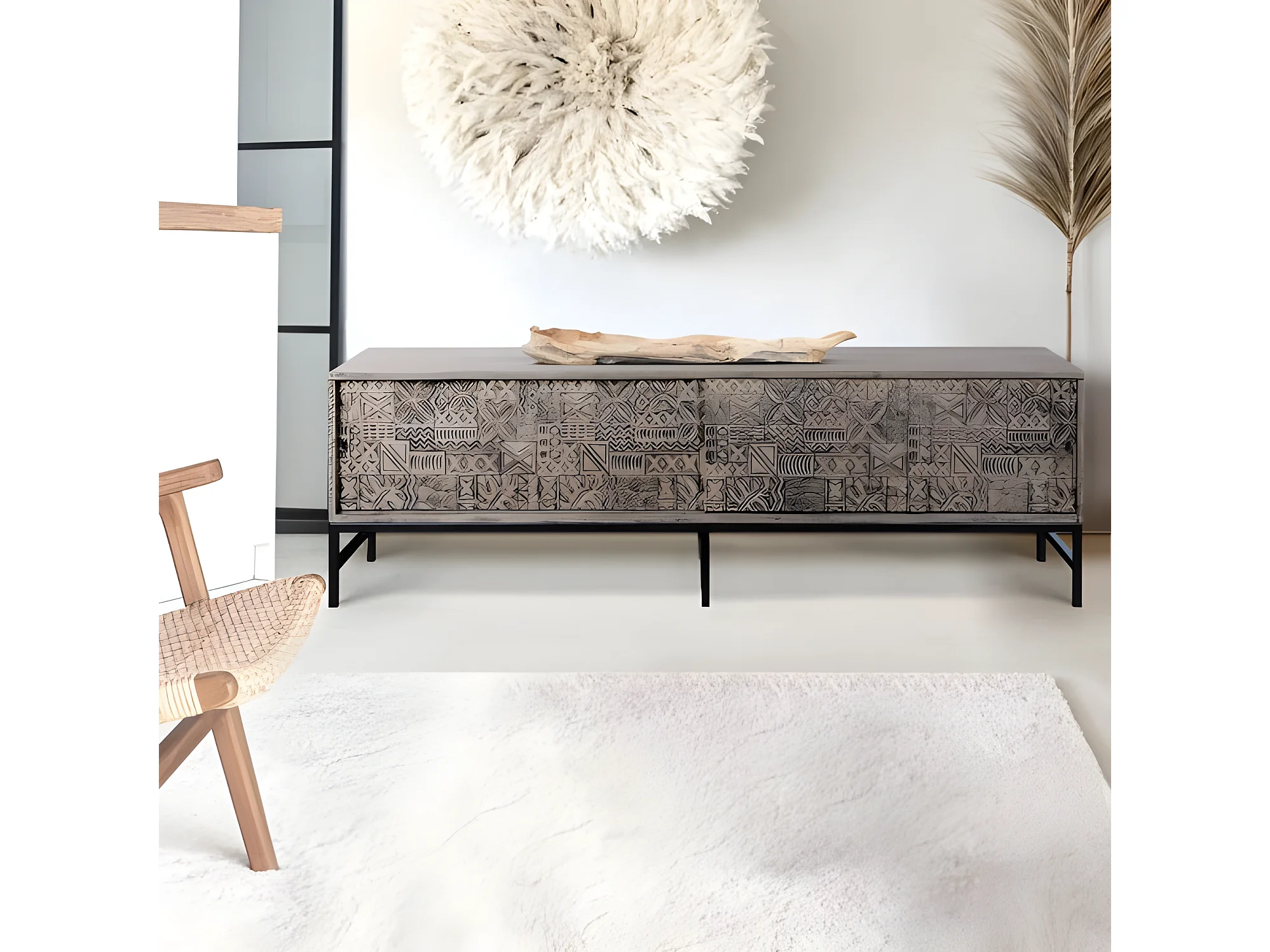 Meuble TV porte coulissante en métal et bois massif exotique sculpté WAKA
