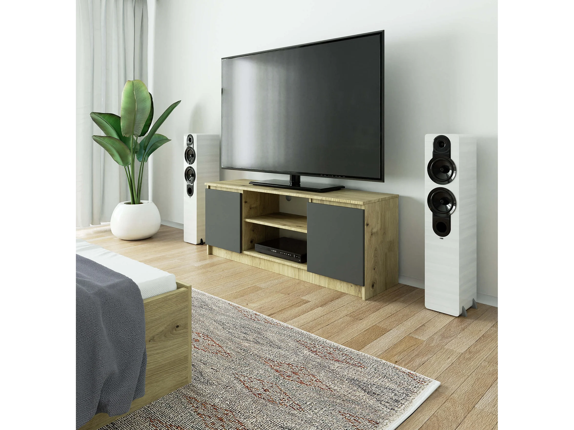Meuble TV pour salon AKORD Chêne Artisan 140 cm 2 portes façade Gris Graphite 2 étagères 140x40x55 cm
