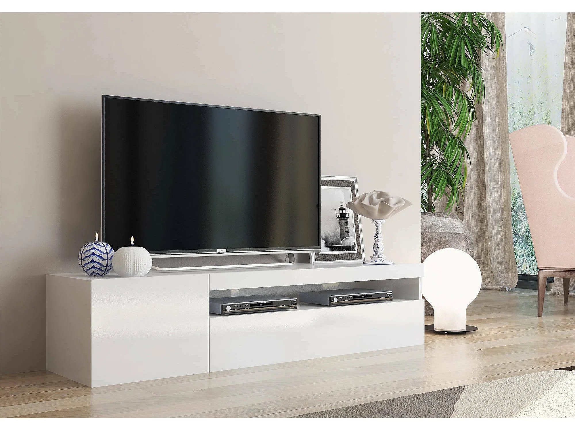 Meuble TV Roberto, Buffet bas de salon avec 2 portes, Base pour meuble TV, 100% Made in Italy, 150x40h37 cm, Blanc brillant
