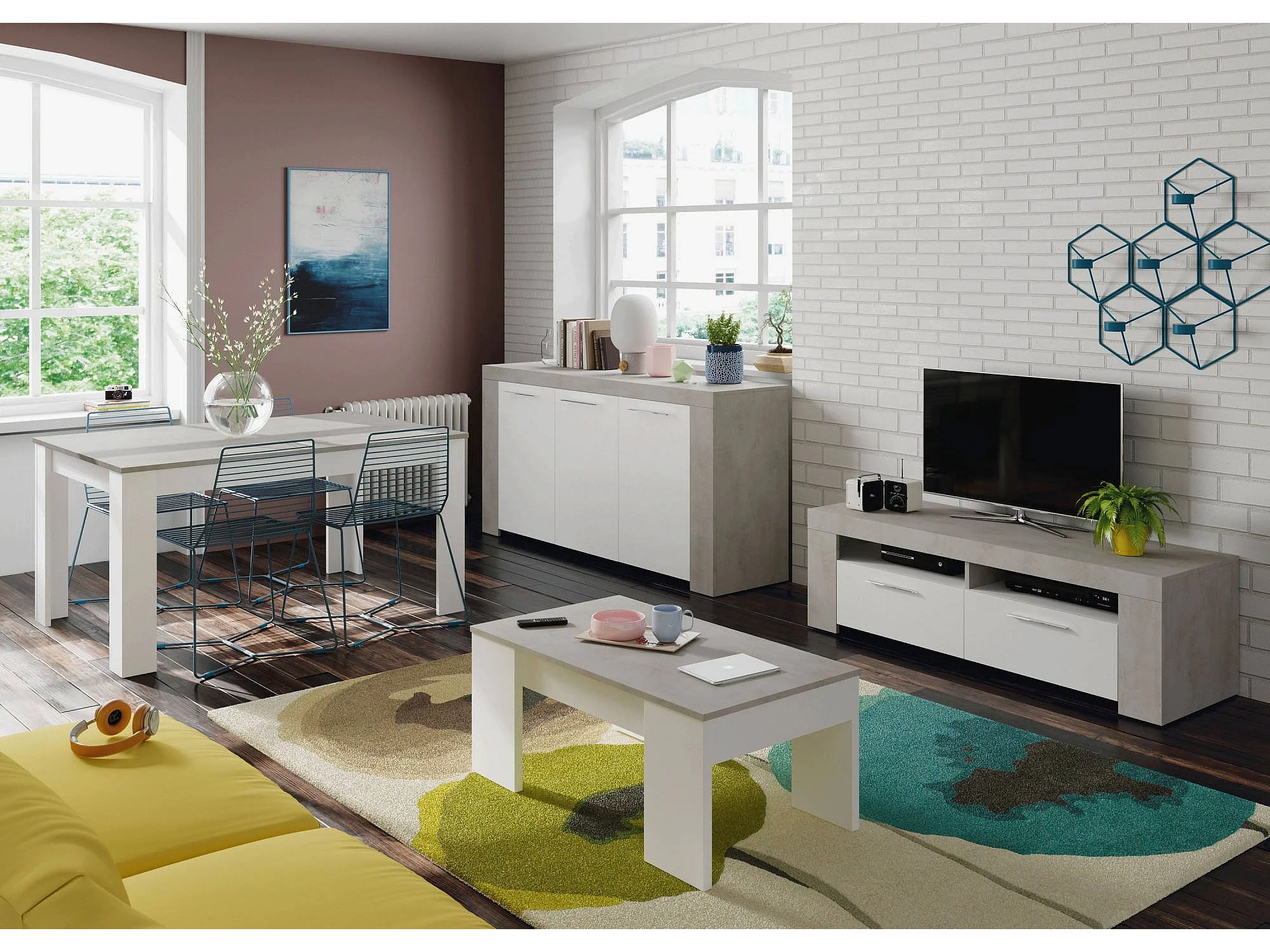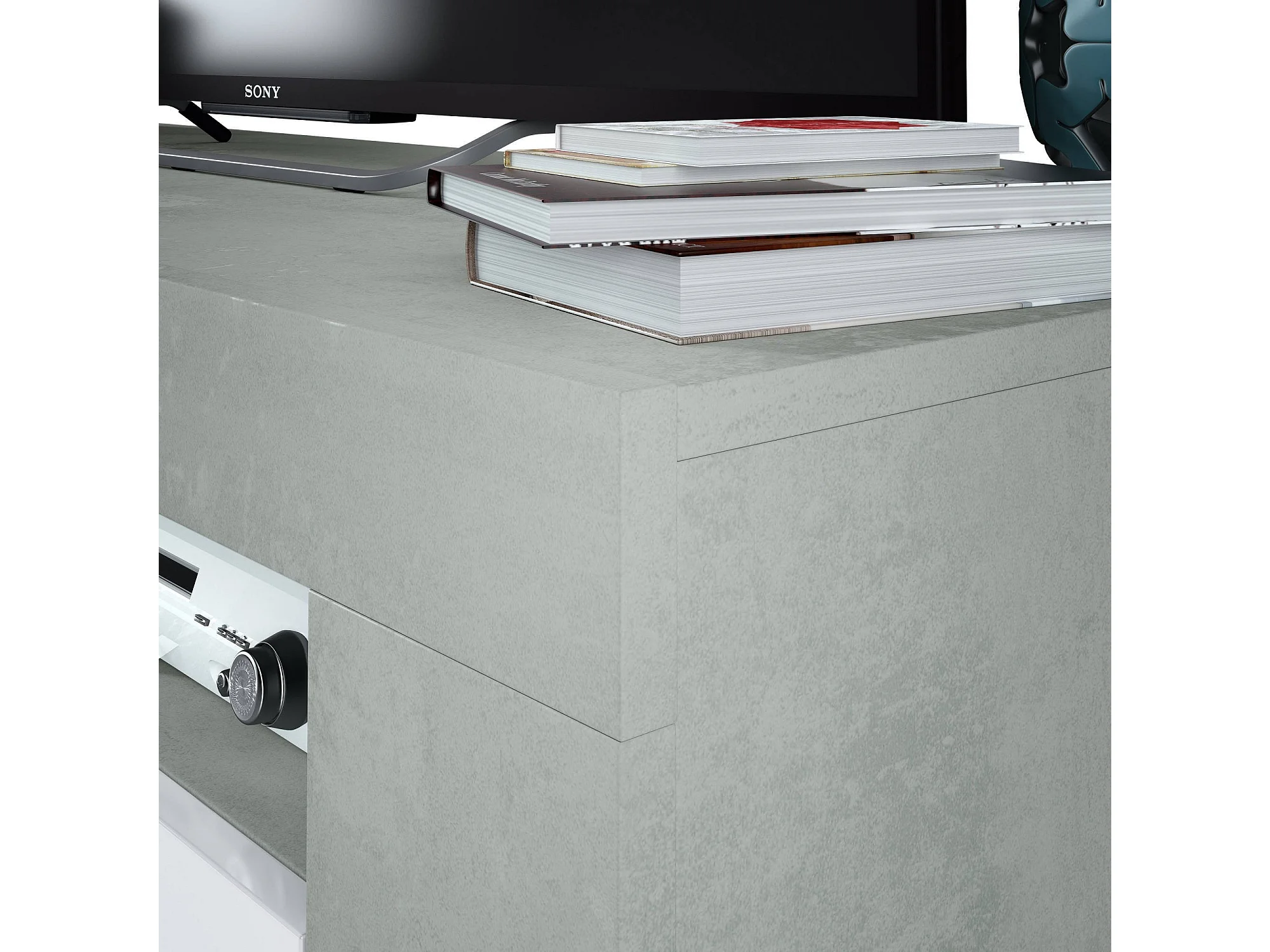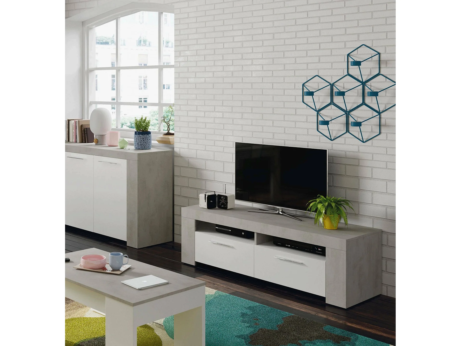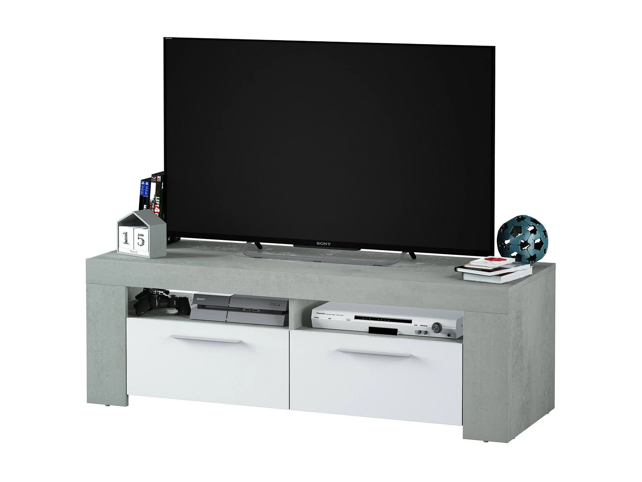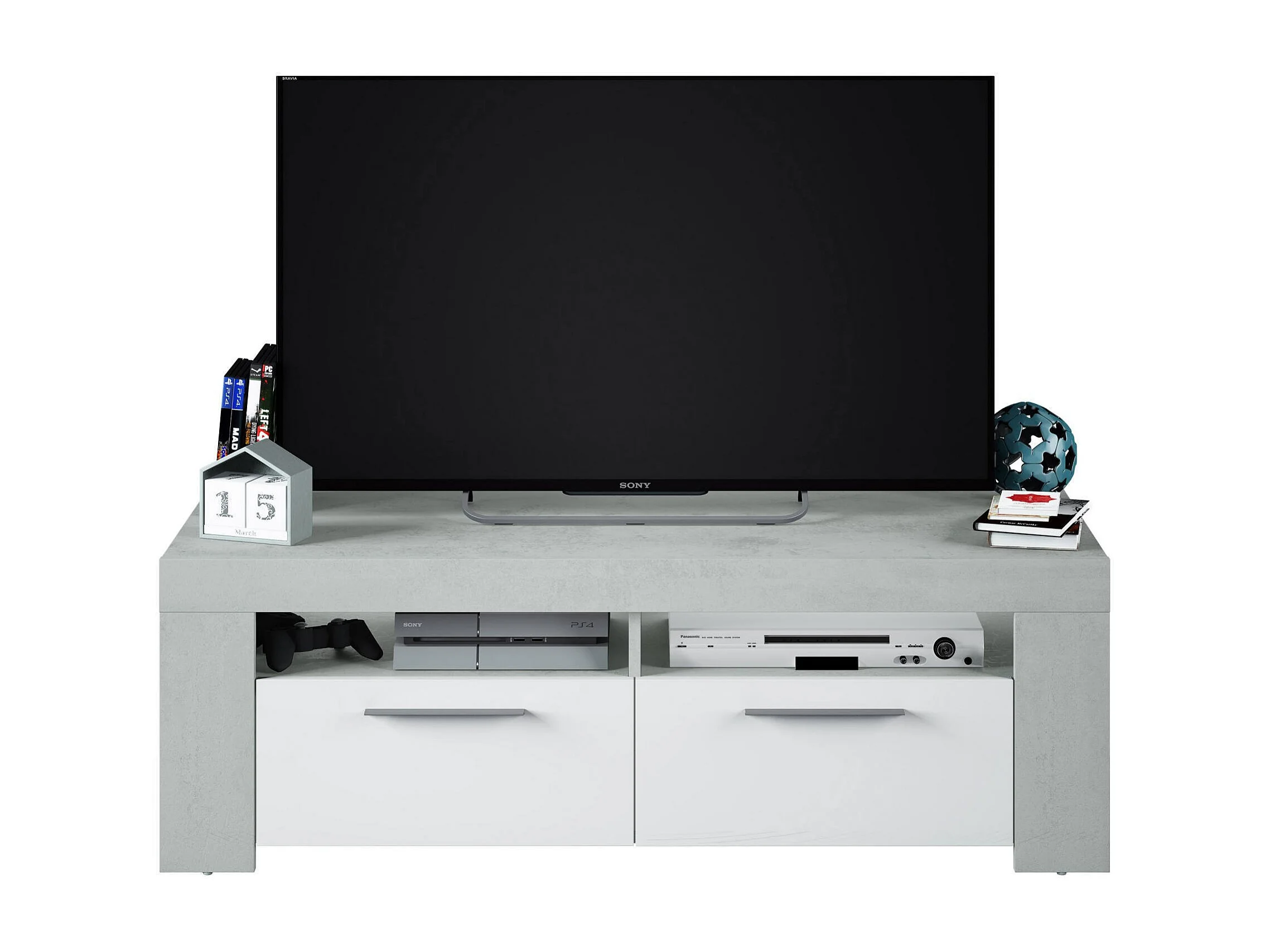 Meuble TV Stamford, Buffet pour télévision de salon, Meuble TV 2 portes, Buffet bas pour salon, 120x42h40 cm, Blanc et Ciment