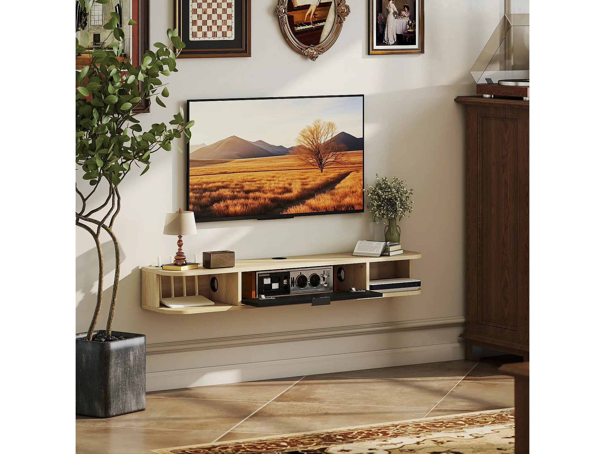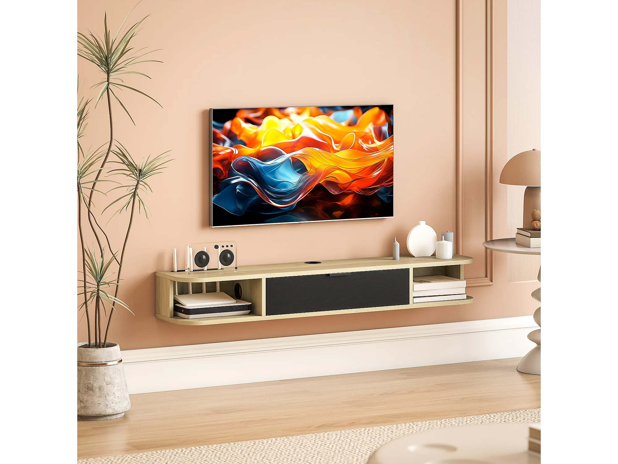 Meuble TV mural flottant design - étagère murale flottante - niche, passe-fils - panneaux particules chêne clair