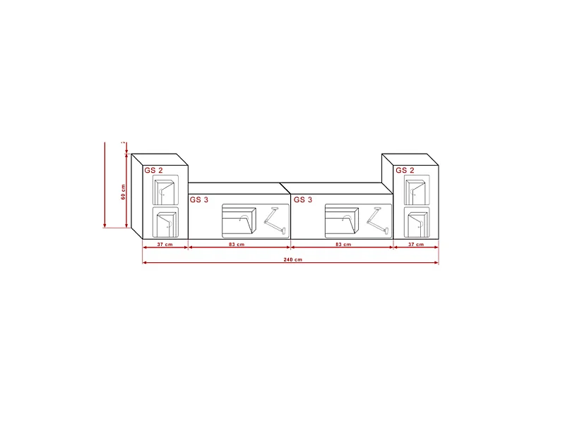 Meuble TV suspendu 240cm collection CEPTO, 4 portes, coloris noir brillant.