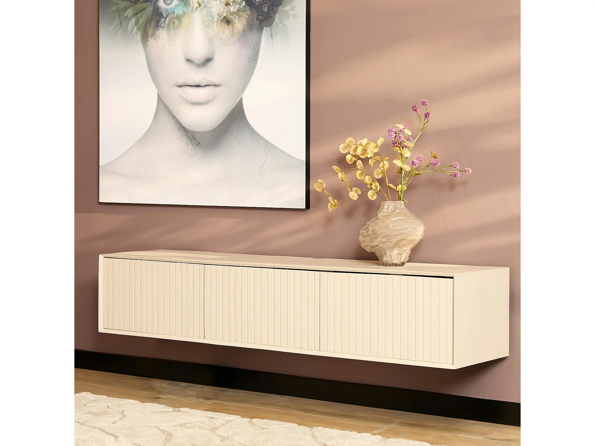 Meuble TV suspendu bois sable 3 portes rainurées CORTINA