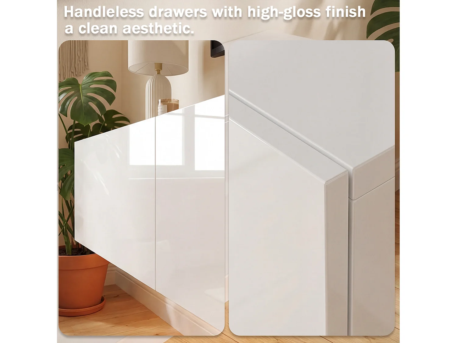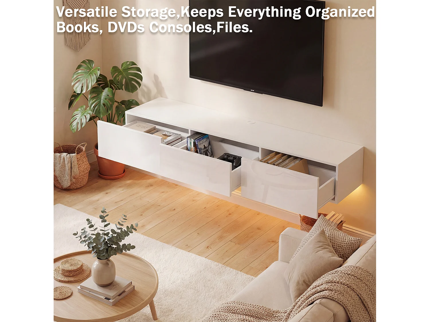 Meuble TV Mural avec 3 Tiroirs pour Salon, Meuble Bas Suspendu à Lumière LED Réglable, 160 x 35 x25cm, Blanc Brillant