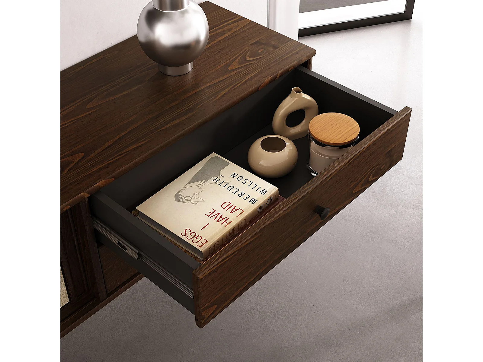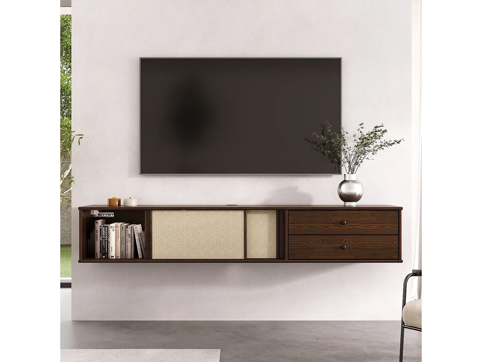 Meuble TV Suspendu SIMONA 175 cm avec 2 Tiroirs et 2 Portes Coulissantes en Rotin, En Bois Massif Coloris Noyer