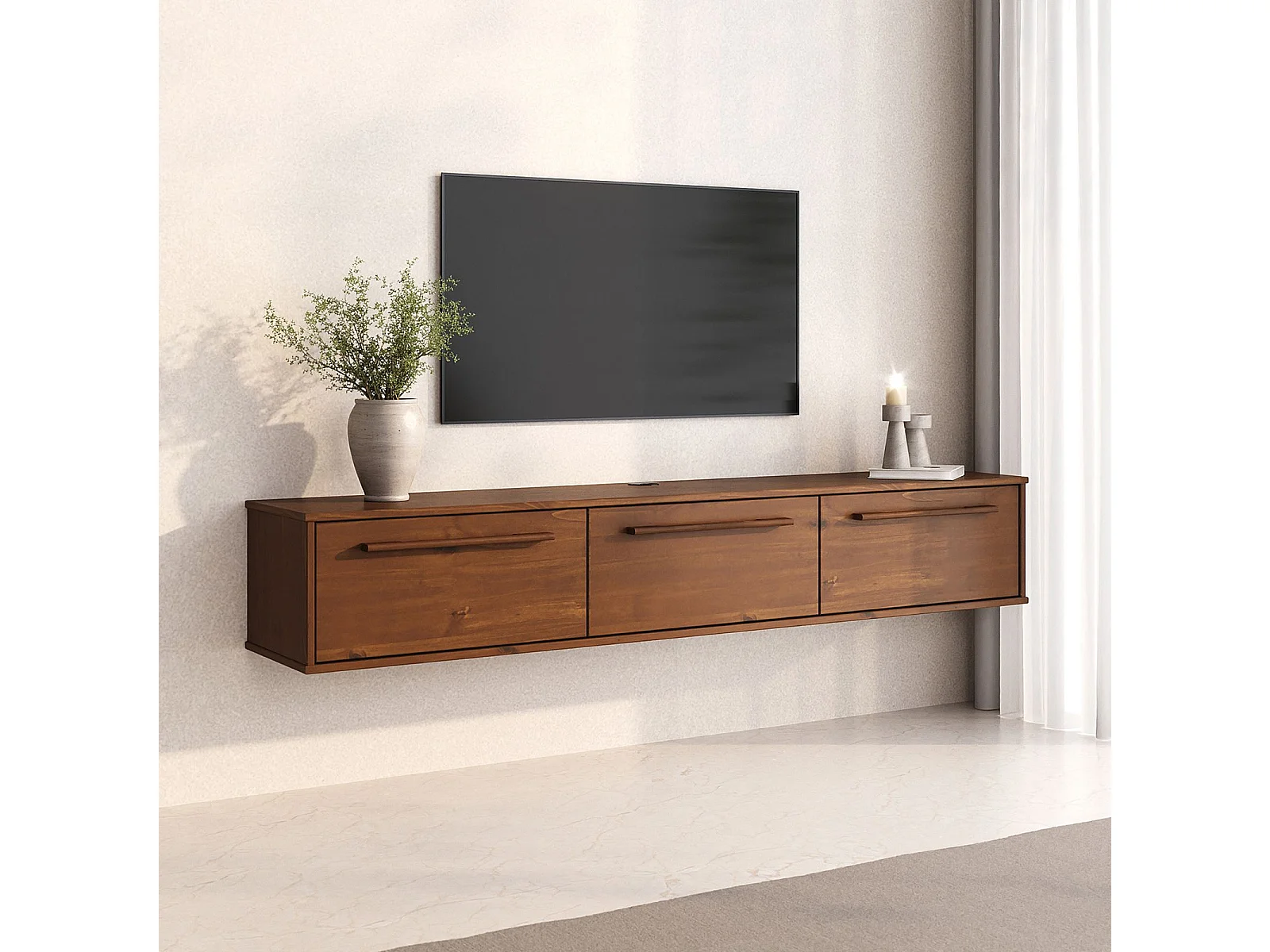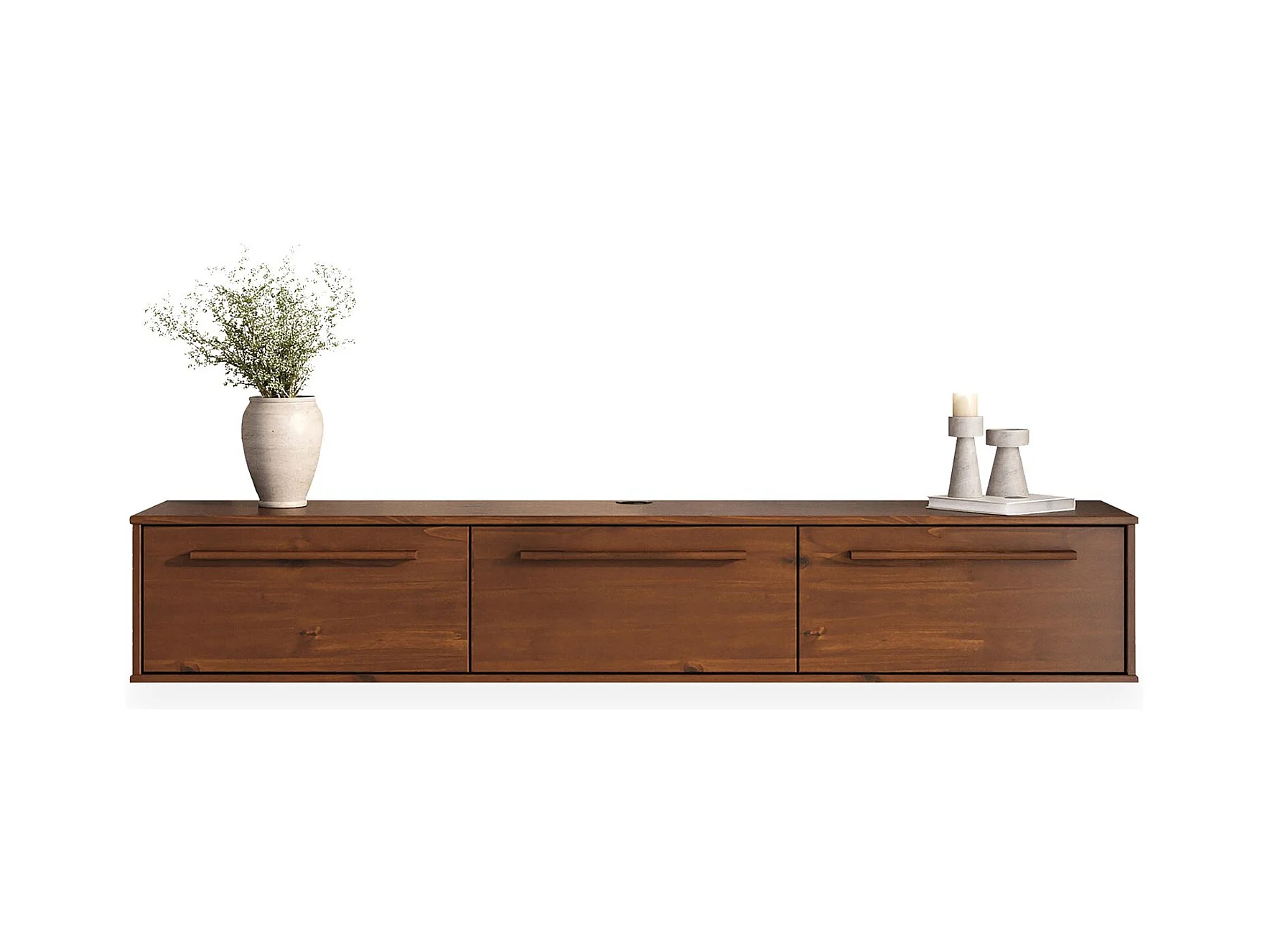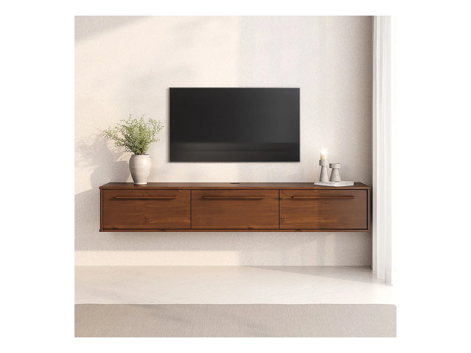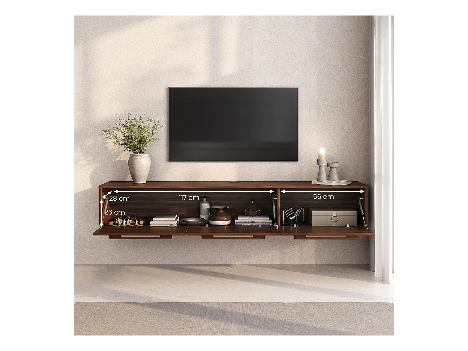 Meuble TV Suspendu TECCA L 180 cm en Bois Massif Coloris Châtaignier avec 3 Portes, Meuble Télé Mural Design Moderne