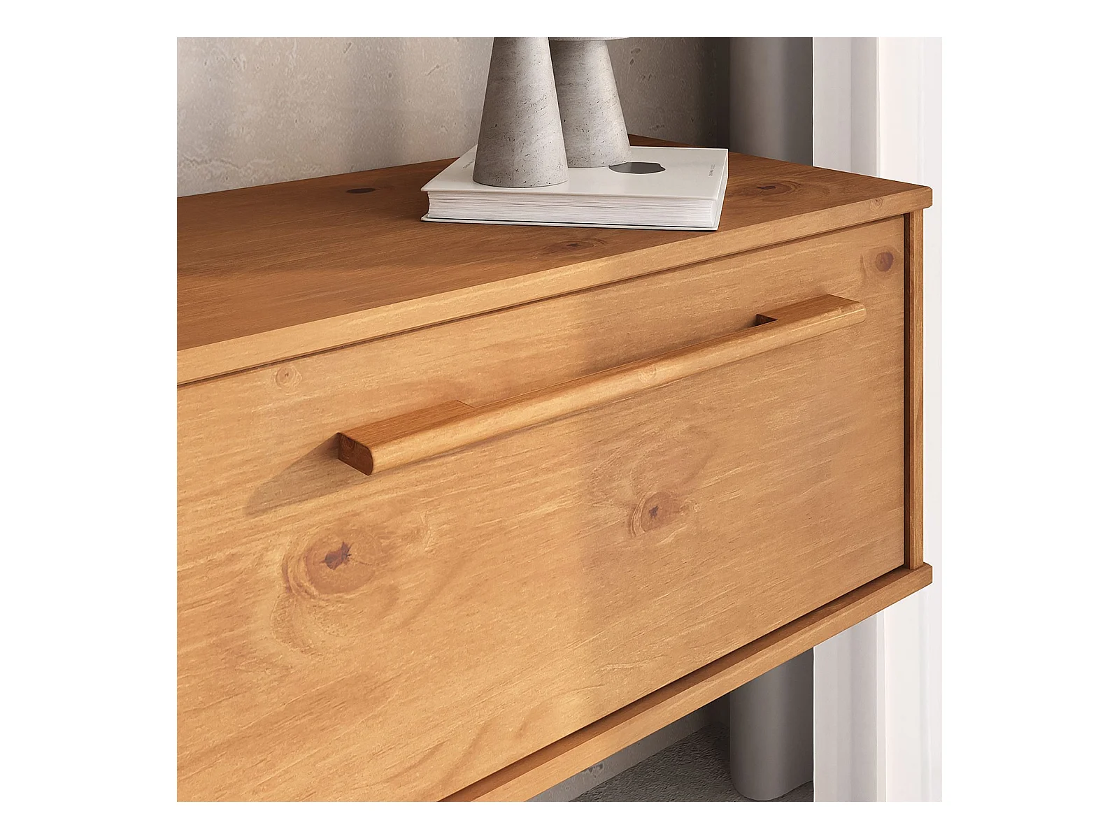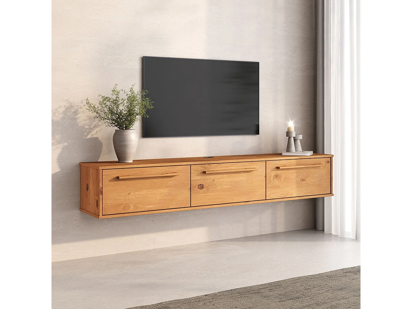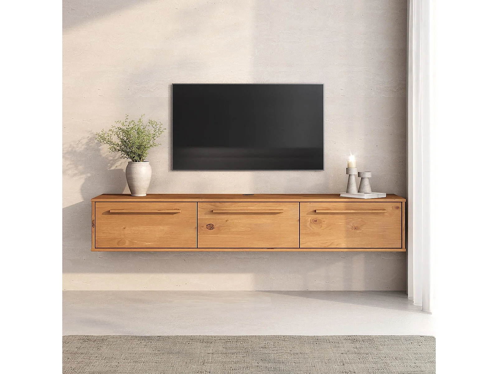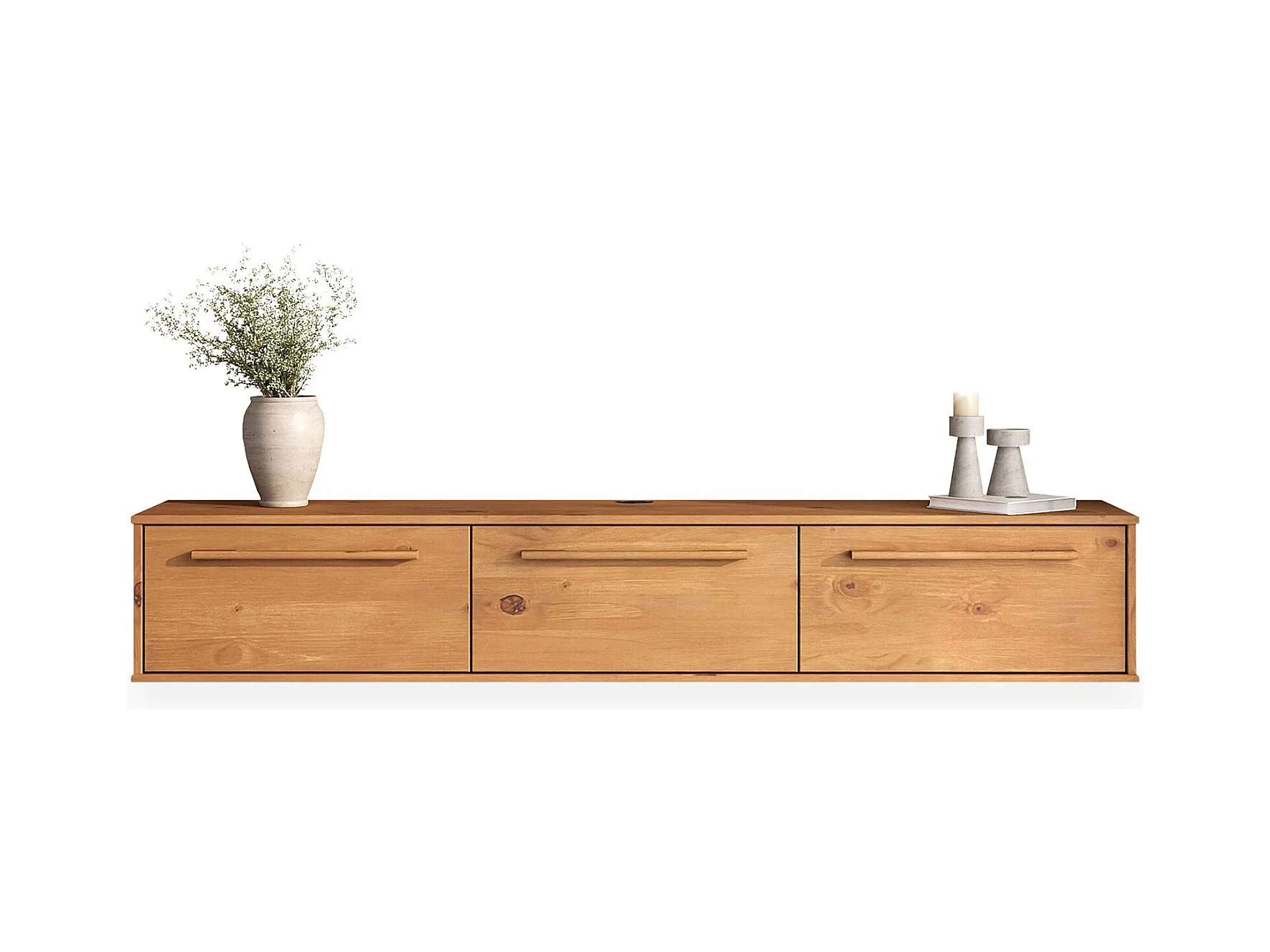 Meuble TV Suspendu TECCA L 180 cm en Bois Massif Coloris chêne avec 3 Portes, Meuble Télé Mural Design Moderne