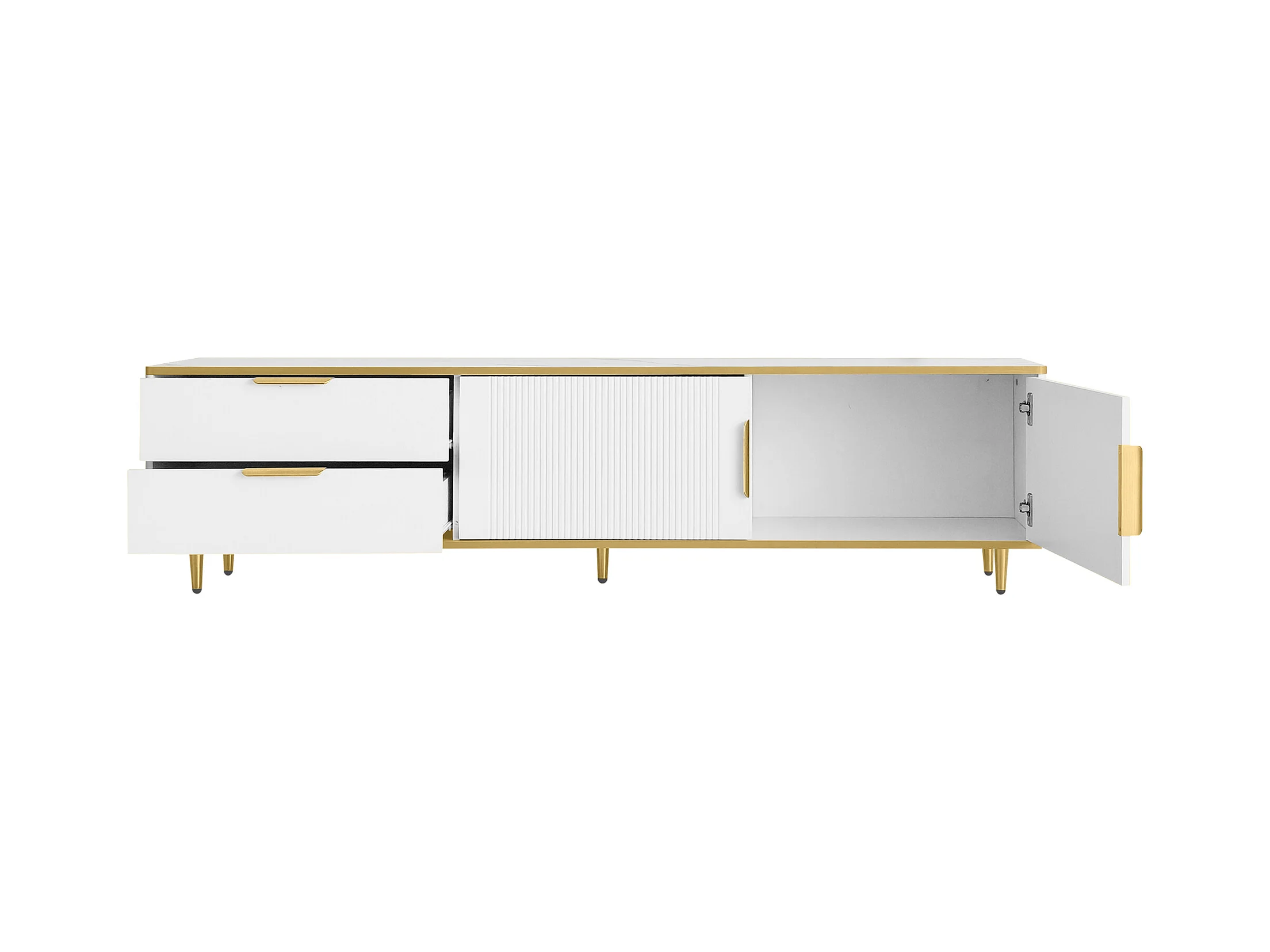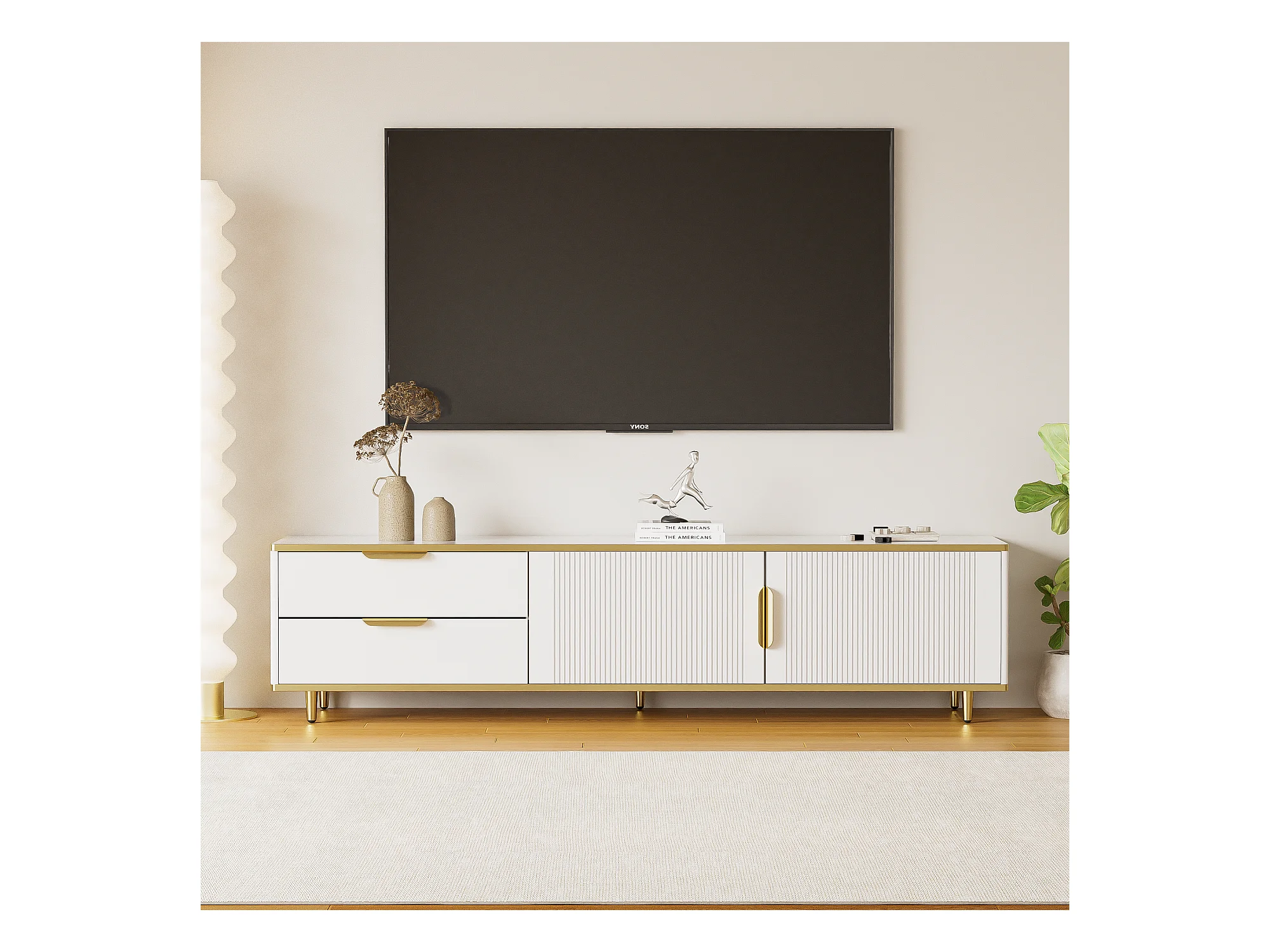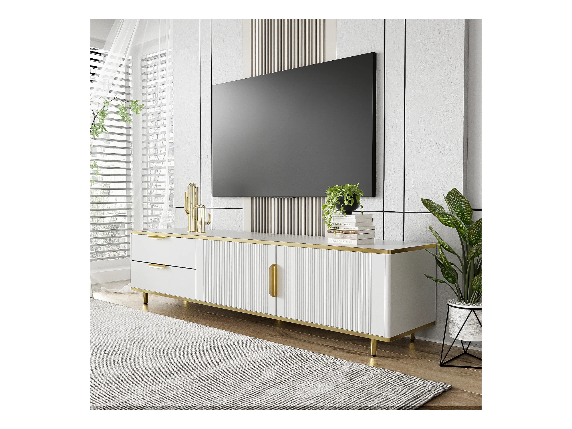 Meuble TV, table basse avec texture sculptée, poignées et pieds dorés, meuble pour salon avec structure en marbre