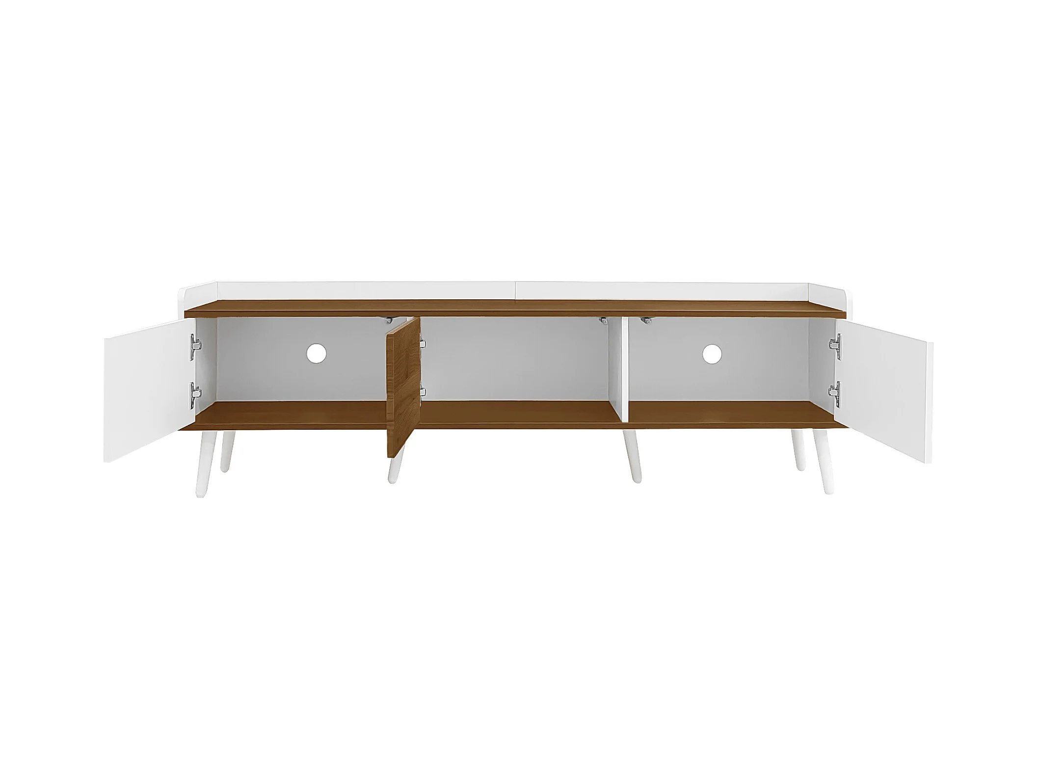 Meuble TV, table TV, support TV, meuble bas à trois portes, construction compacte, finition blanche et bois naturel, dimensions : H 49,5 cm / L 160 cm / P 39 cm.