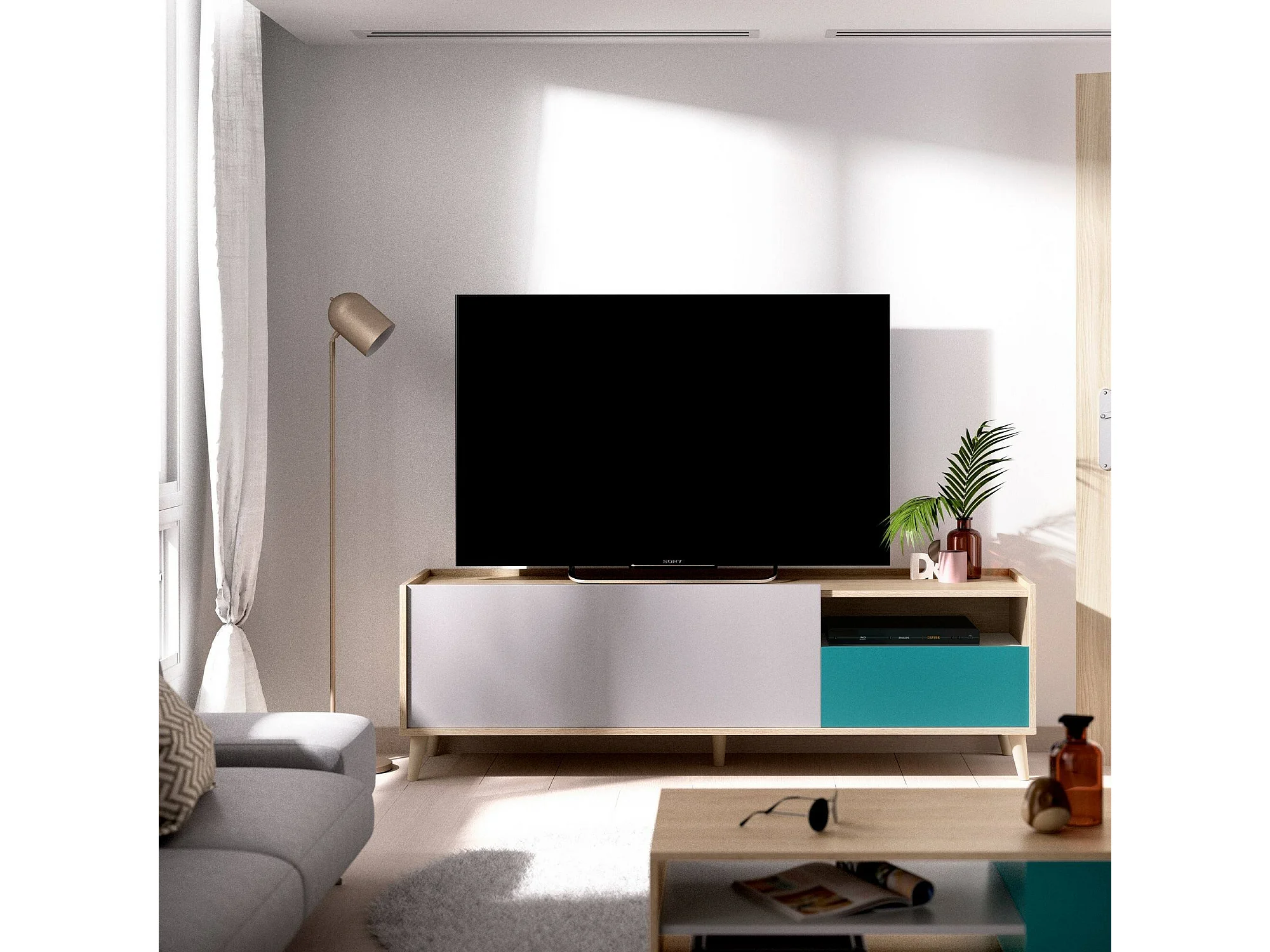 Meuble TV Tamaro, Buffet bas de salon, Buffet de salon pour télévision, 155x43h47 cm, Chêne et Blanc