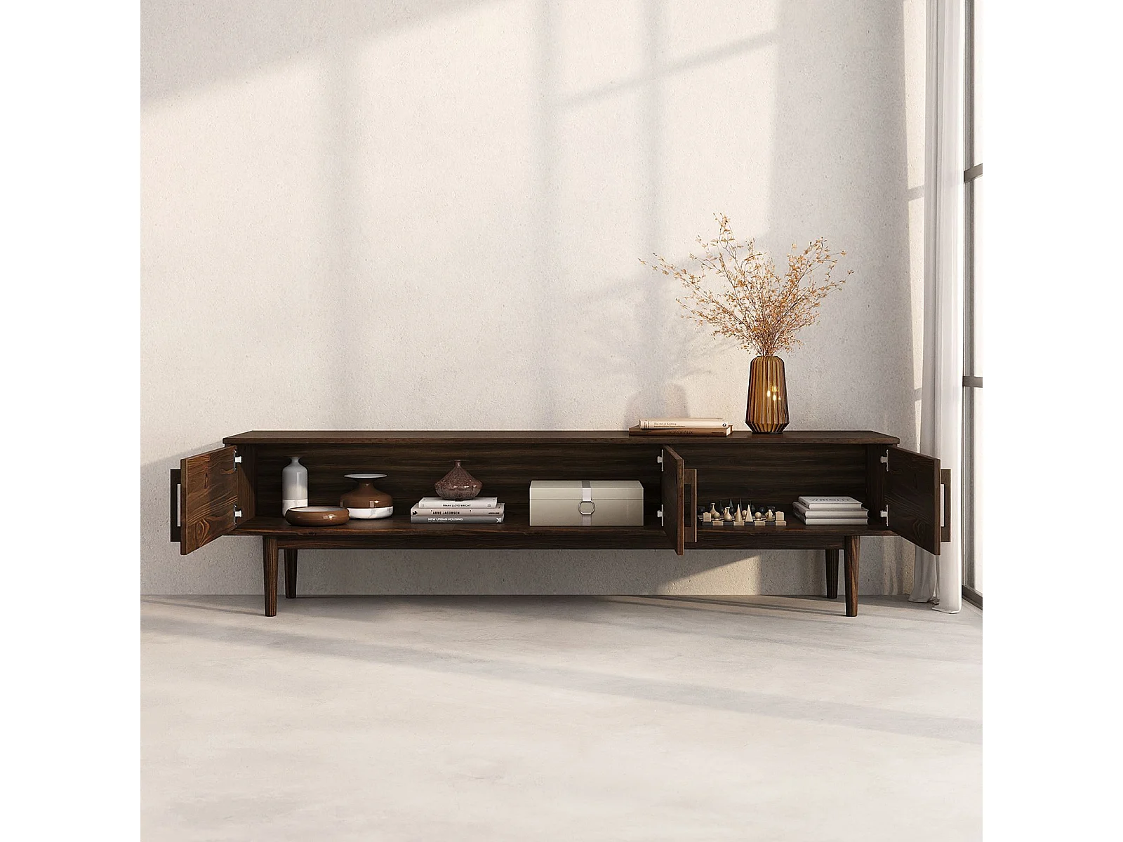Meuble TV TECCA L 180 cm en Bois Massif Coloris Noyer avec 3 Portes, Pour téléviseur jusqu'à 80", Meuble Télé avec Rangement