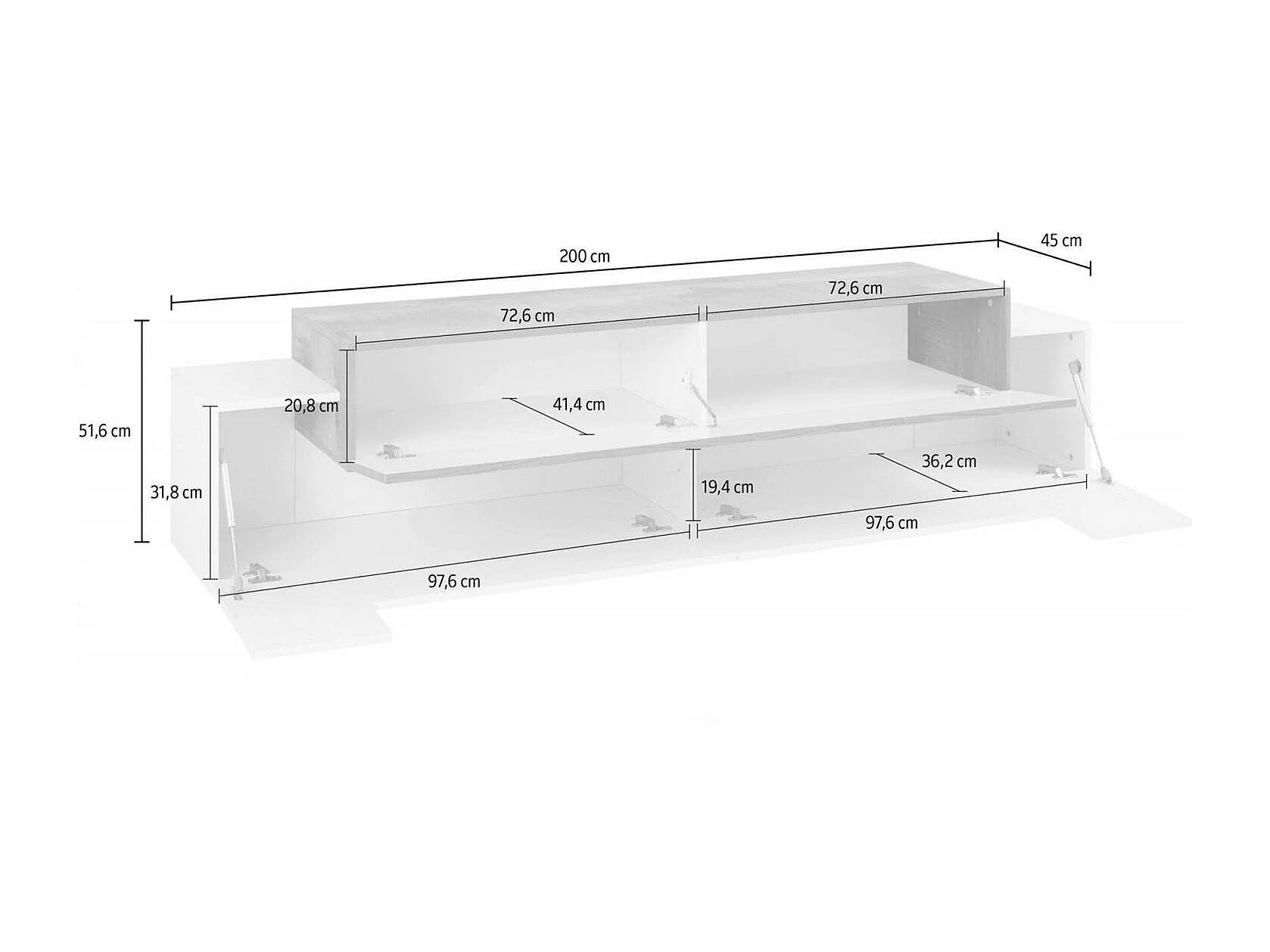 Meuble TV Teo, Buffet bas de salon, Base pour meuble TV, 100% Made in Italy, 200x45h52 cm, Blanc brillant et érable