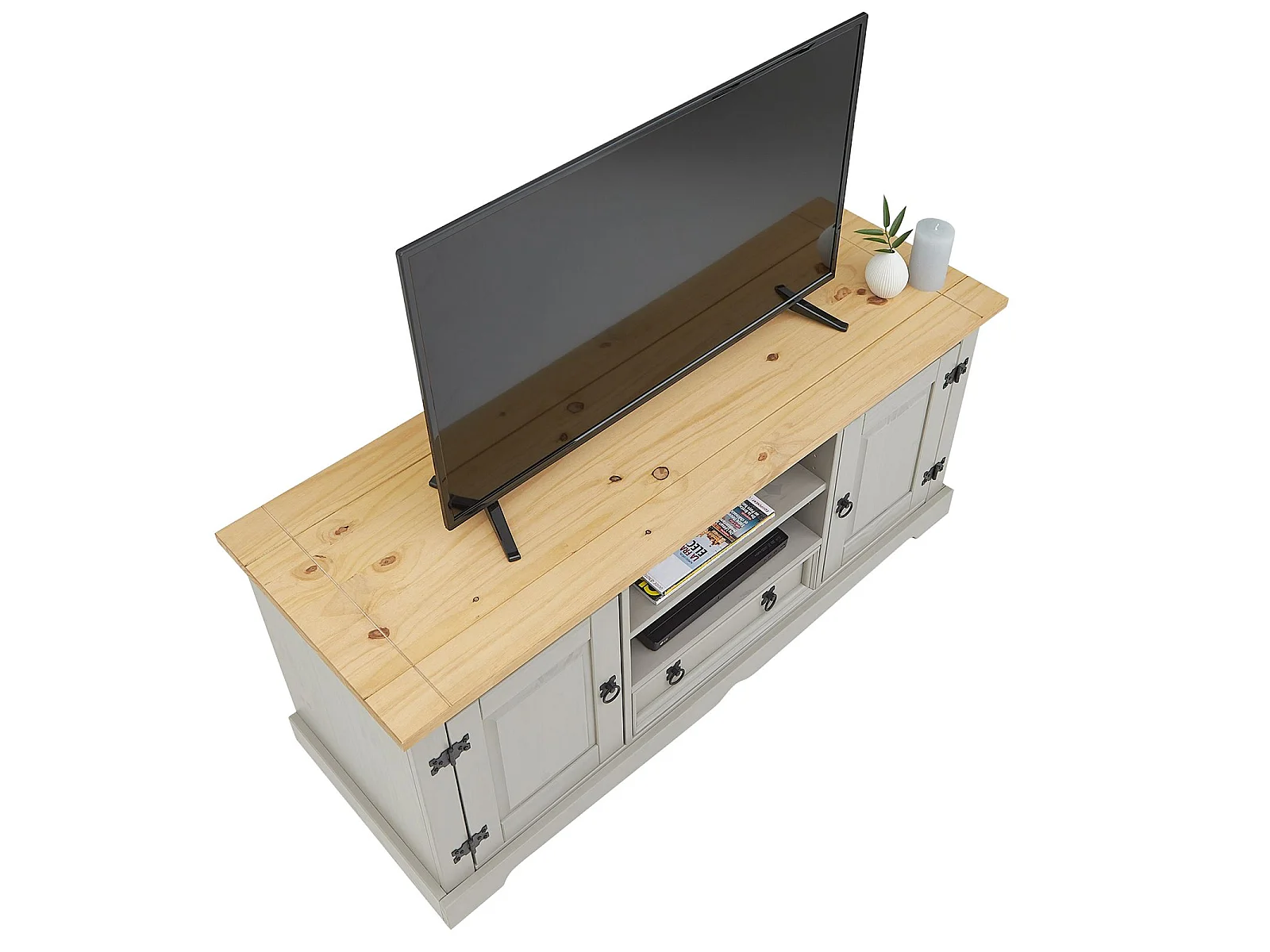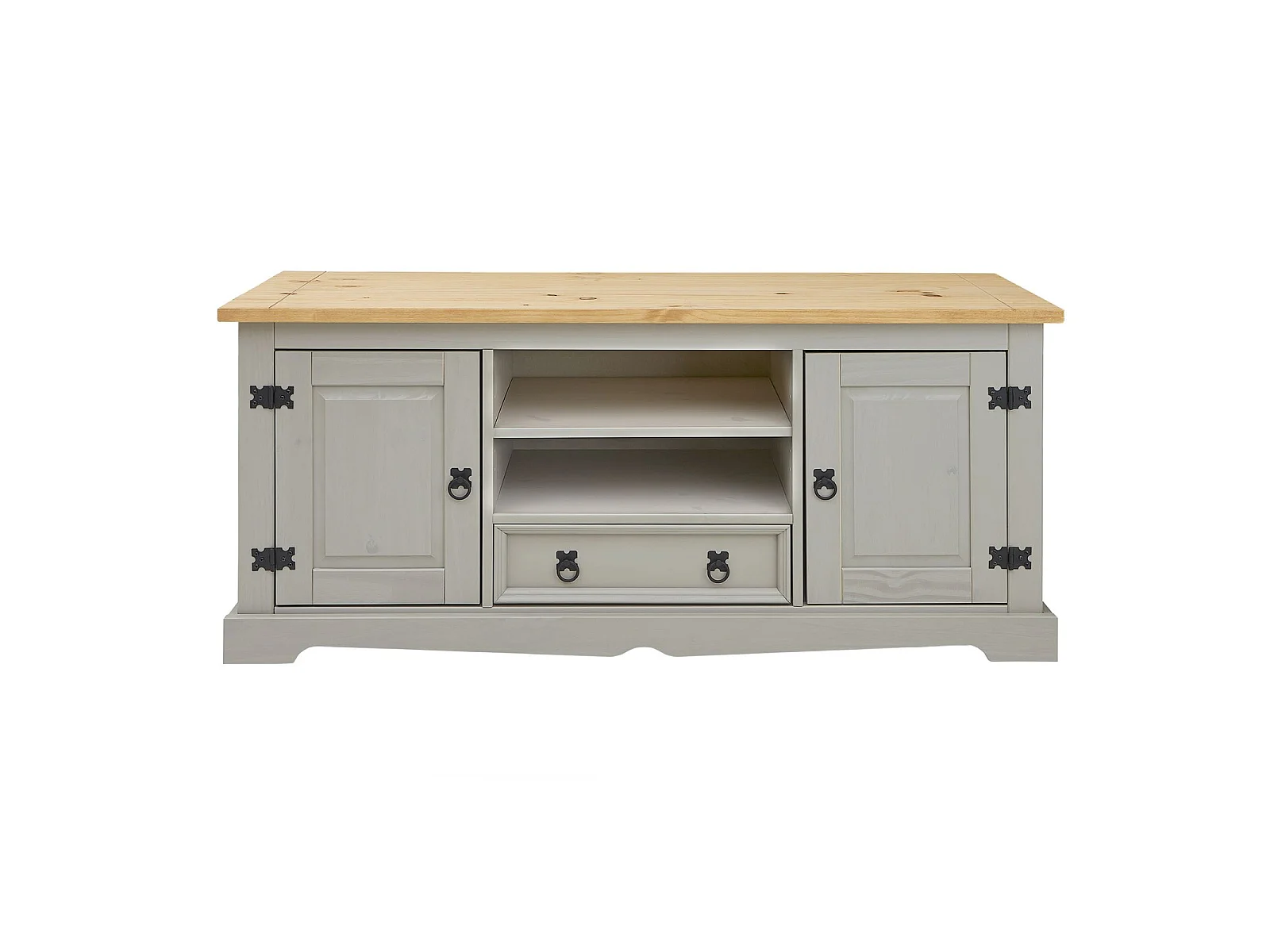 Meuble TV TEQUILA banc télé de 140 cm style mexicain avec 1 tiroir 2 niches et 2 portes, en pin massif lasuré gris et brun