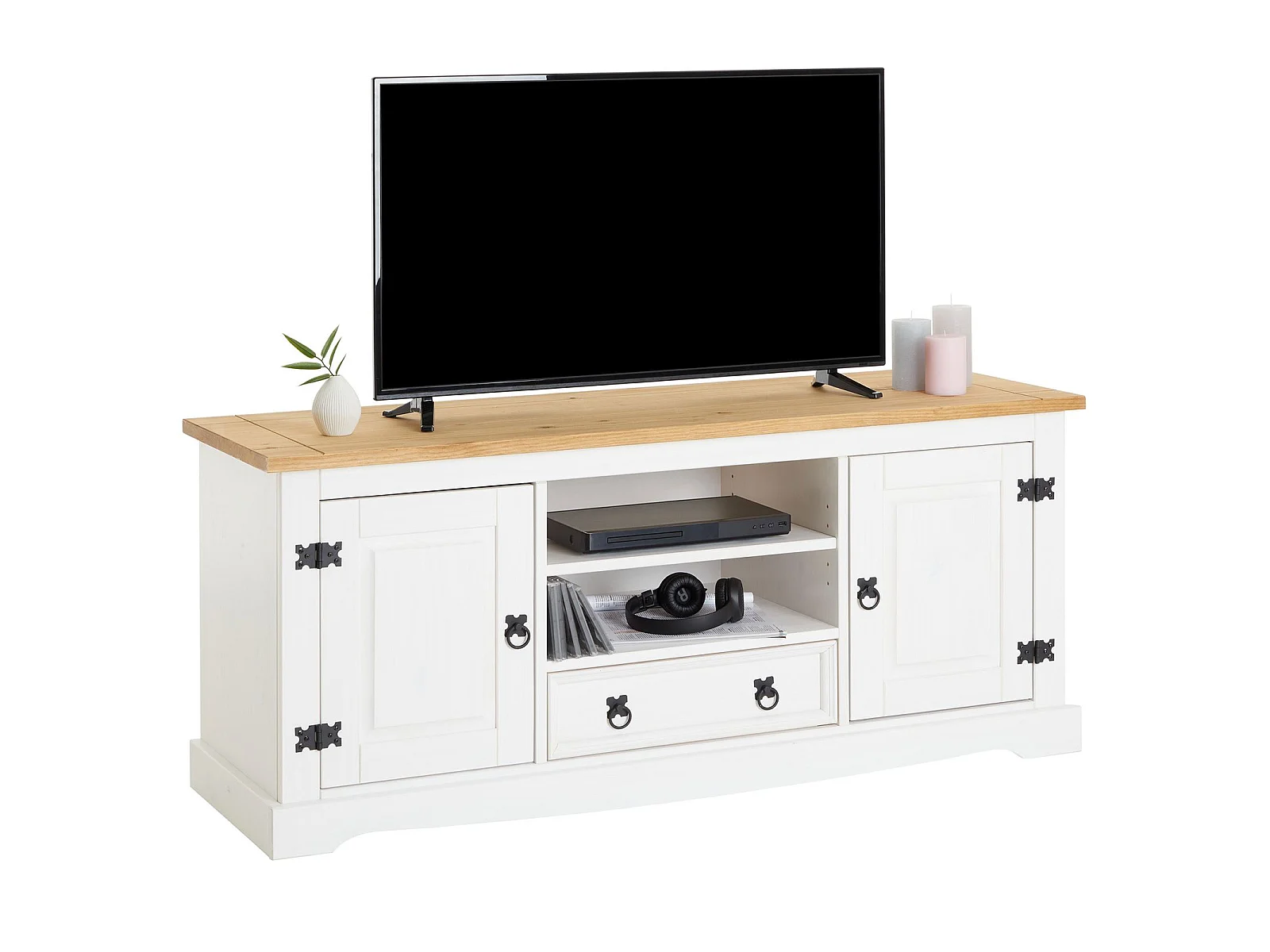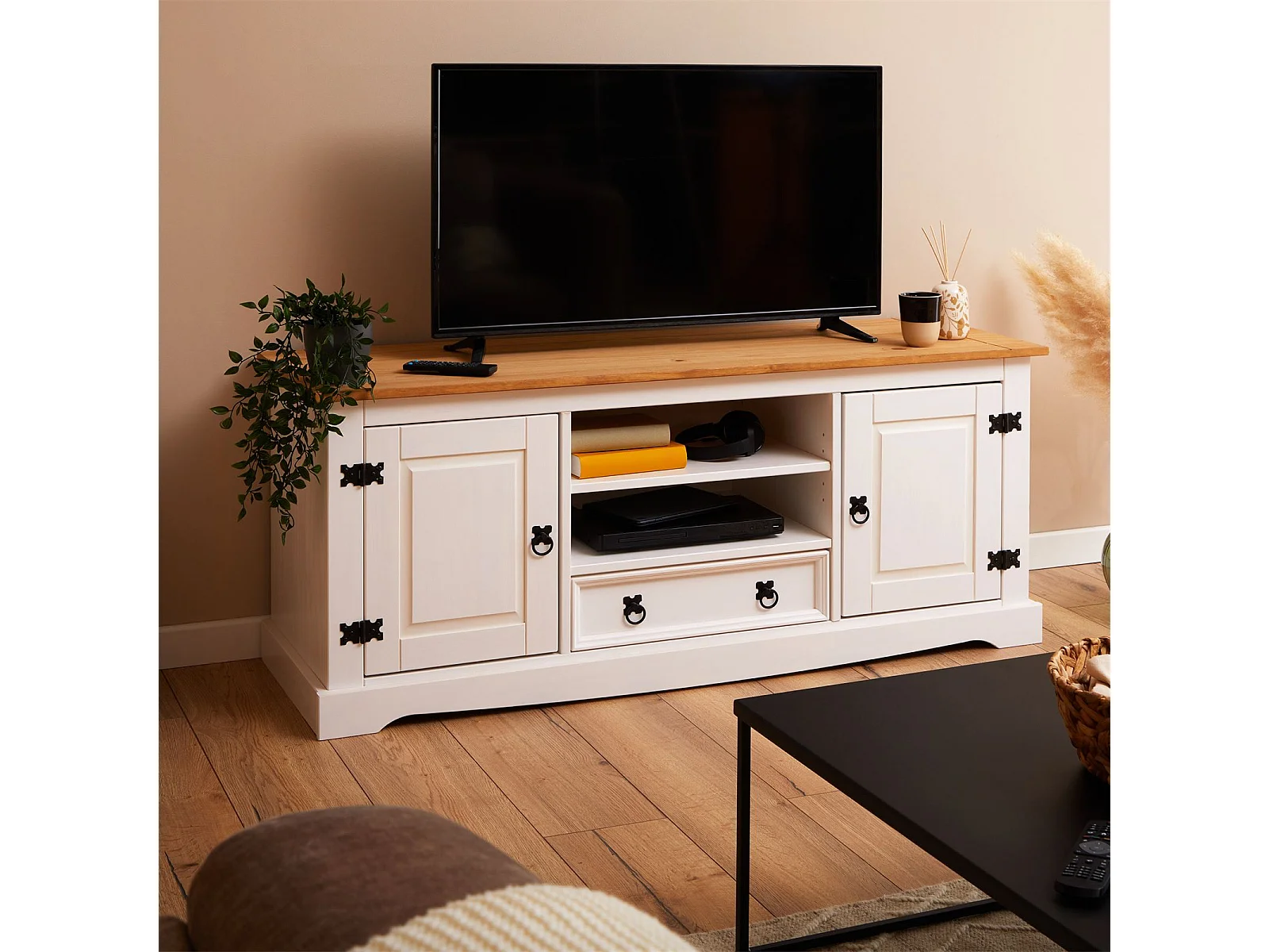Meuble TV TEQUILA de 140 cm en bois style mexicain avec 1 tiroir 2 niches et 2 portes, en pin massif lasuré blanc et brun