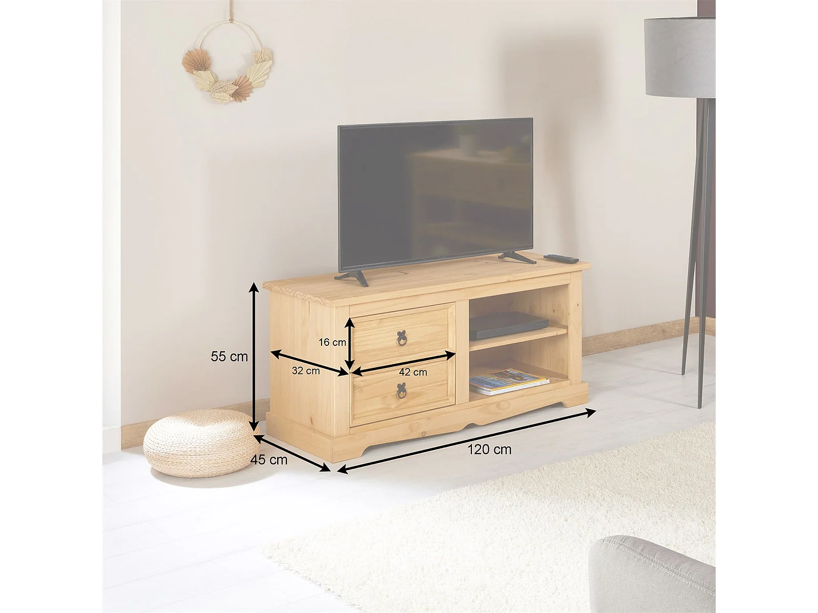 Meuble TV TEQUILA L 120 cm en bois massif brun avec 2 tiroirs et 2 niches, meuble de salon style mexicain