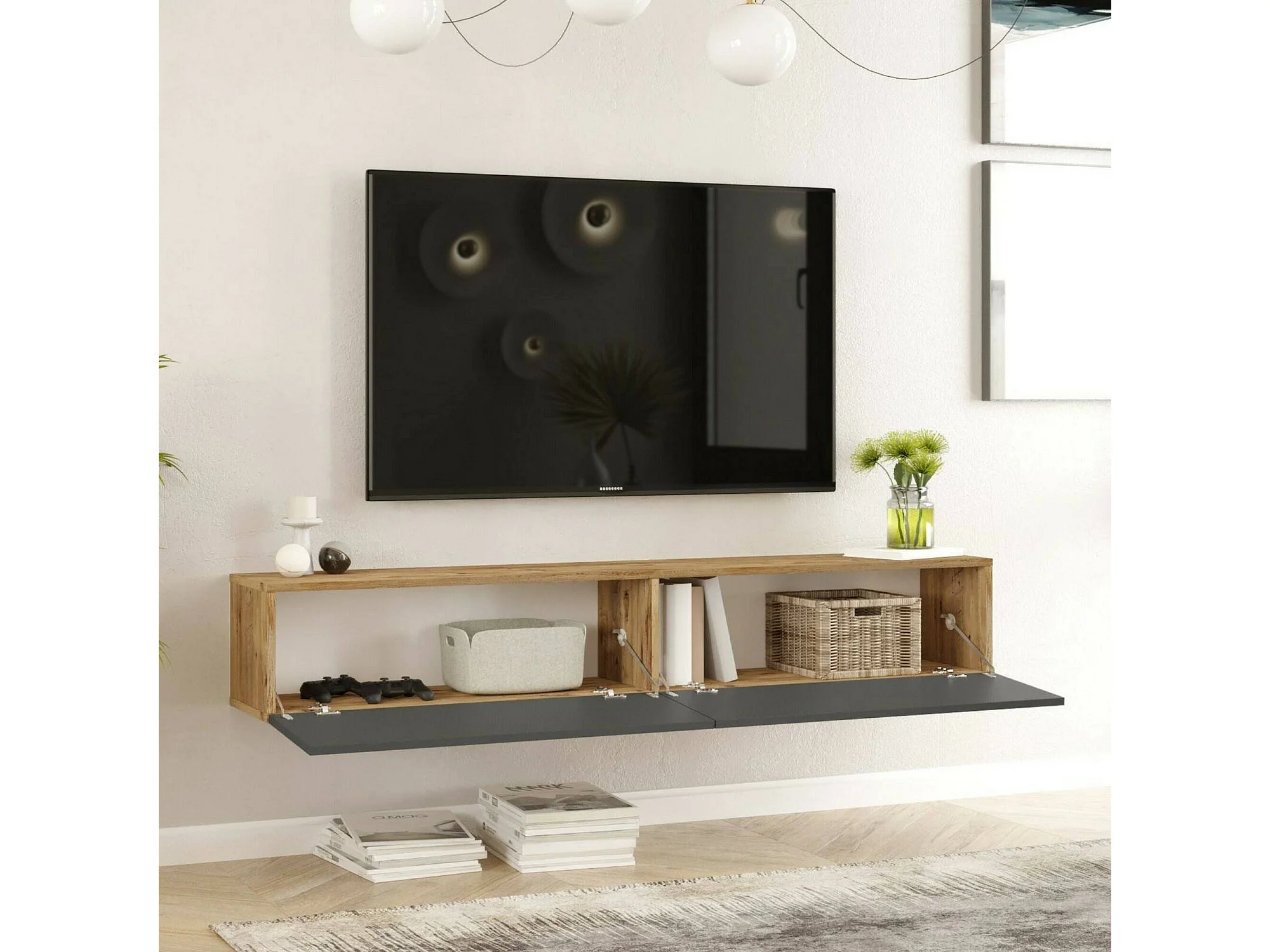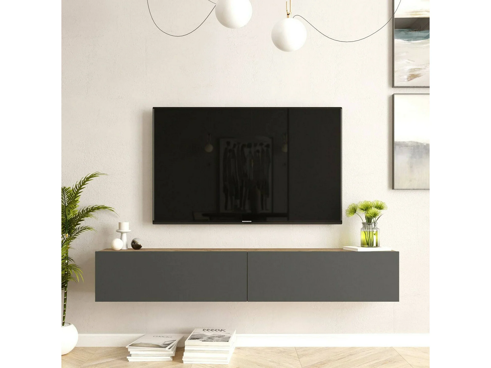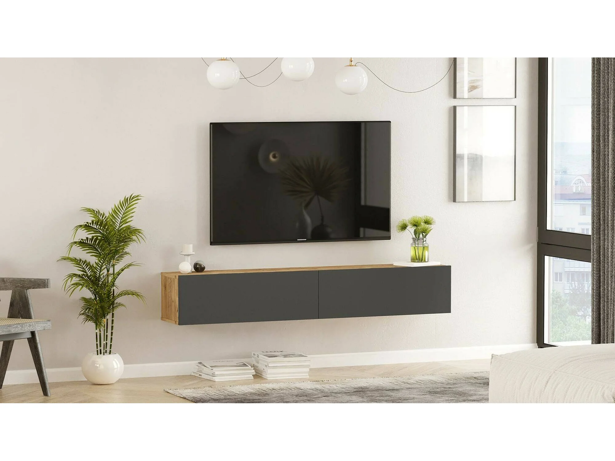 Meuble TV Thebe, Buffet de salon, Armoire basse pour TV, Base murale de rangement, 180x32h30 cm, Chêne et Anthracite