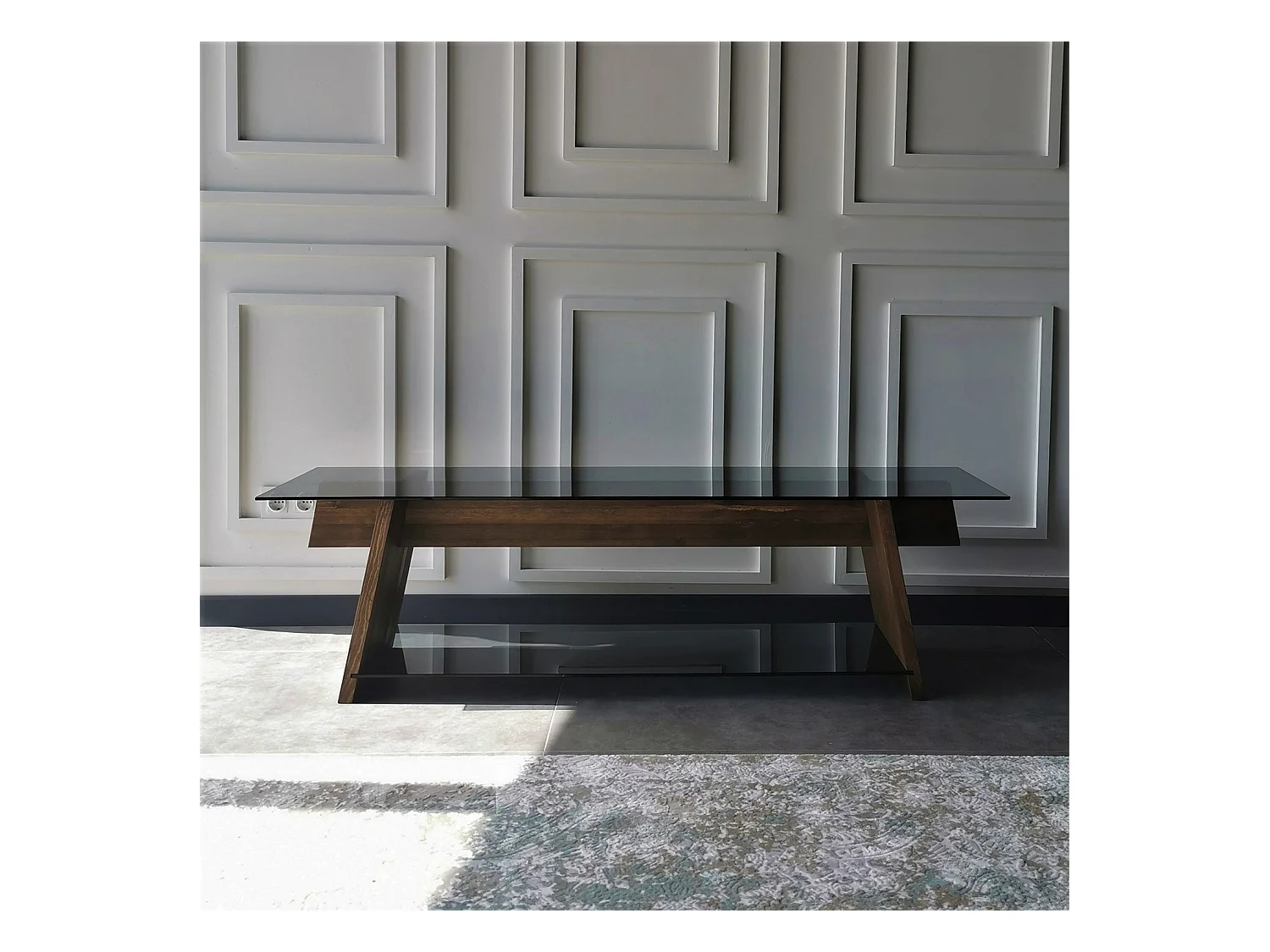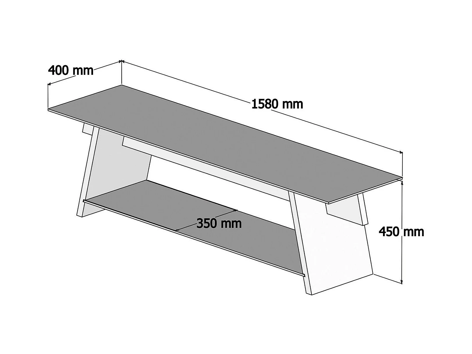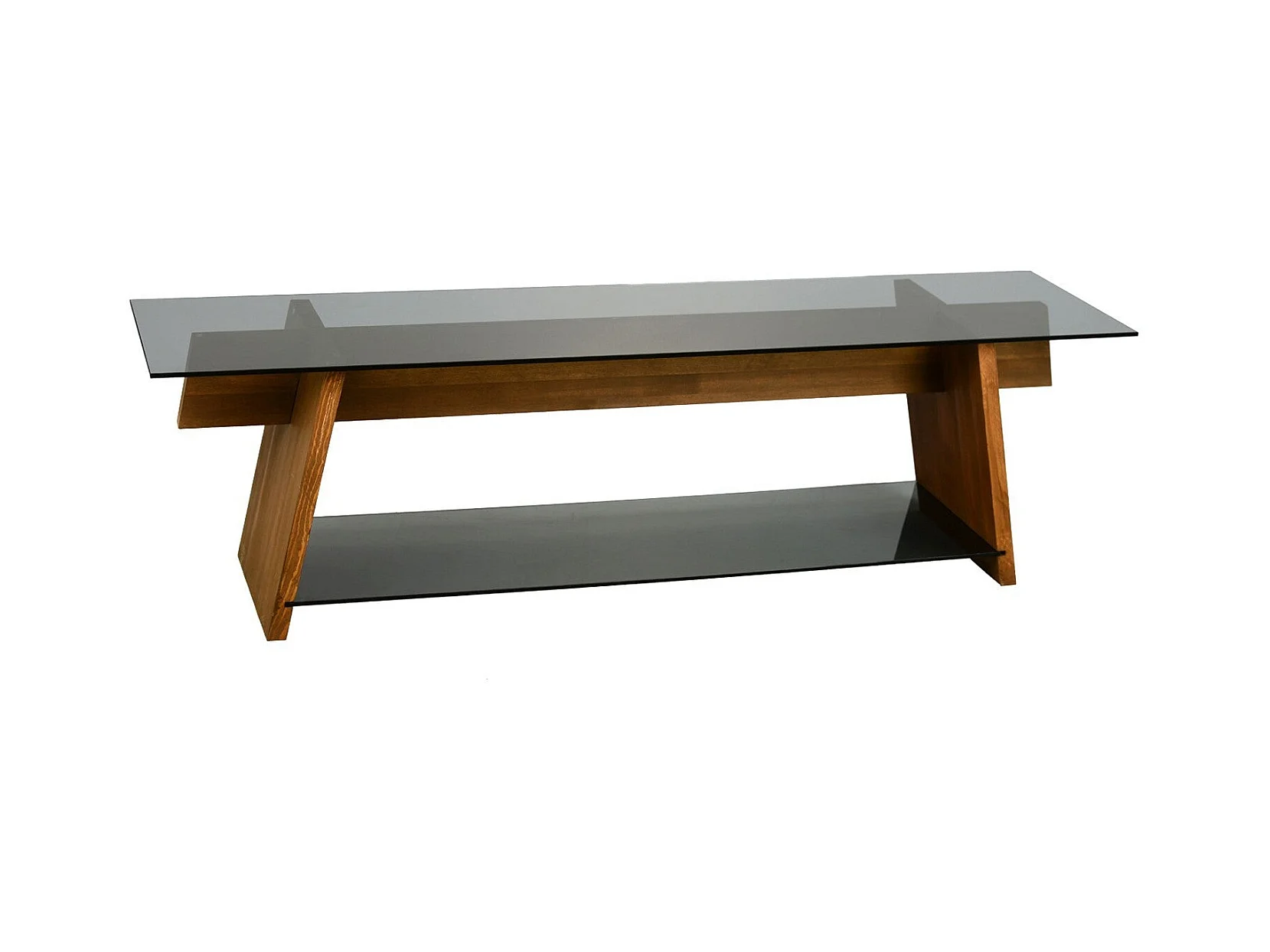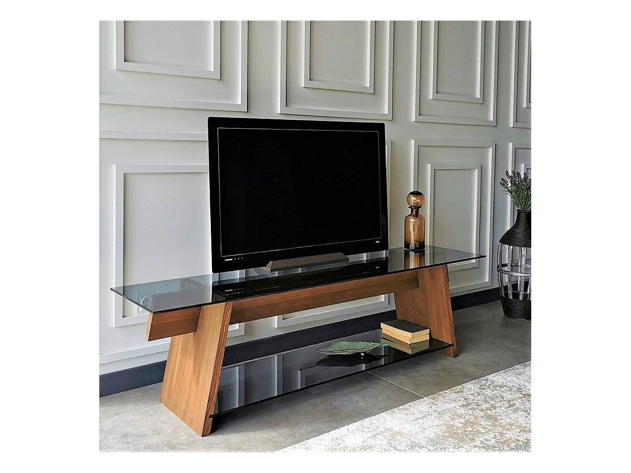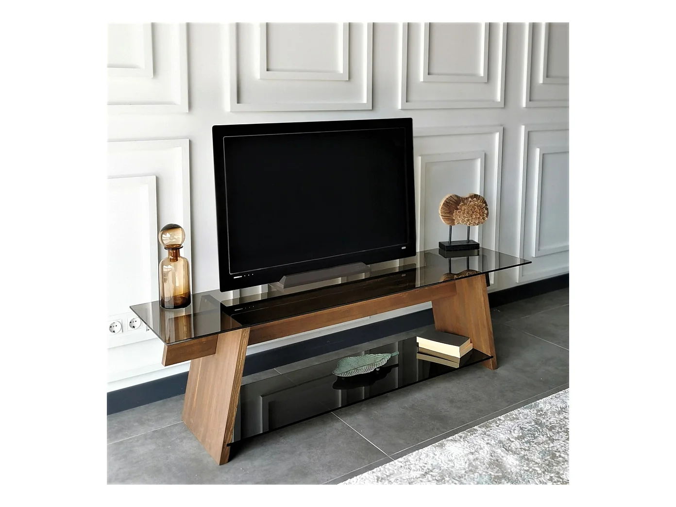 Meuble TV trapèze 2 tablettes Trappy 158x45x35cm Bois massif Verre trempé Naturel Fumé Noir
