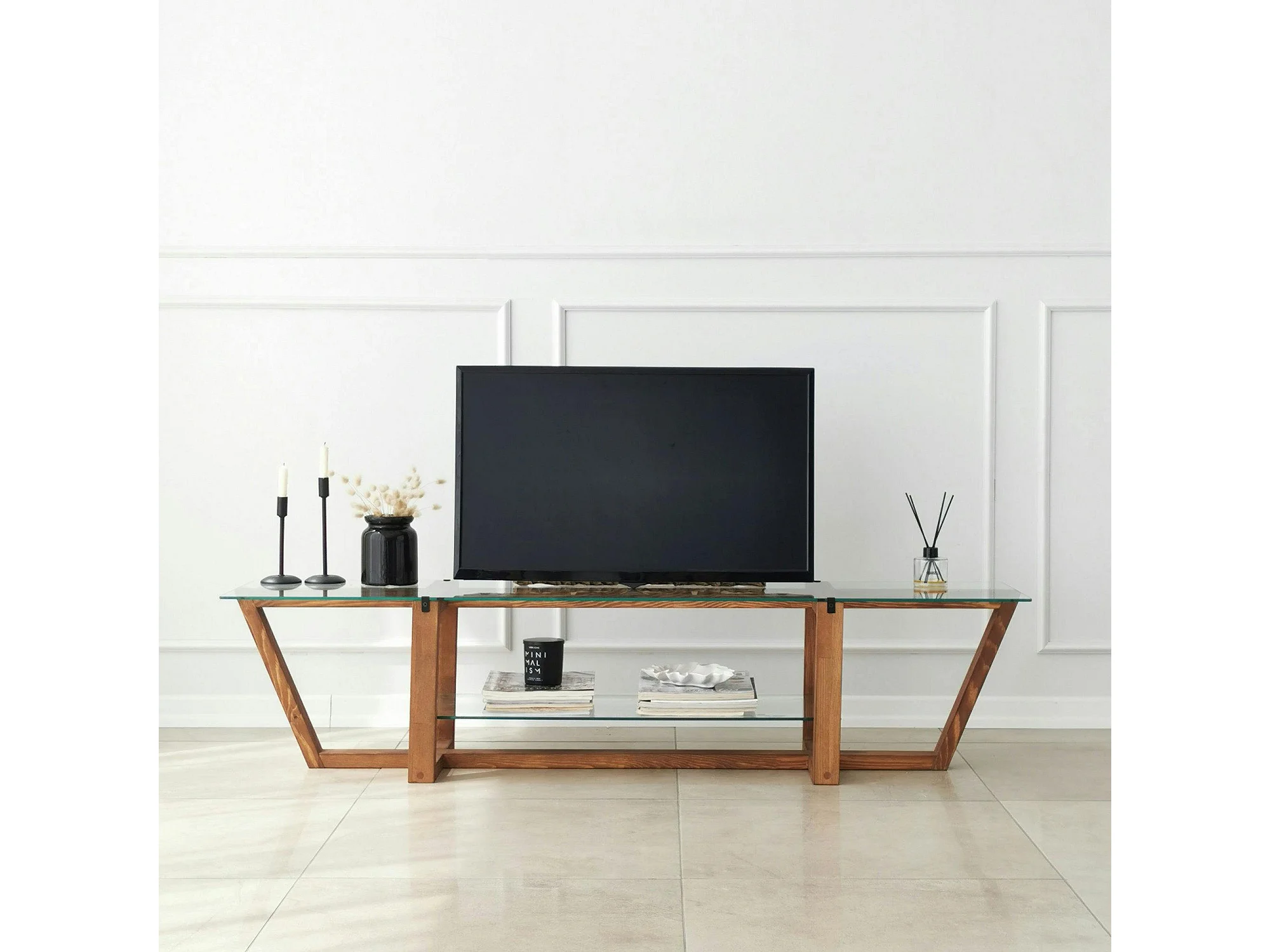 Meuble TV verre trempé bois foncé - 158 cm 2 niveaux LHASA