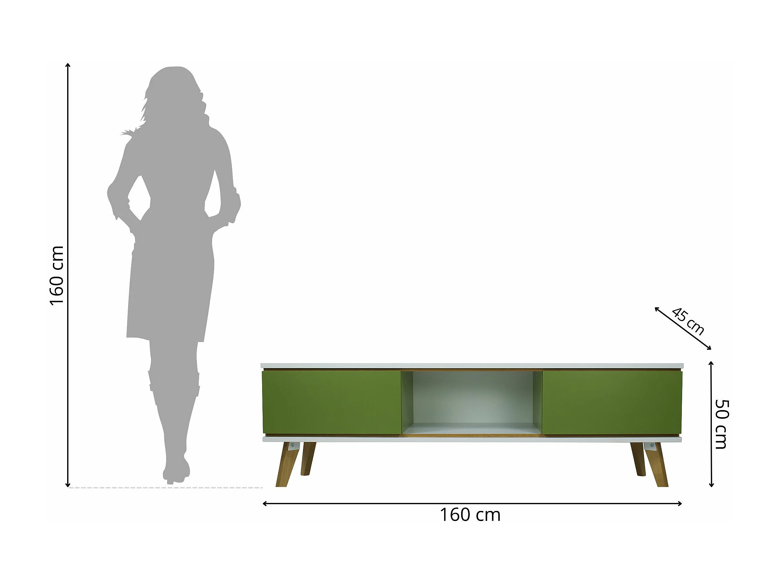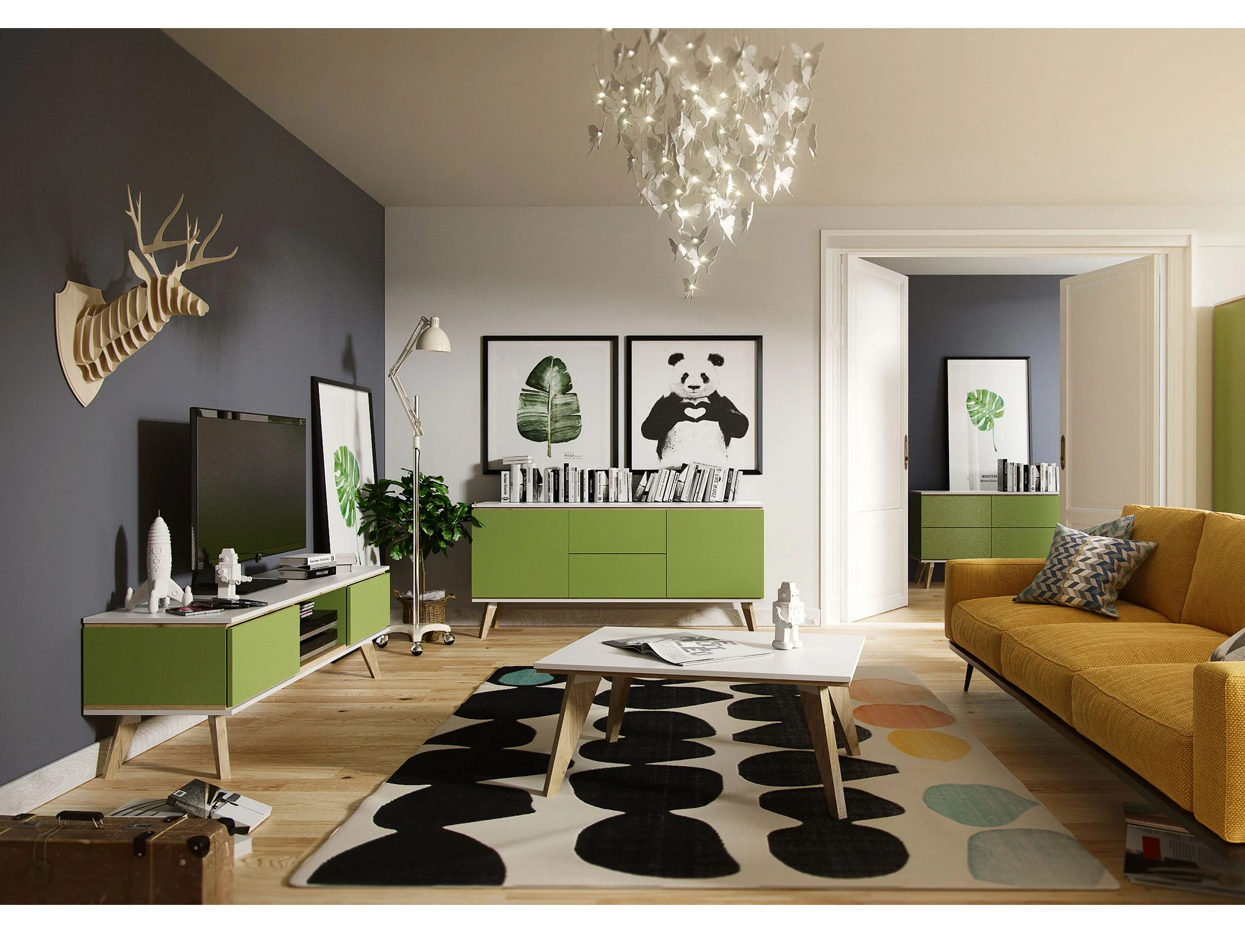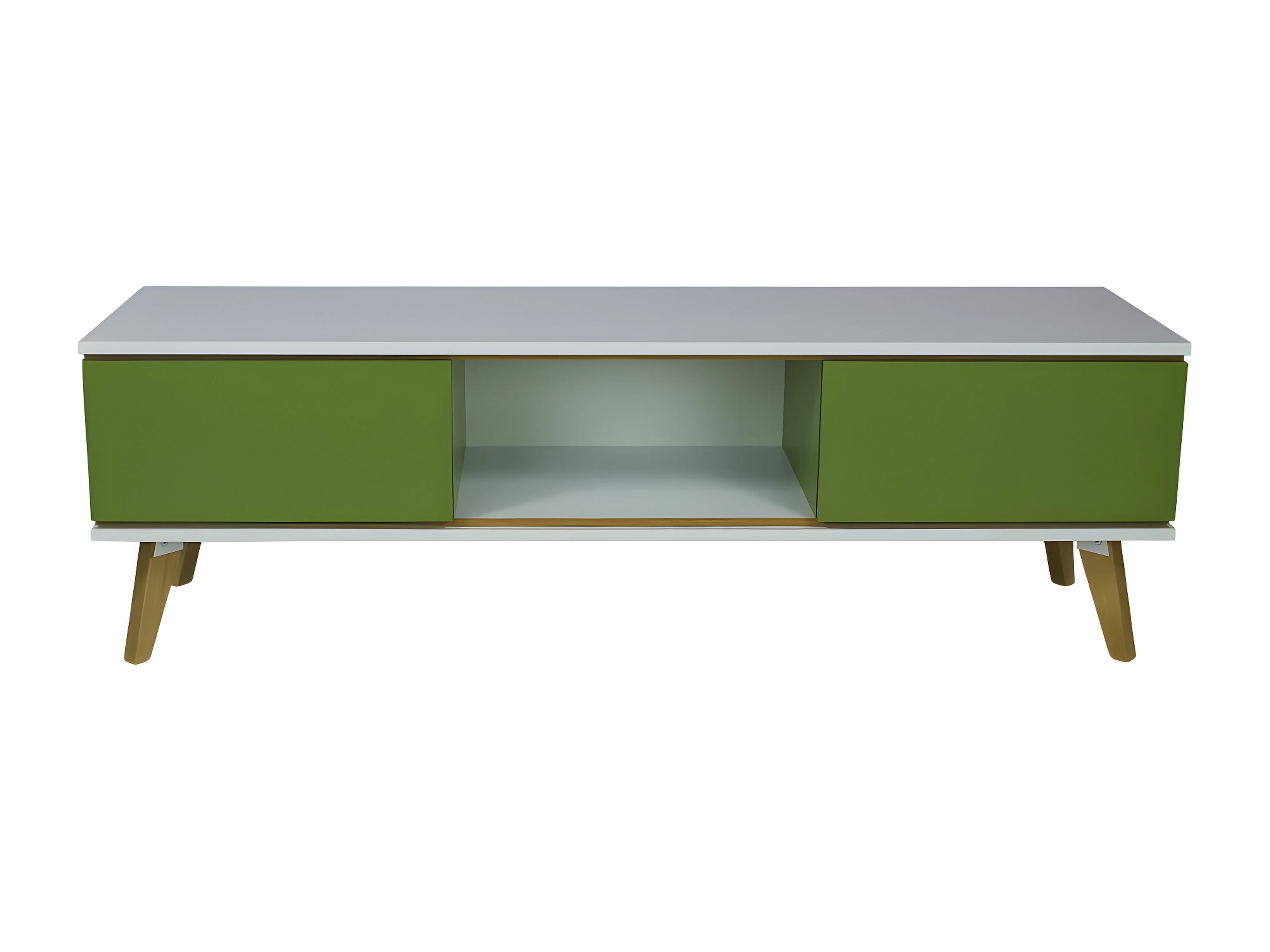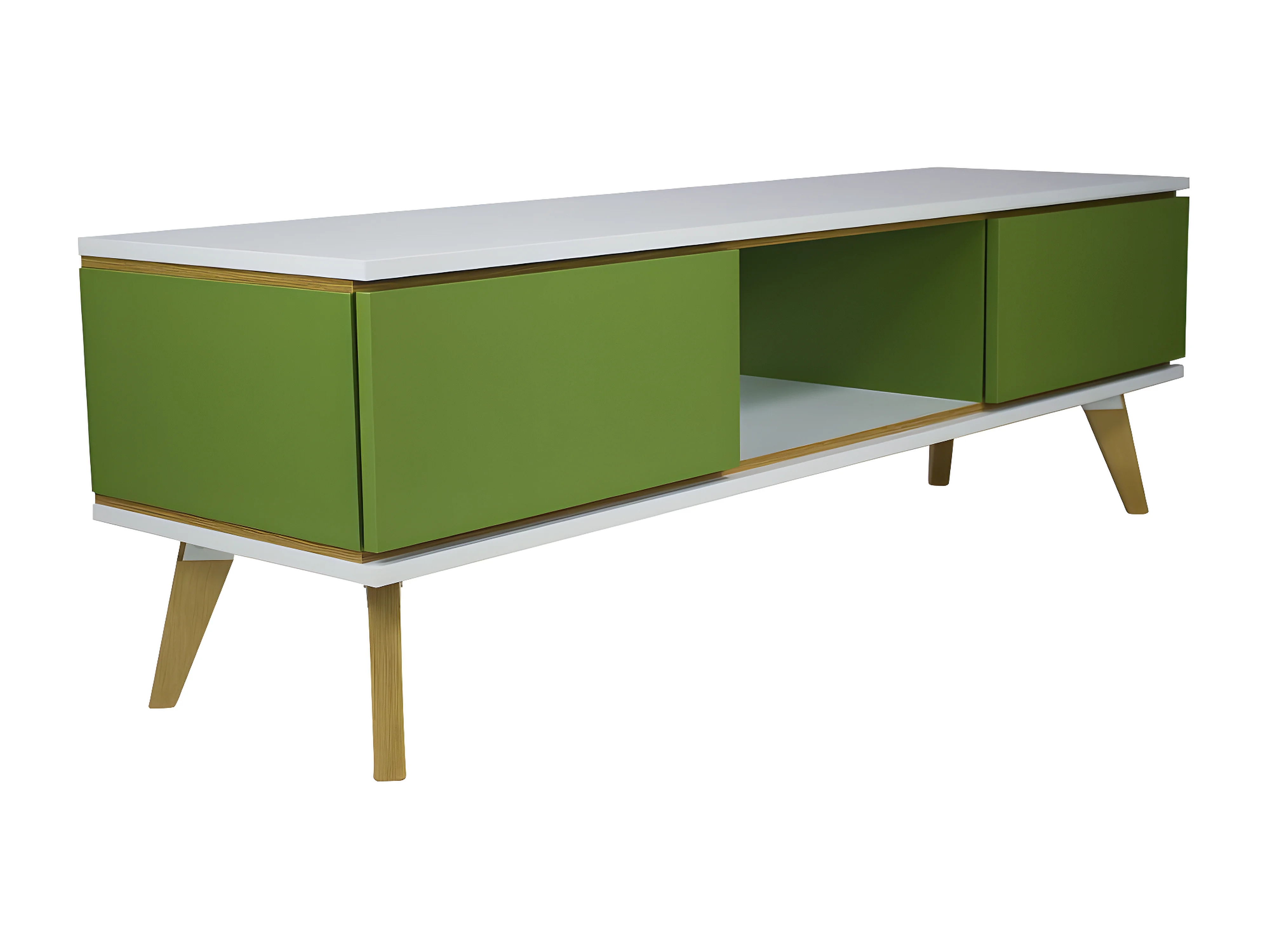 Meuble TV vert JORGEN sur pieds en chêne avec deux tiroirs
