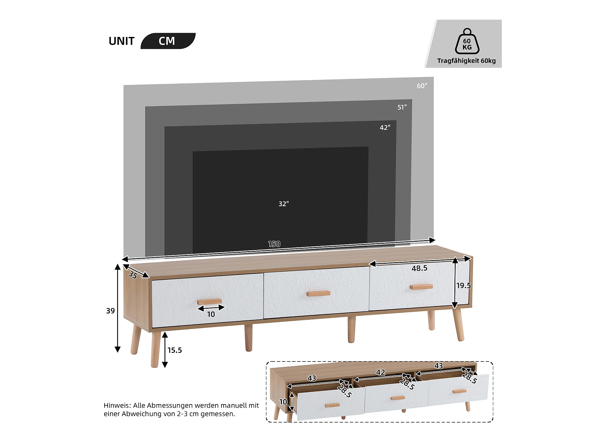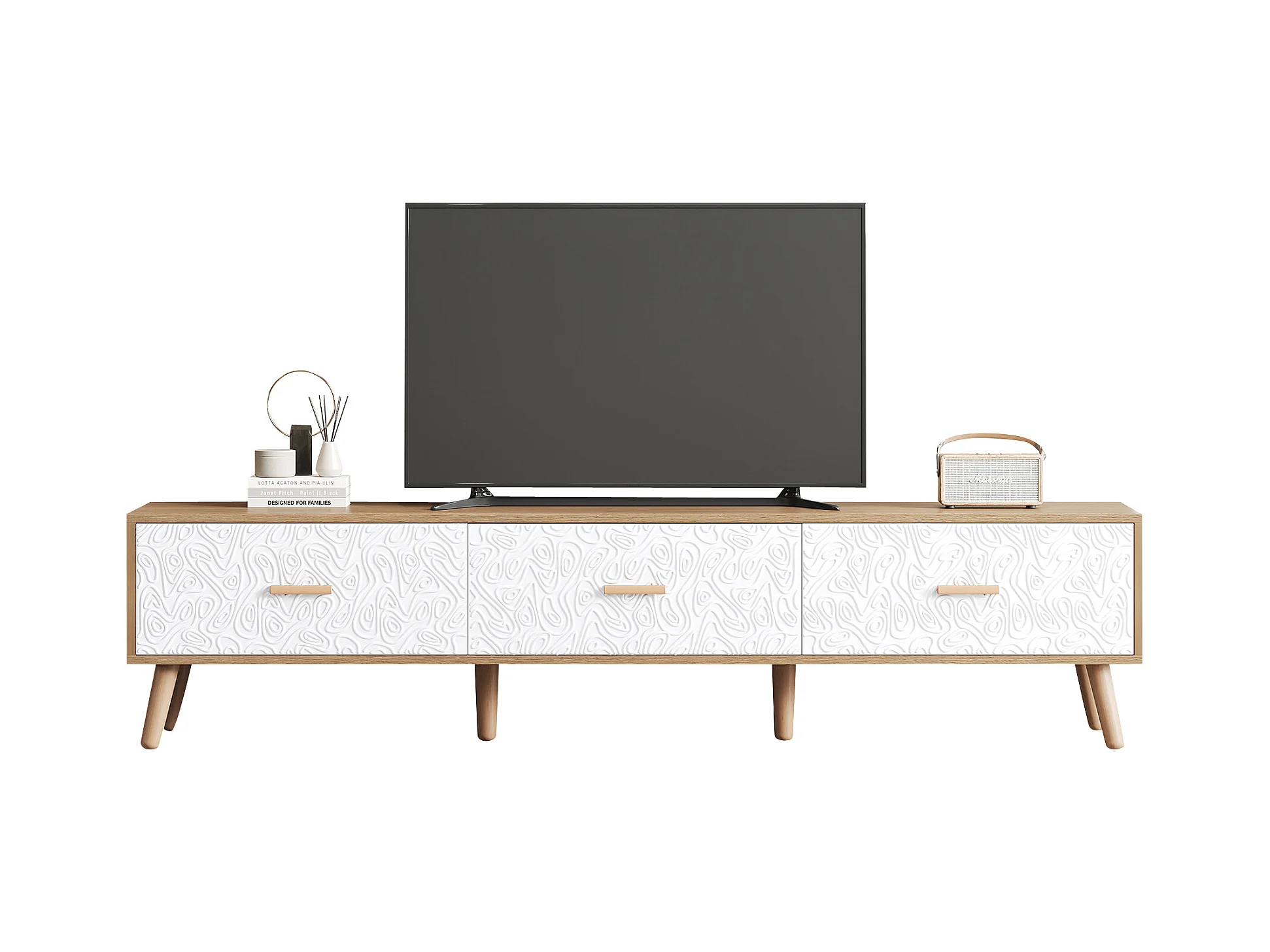 Meuble TV Vintage en Bois – Buffet Bas 150 cm avec Portes Texturées Blanches et 3 Tiroirs – Style Rétro Scandinave, Idéal pour Salon, Chambre, Bureau